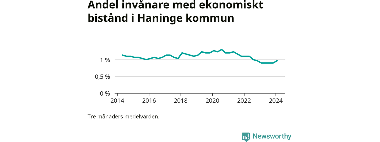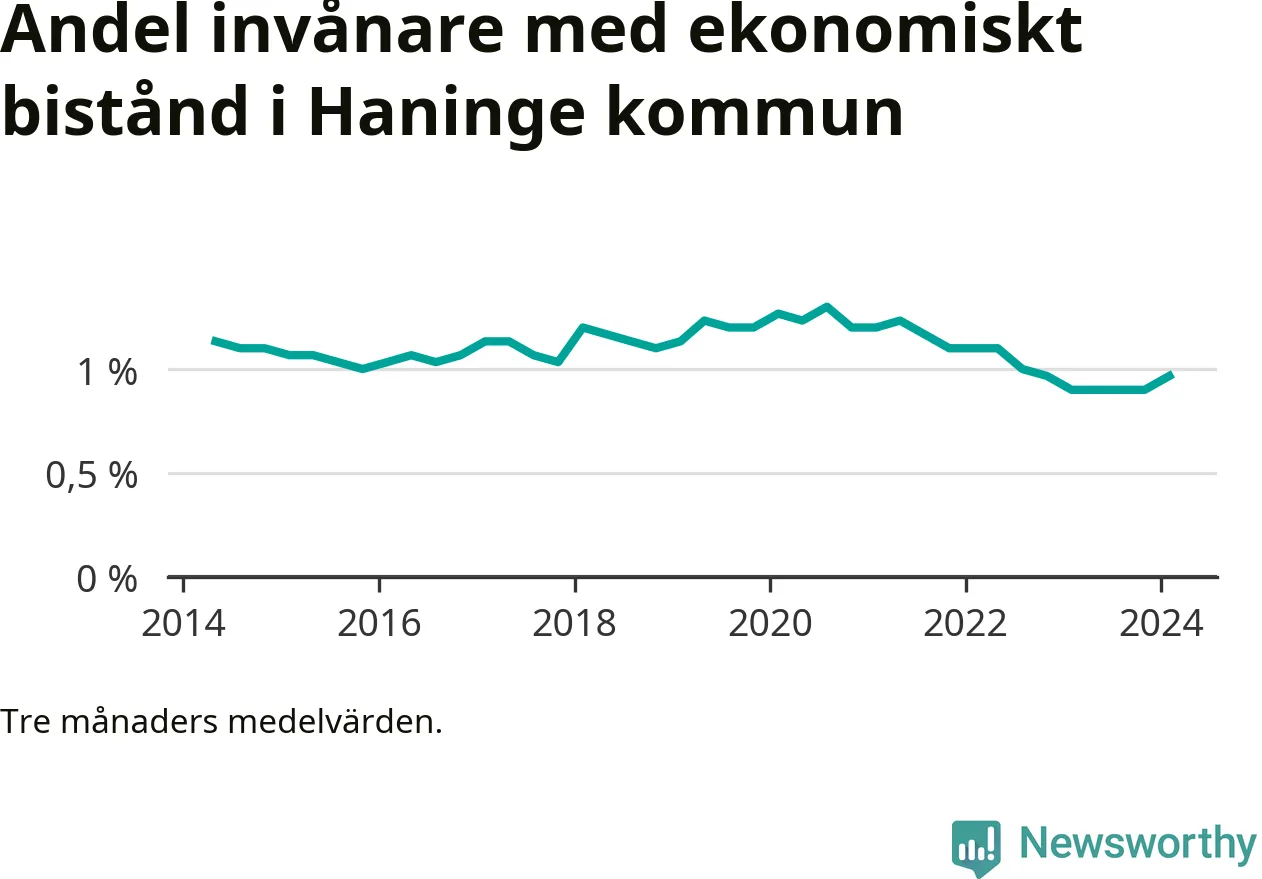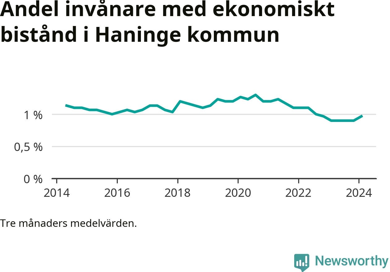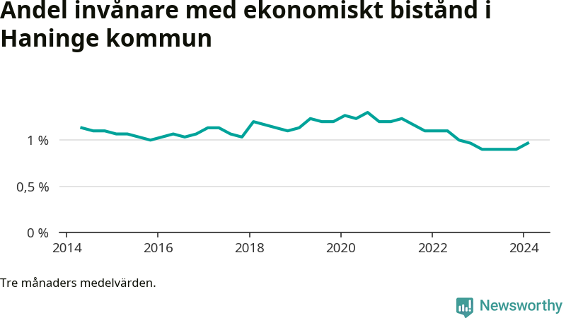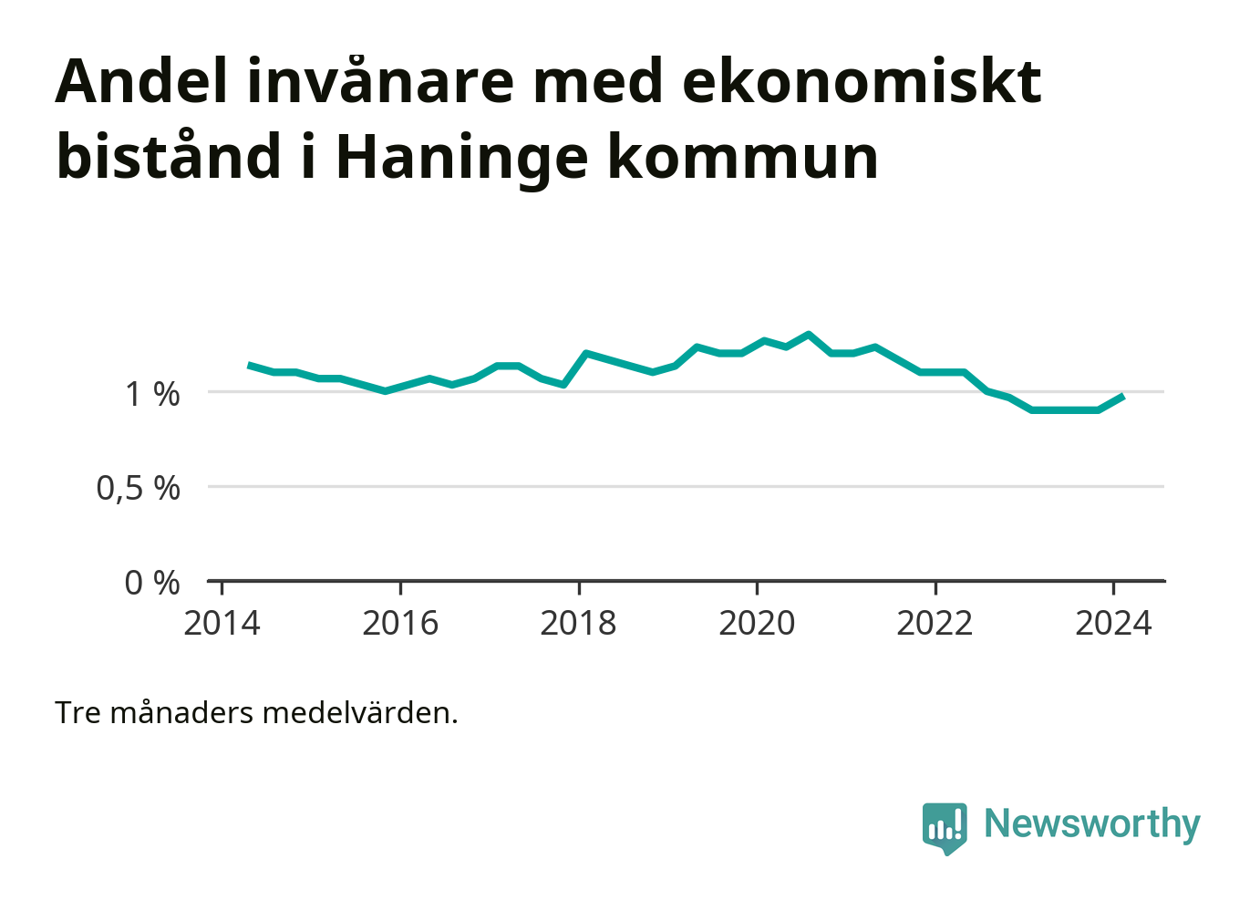 I genomsnitt 957 personer per månad fick ekonomiskt bistånd i Haninge kommun under vintermånaderna (december till februari), vilket motsvarar 1,0 procent av den vuxna befolkningen. Det är marginellt mer än i höstas, och något större andel än under vintern för ett år sedan.