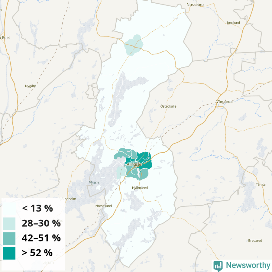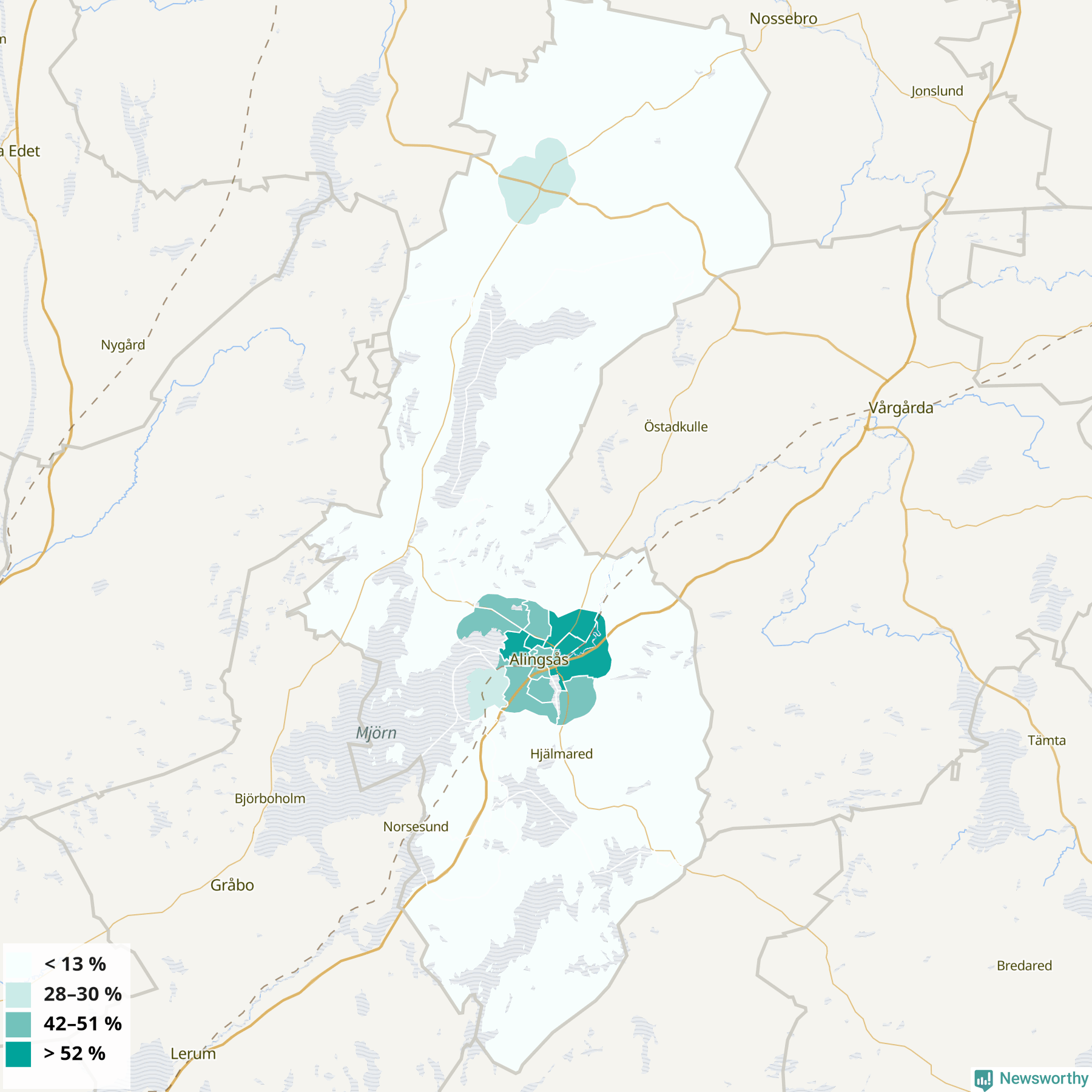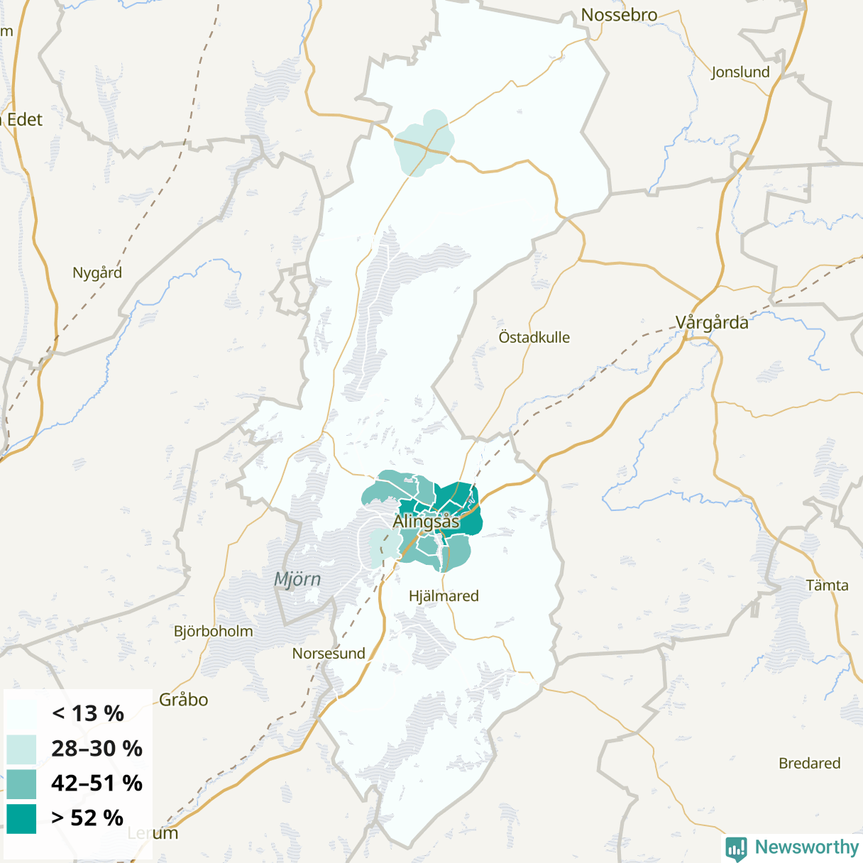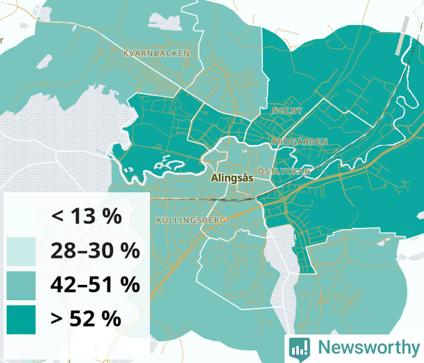 | Alingsås | 35 % | 41 % | 29 % | Noltorp (59 %) |