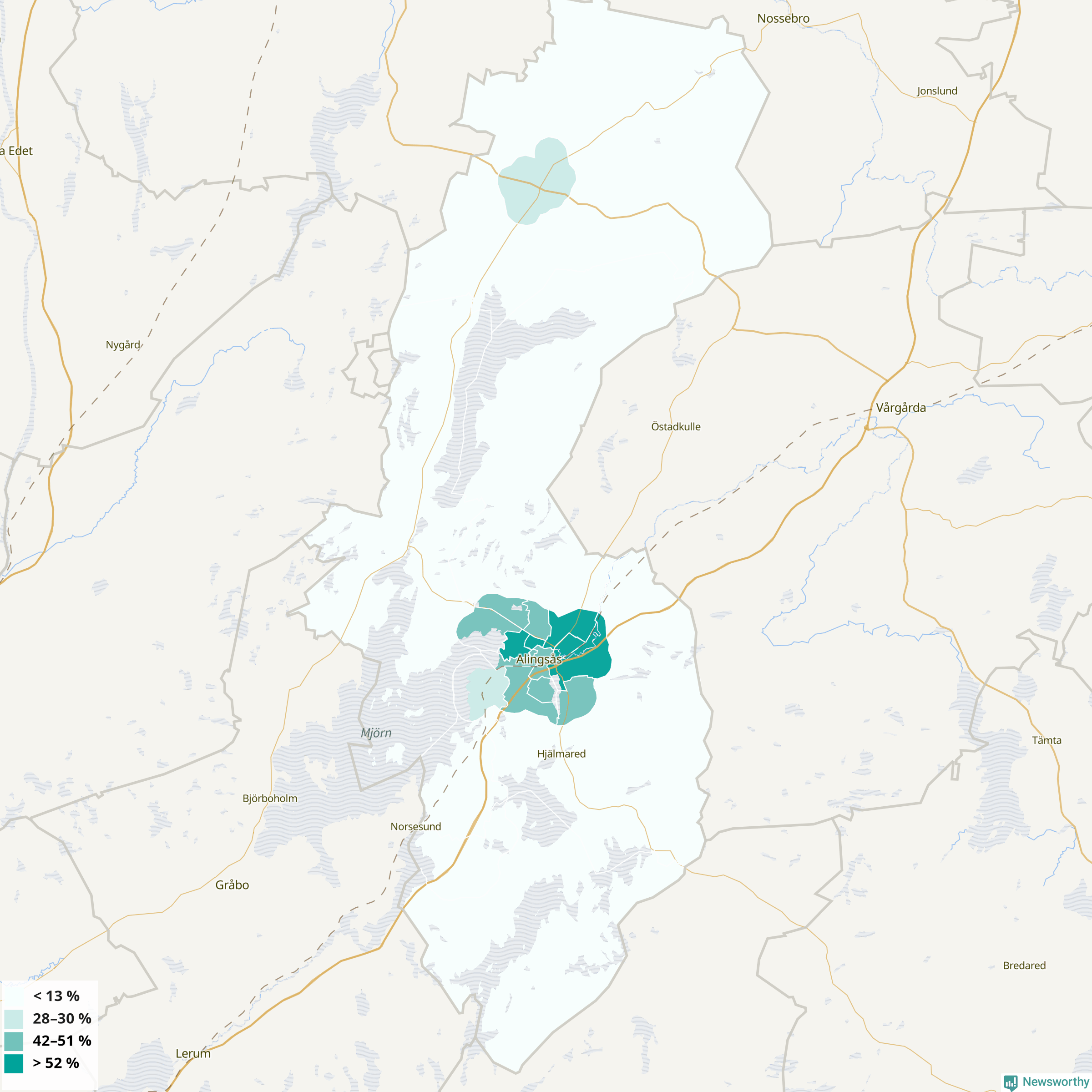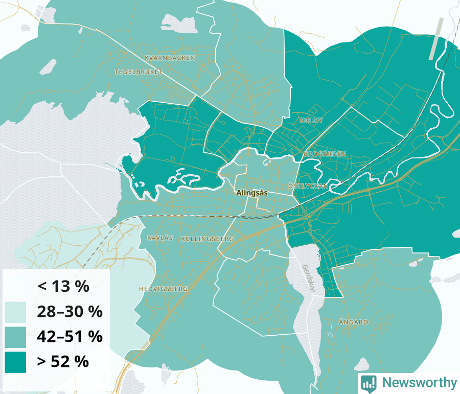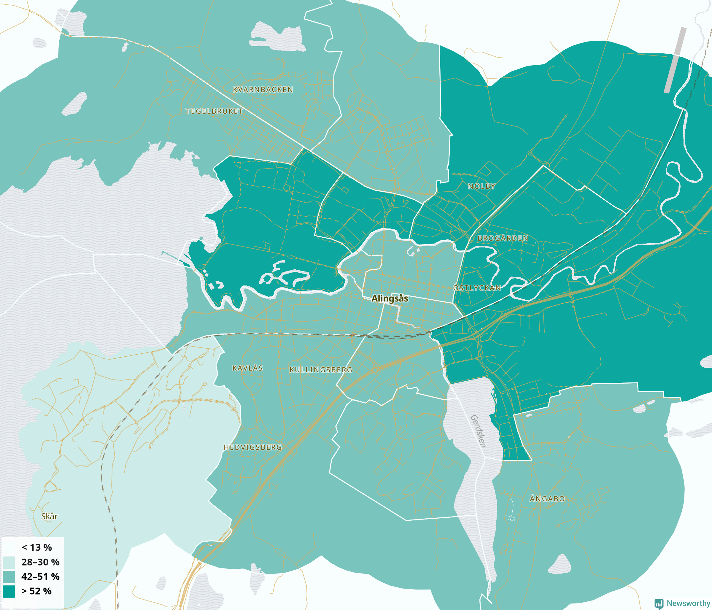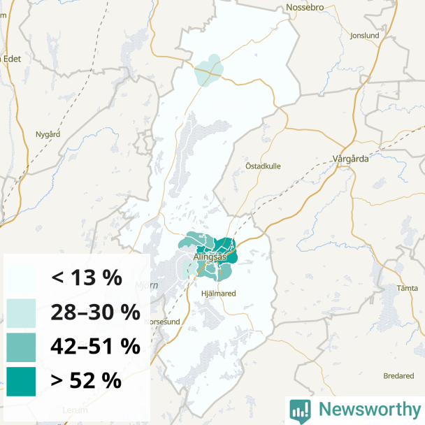 | Alingsås | 35 % | 41 % | 29 % | Noltorp (59 %) |