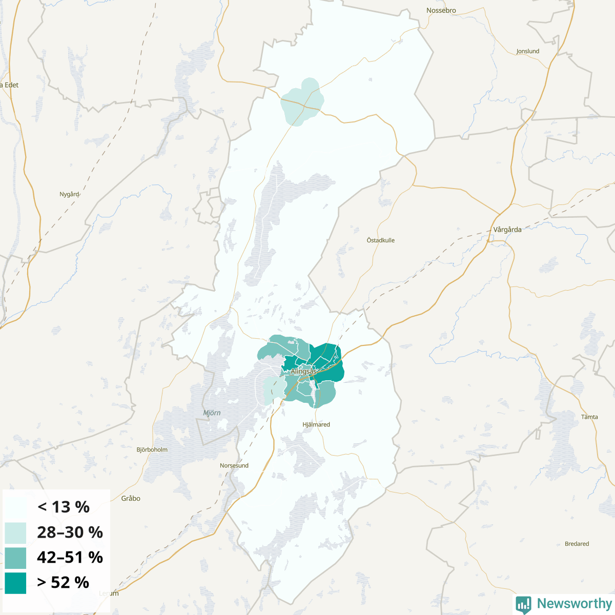 | Herrljunga | 26 % | 27 % | 25 % | Herrljunga tätort södra (46 %) |
