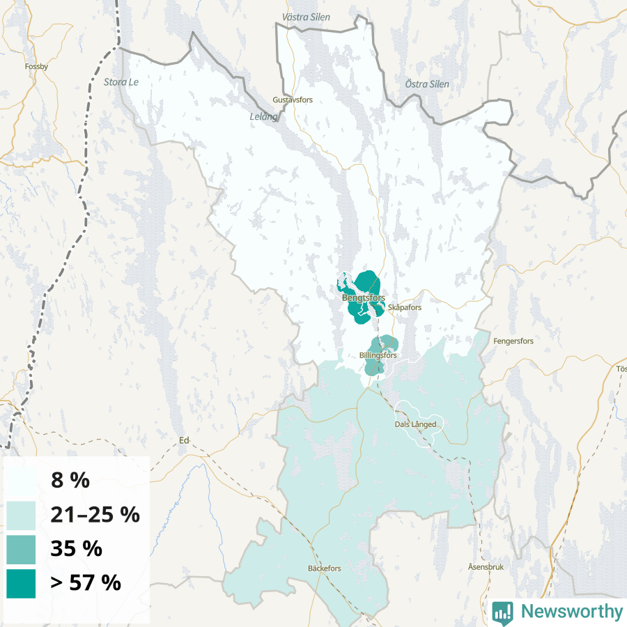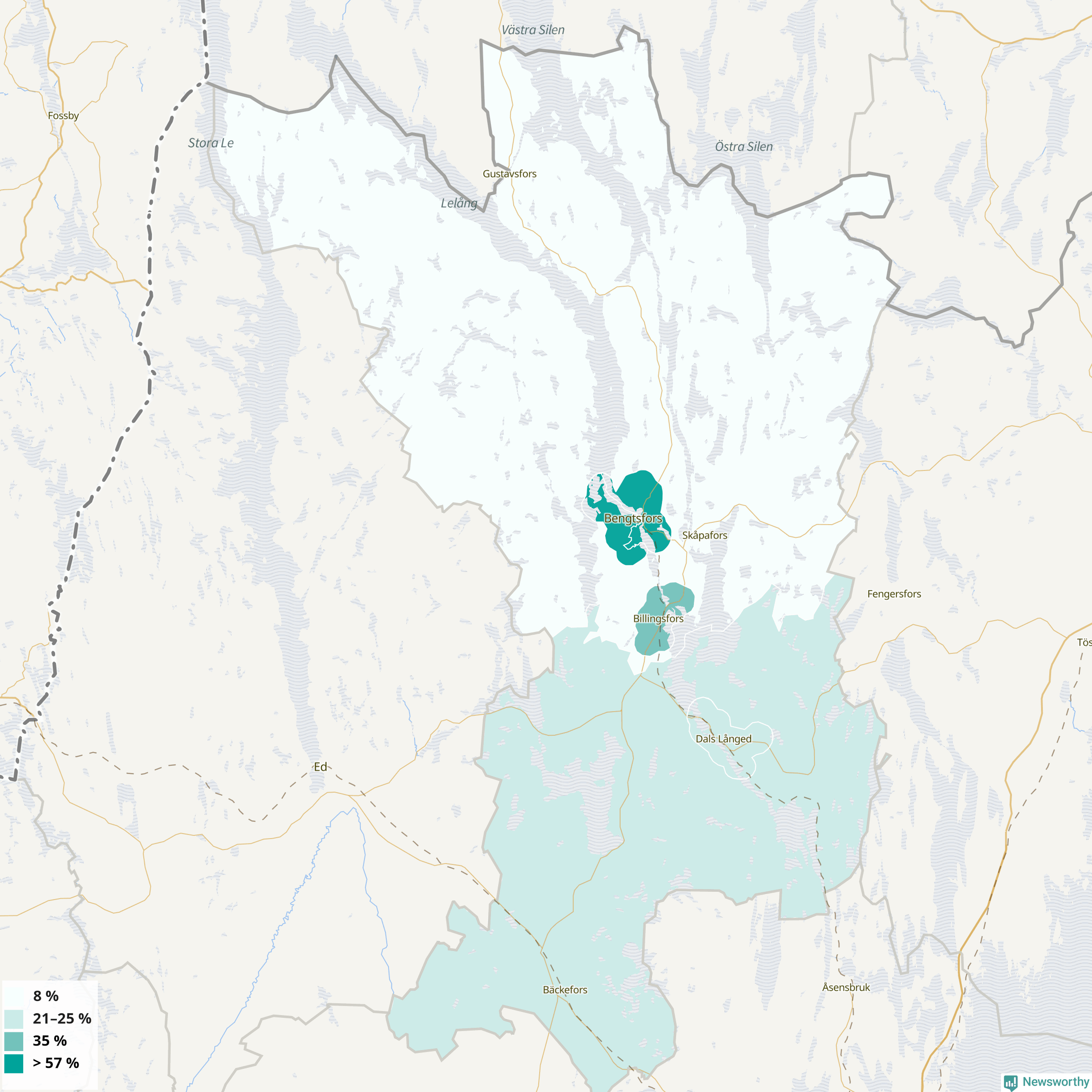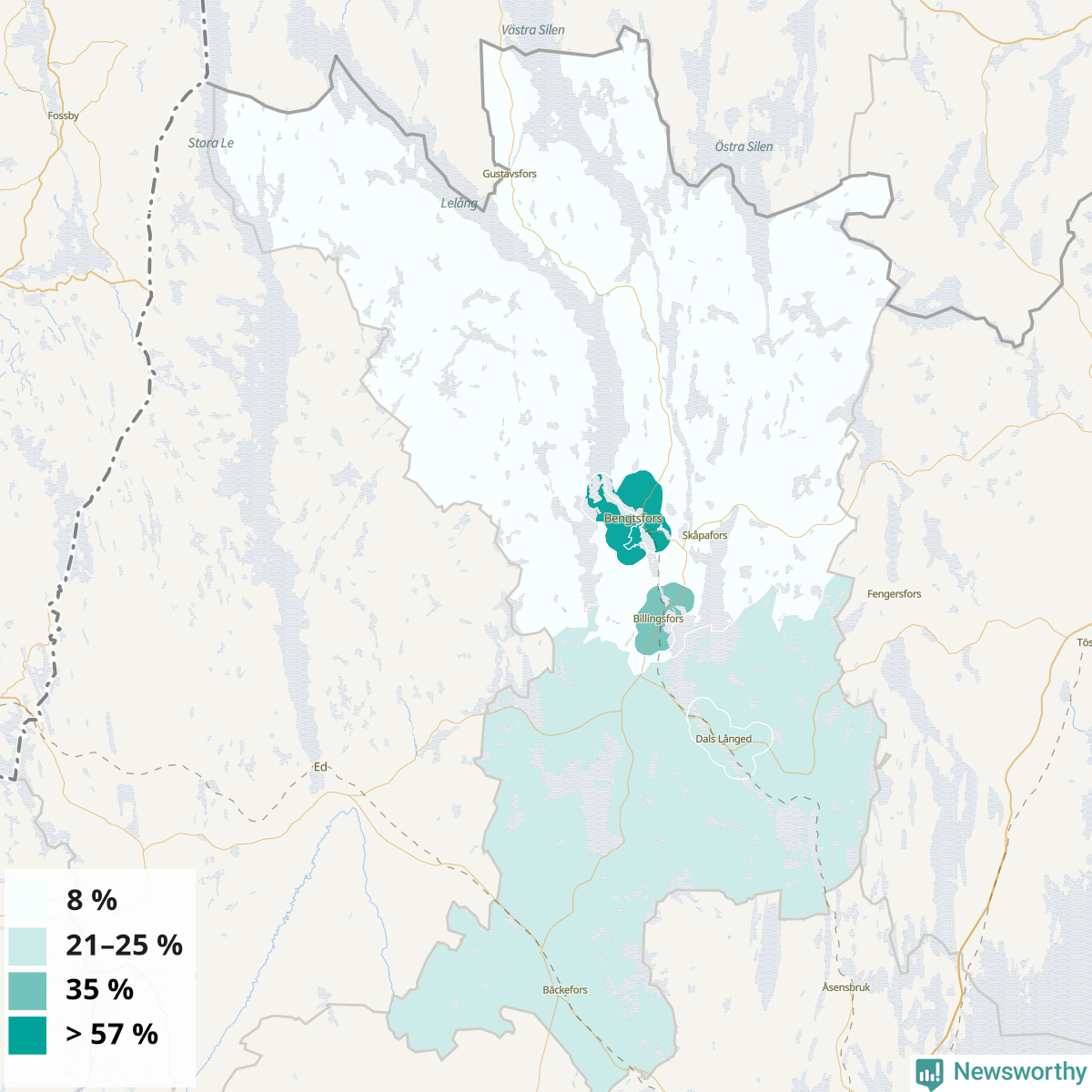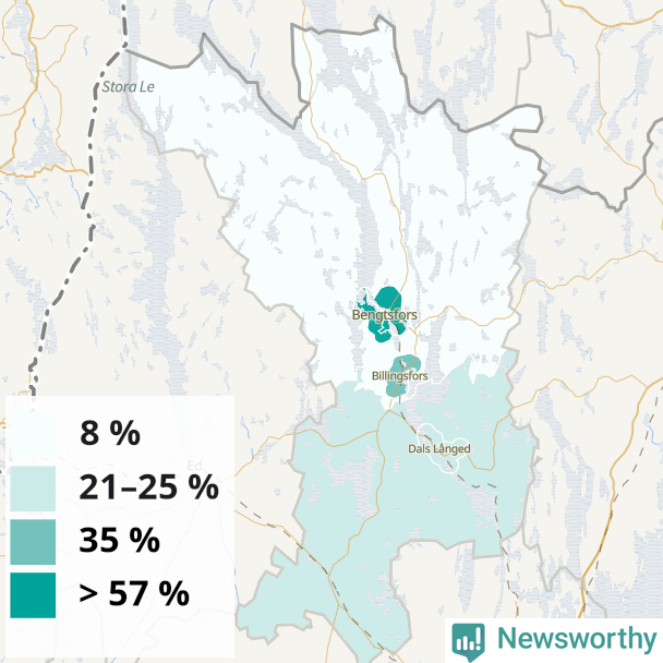 | Färgelanda | 25 % | 28 % | 23 % | Färgelanda norra tätort (43 %) |