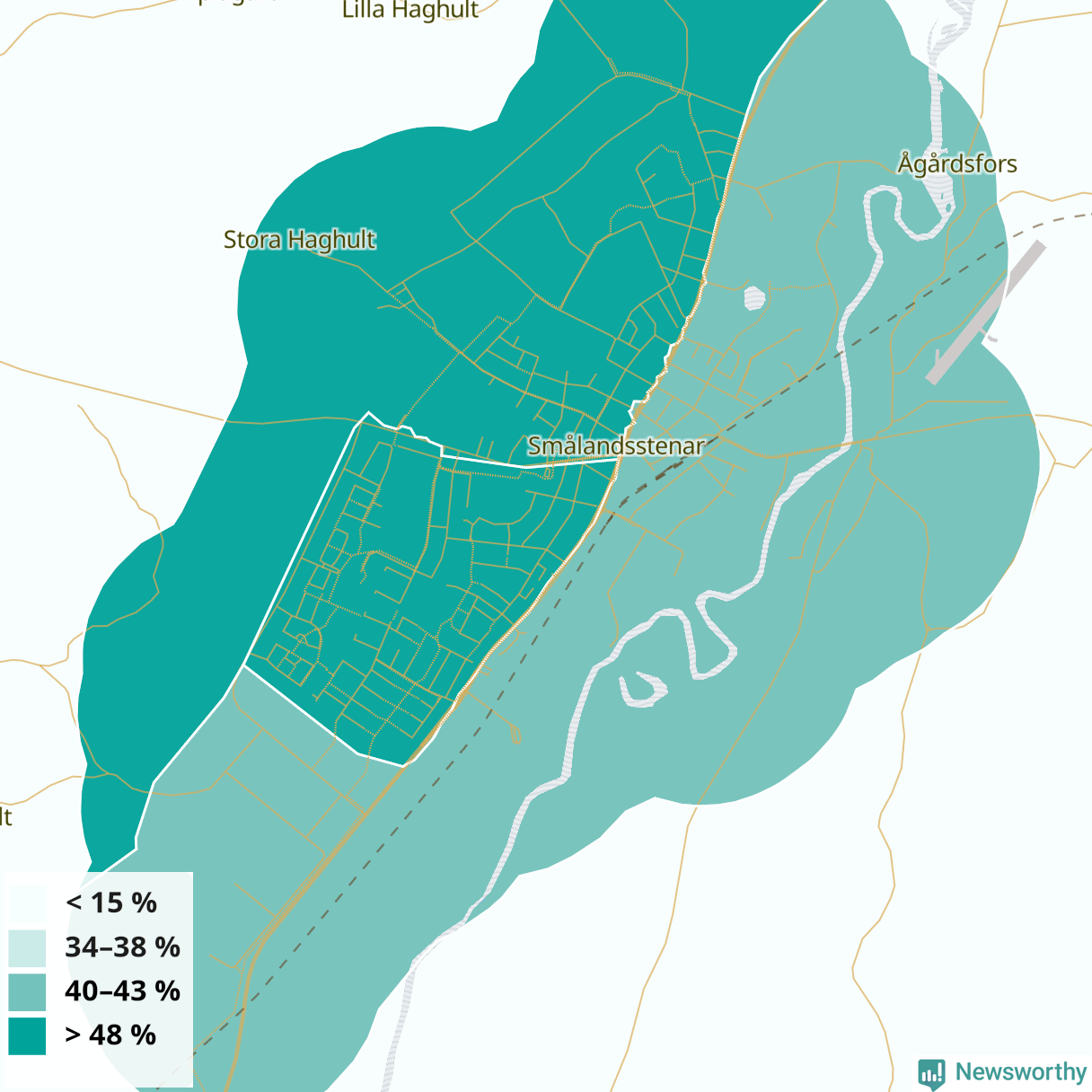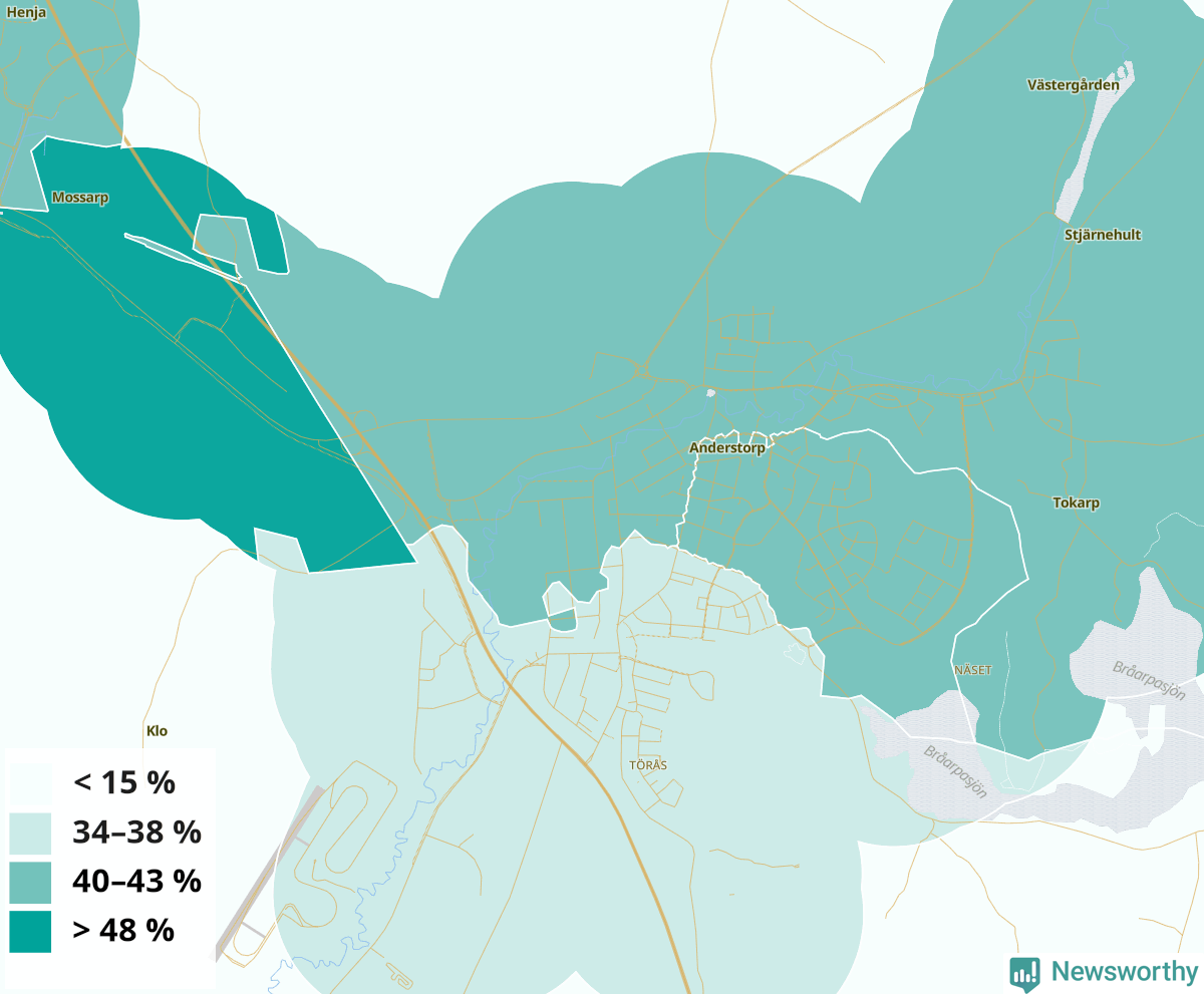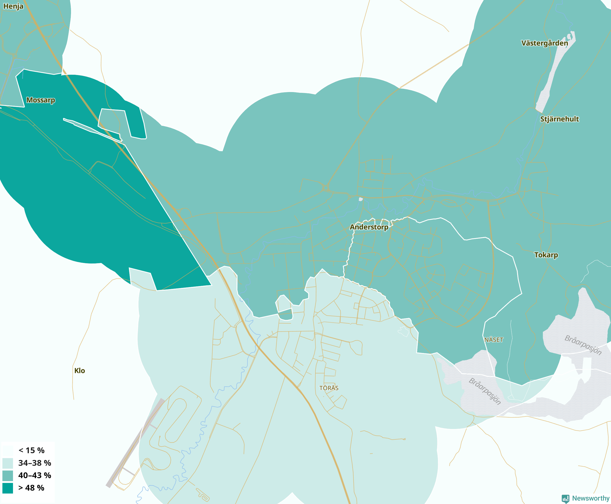 | Aneby | 20 % | 25 % | 15 % | Aneby nordvästra (35 %) |