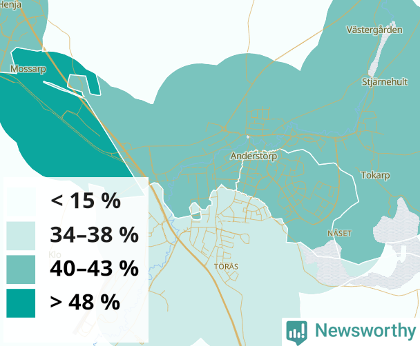 | Värnamo | 47 % | 52 % | 43 % | Delar av Gröndal-Norregård (73 %) |
