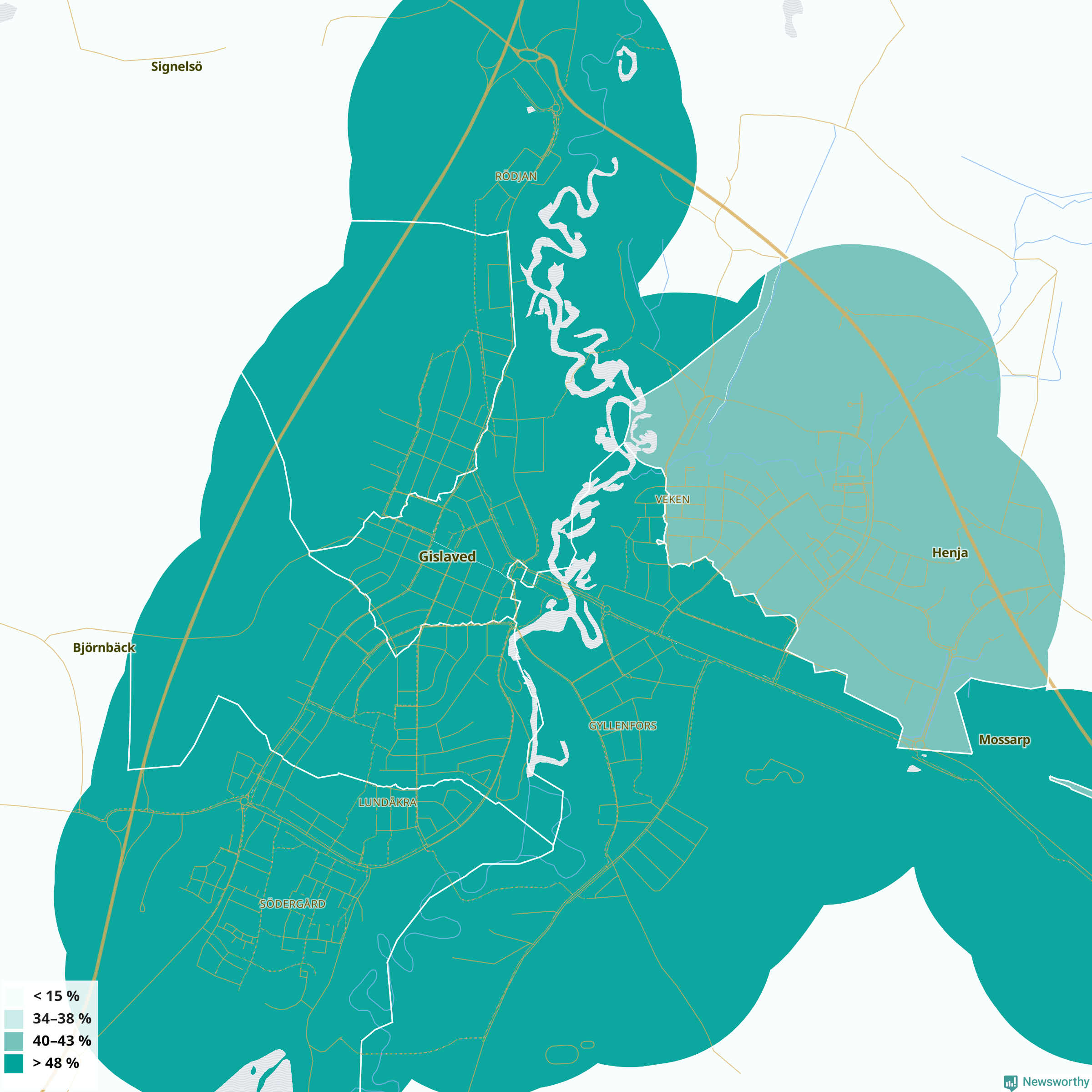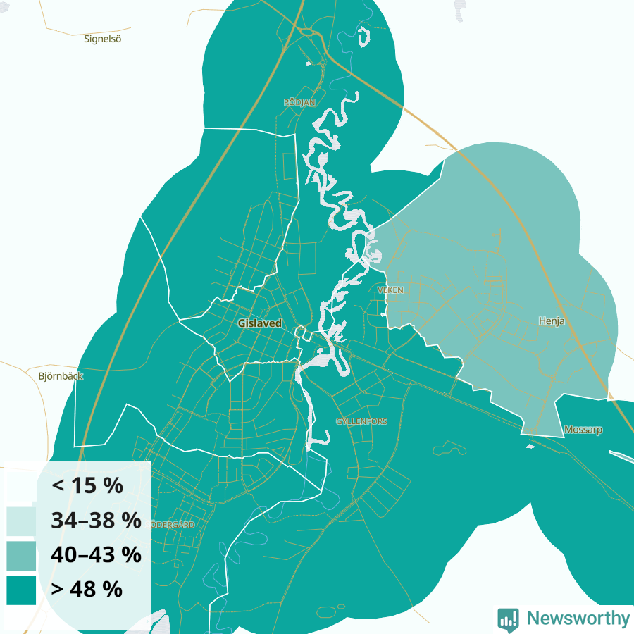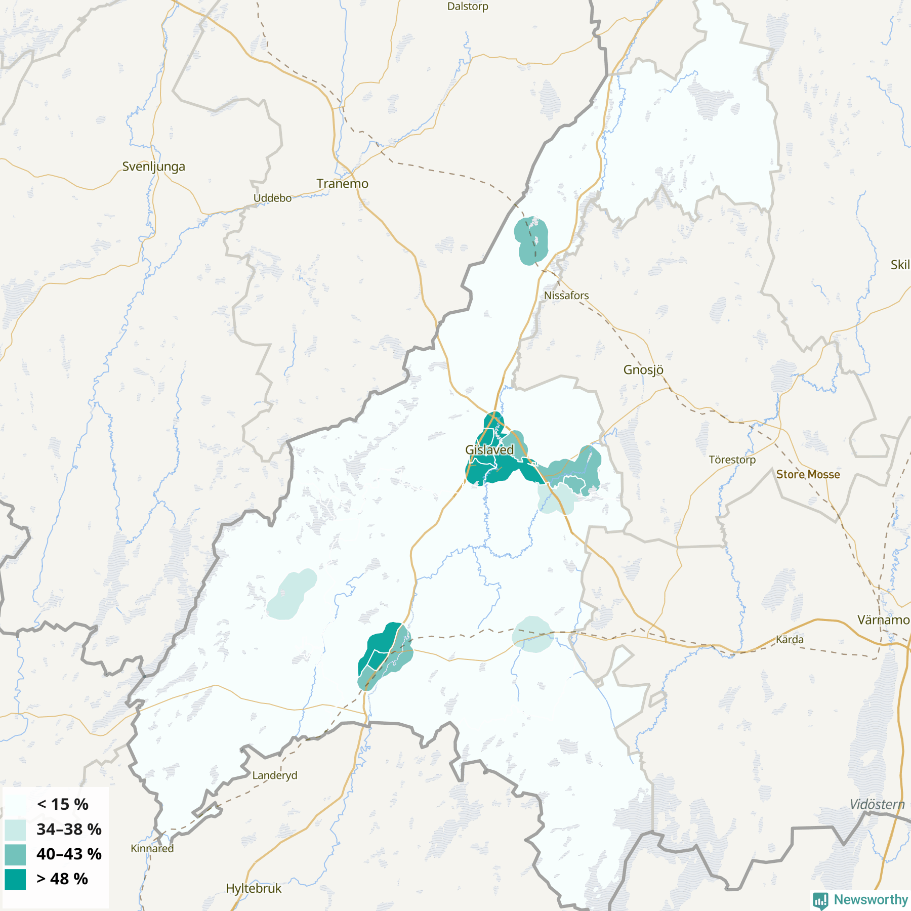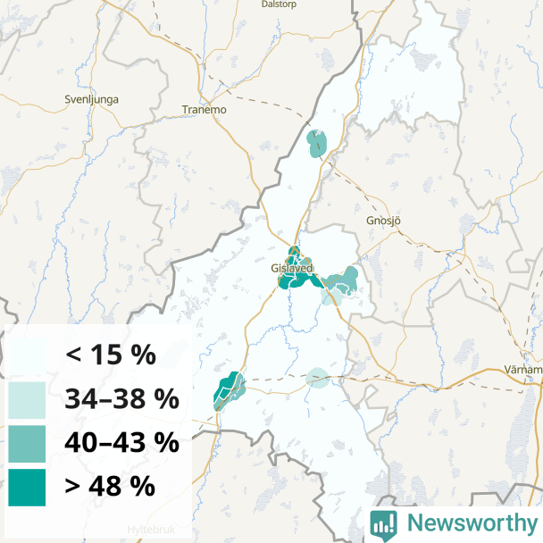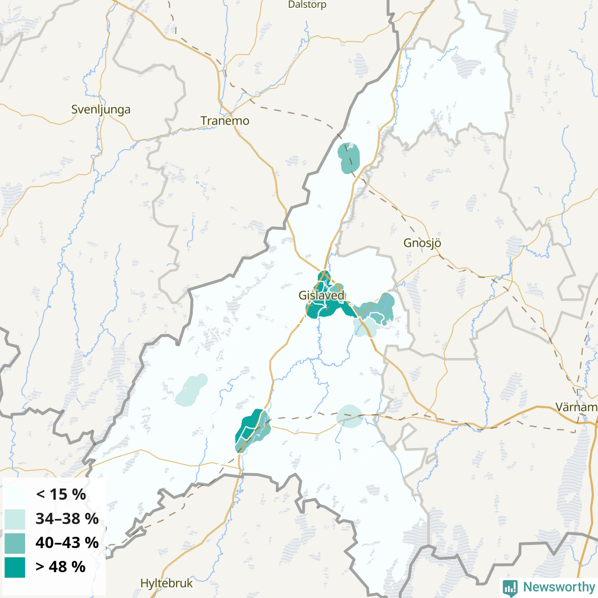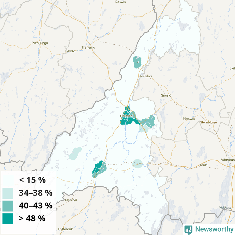 | Gislaved | 39 % | 40 % | 38 % | Smålandsstenar västra (57 %) |