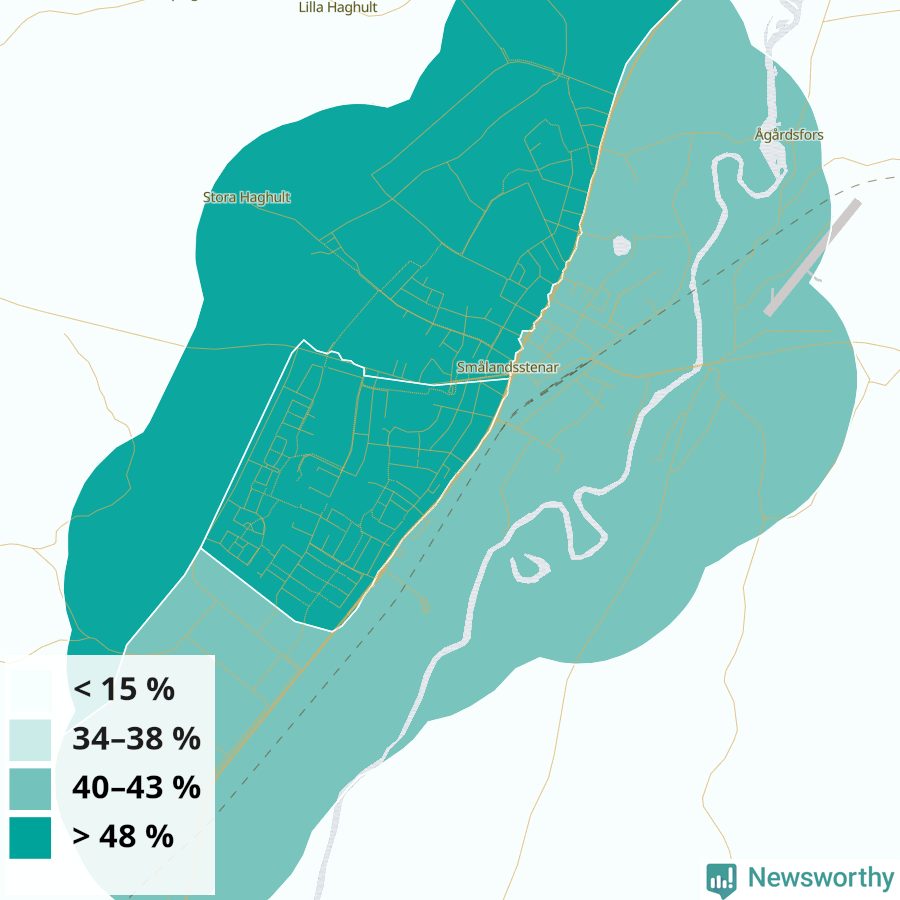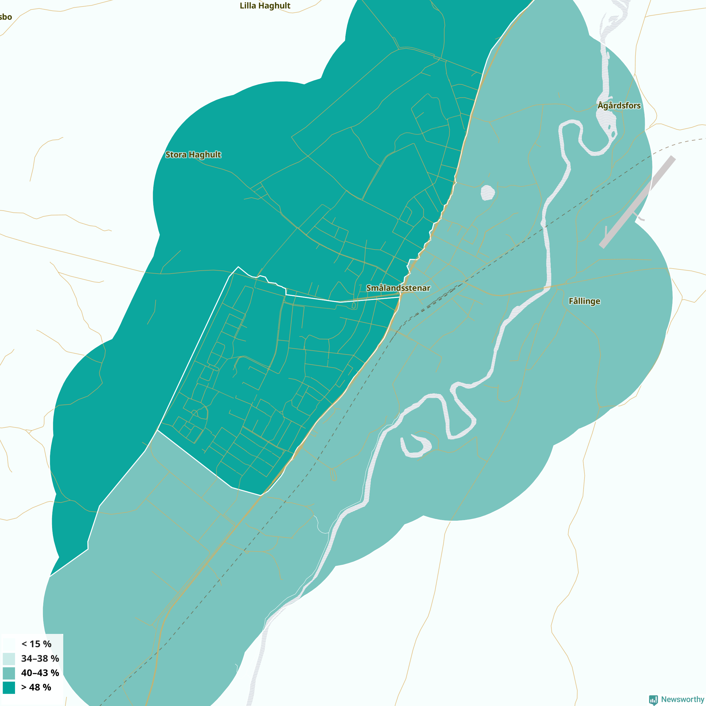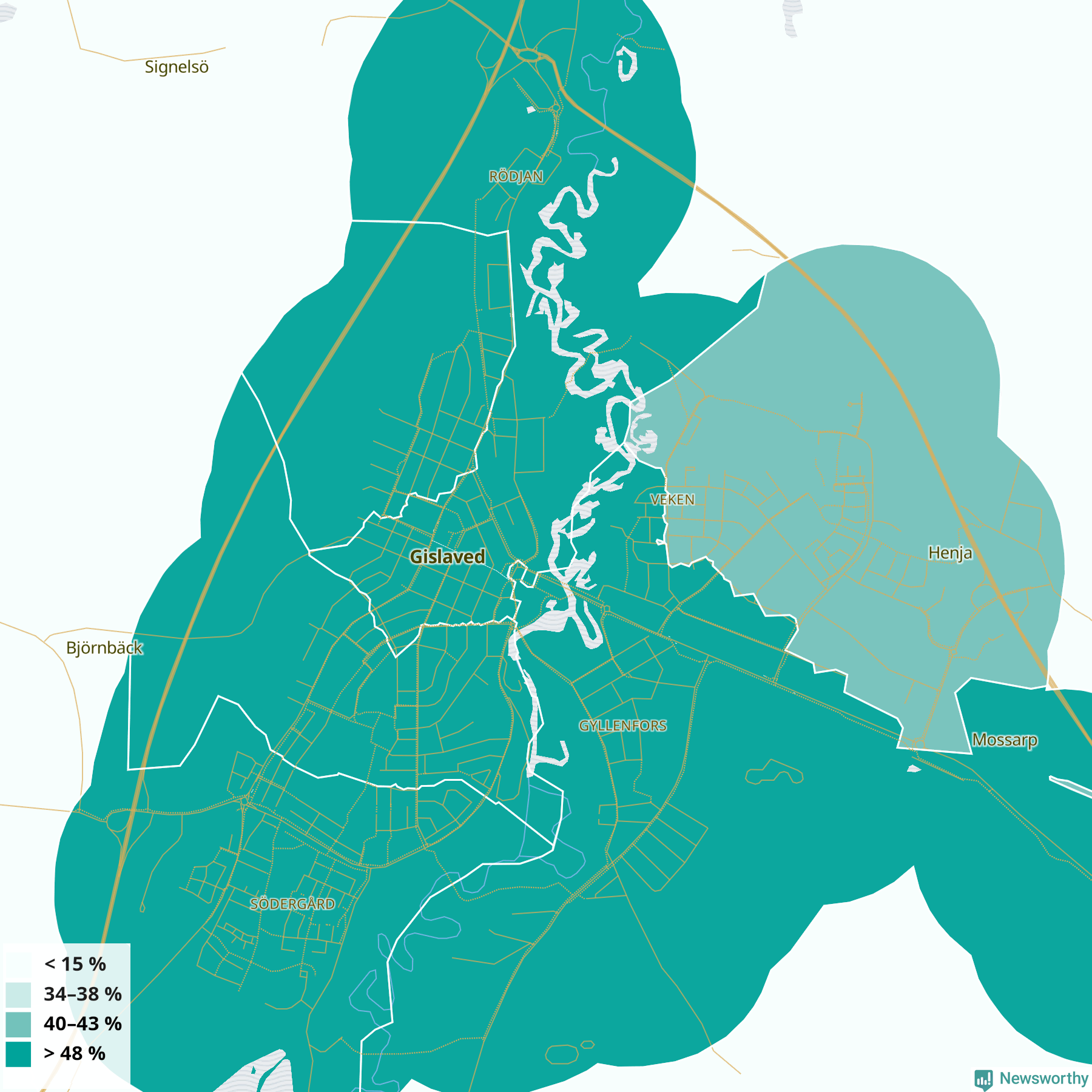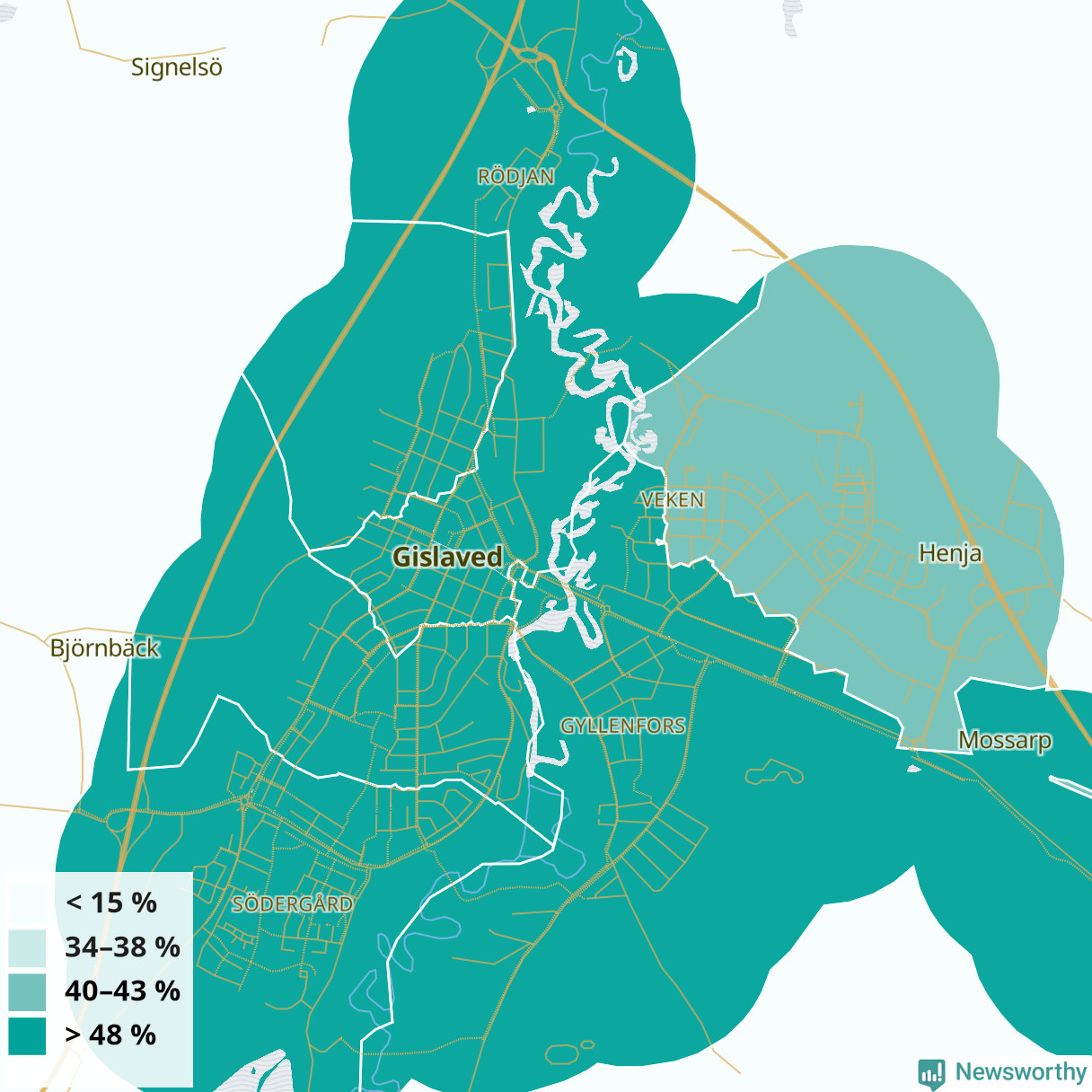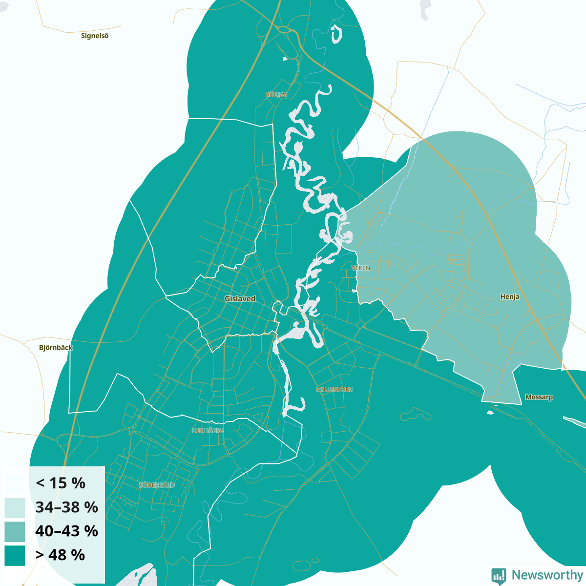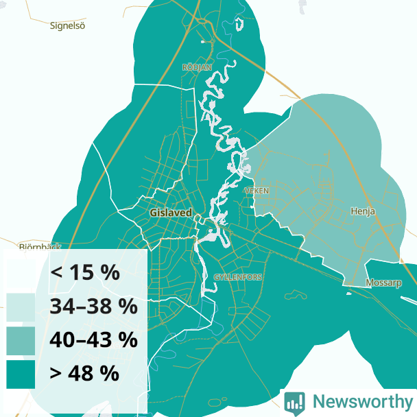 | Gislaved | 39 % | 40 % | 38 % | Smålandsstenar västra (57 %) |