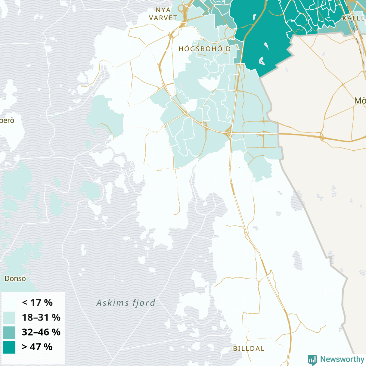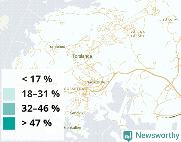 | Mölndal | 24 % | 27 % | 21 % | Delar av Toltorp (46 %) |