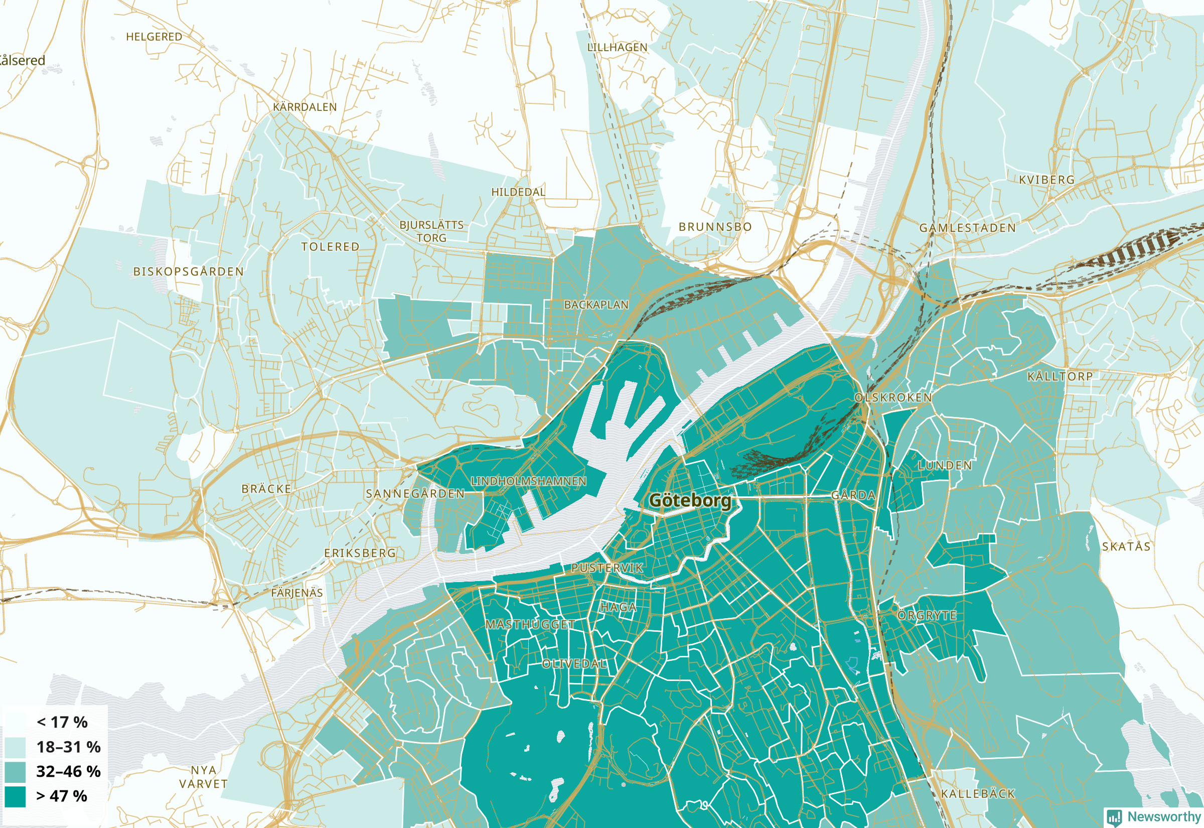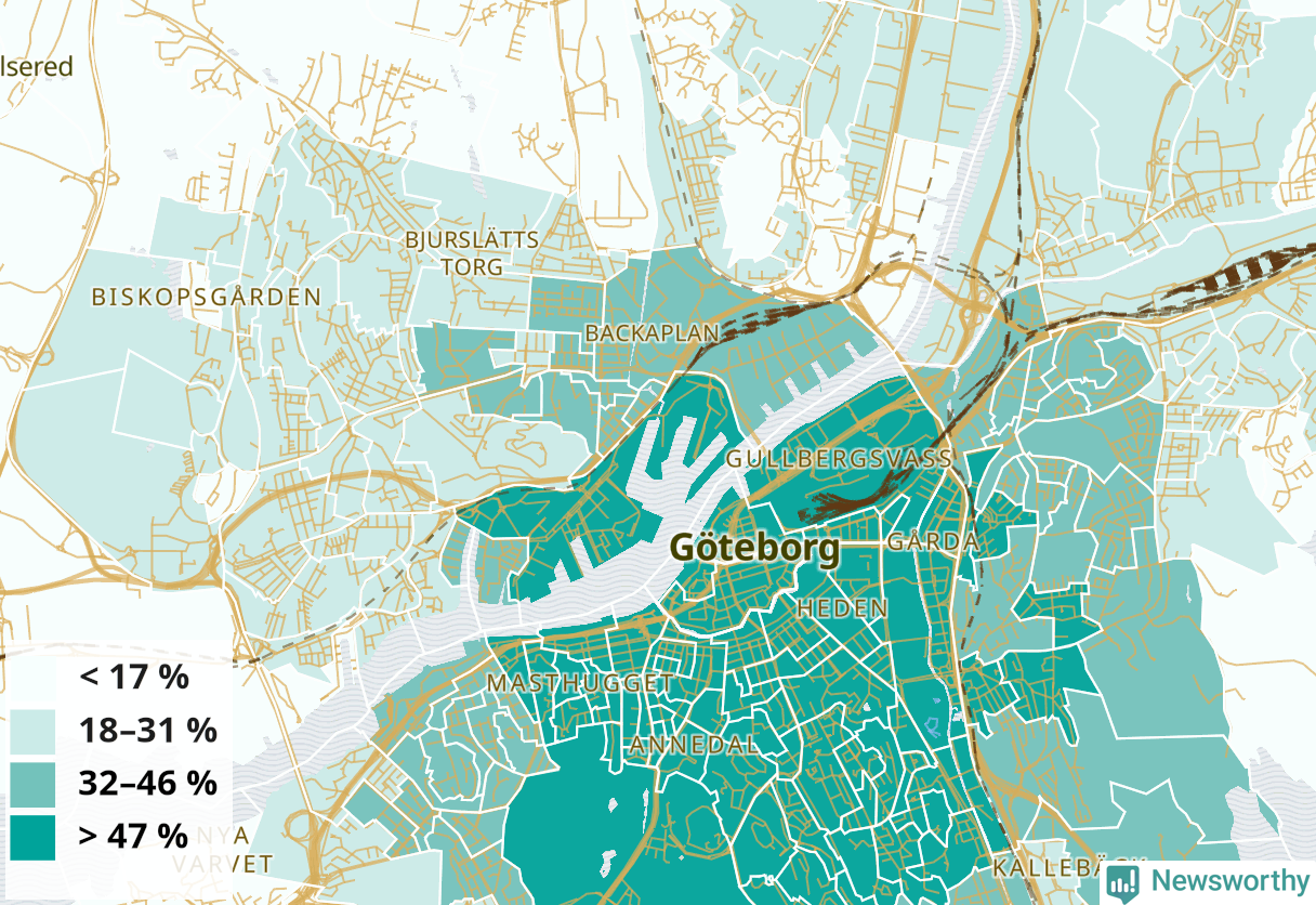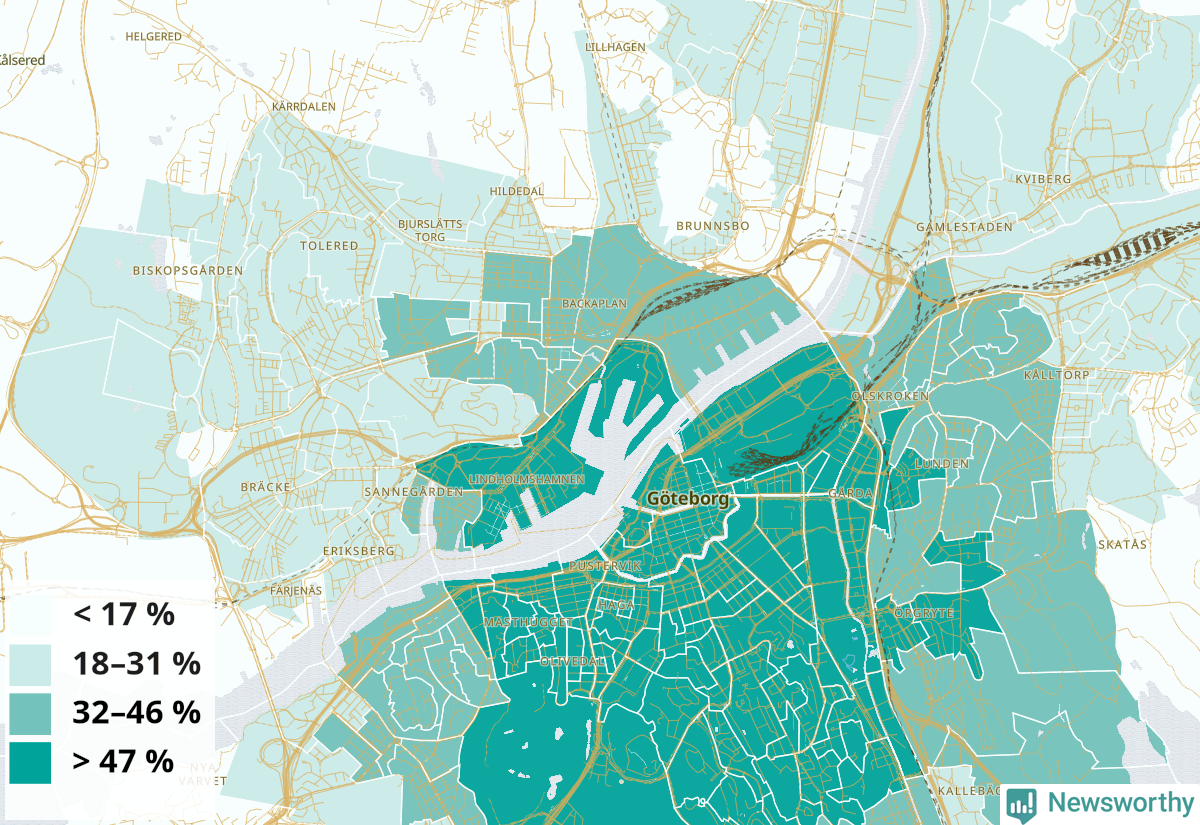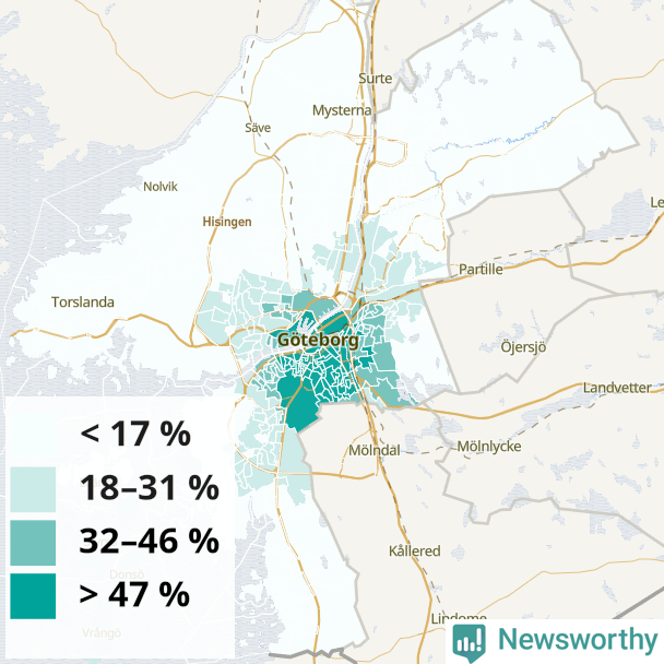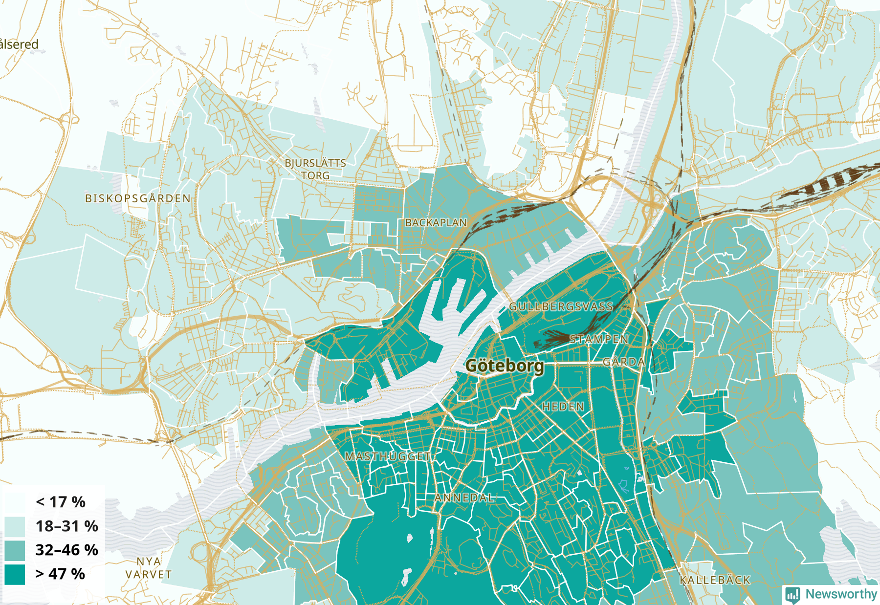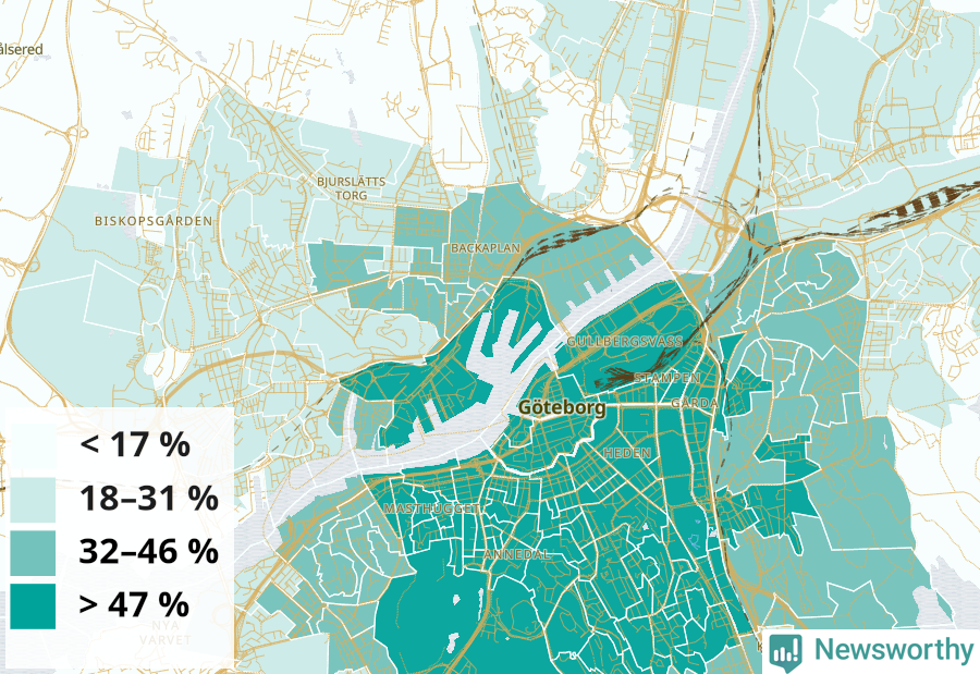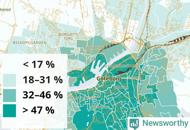 | Göteborg | 28 % | 31 % | 24 % | Olofshöjd och Fogelbergsparken (Vasastaden) (60 %) |