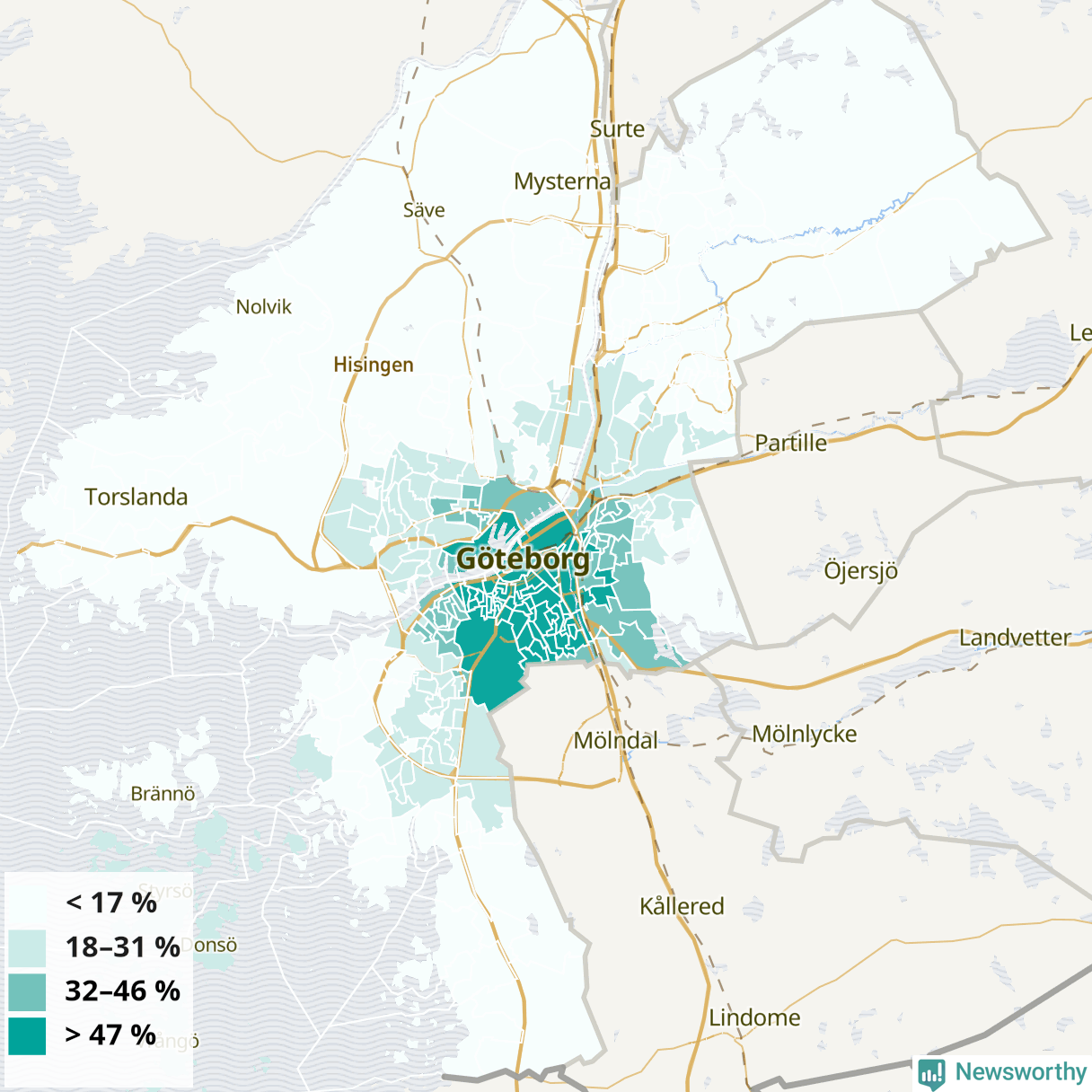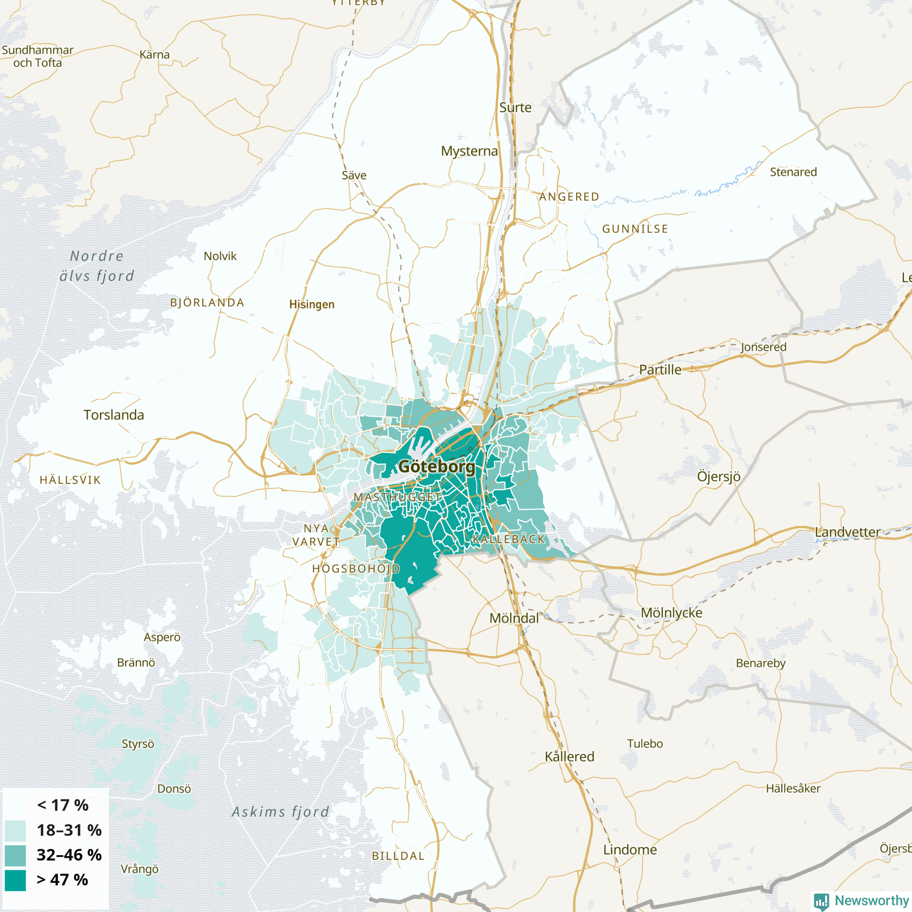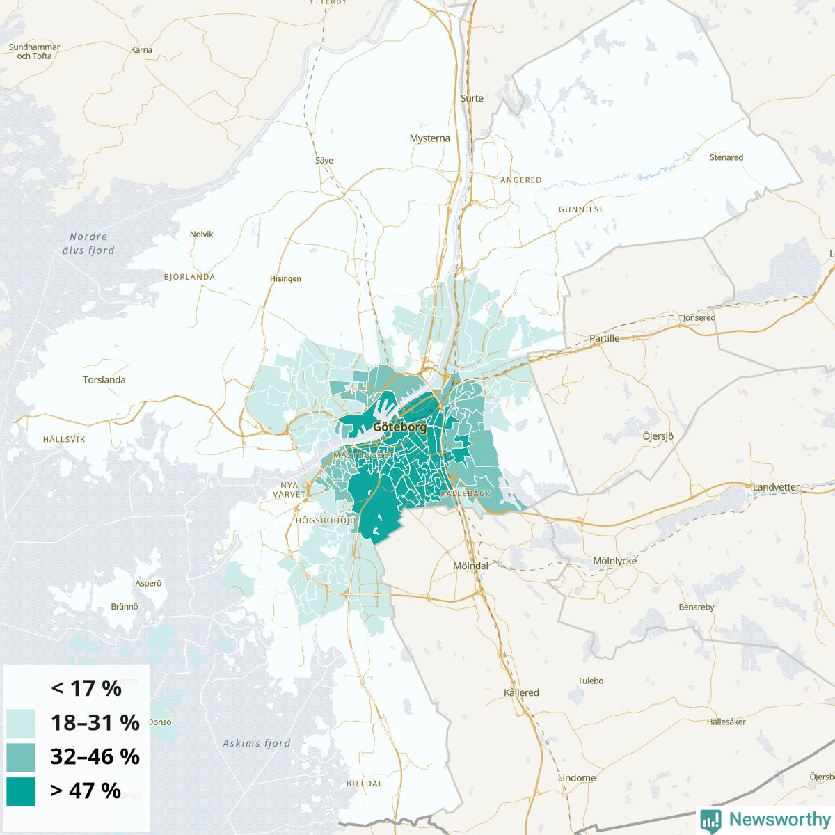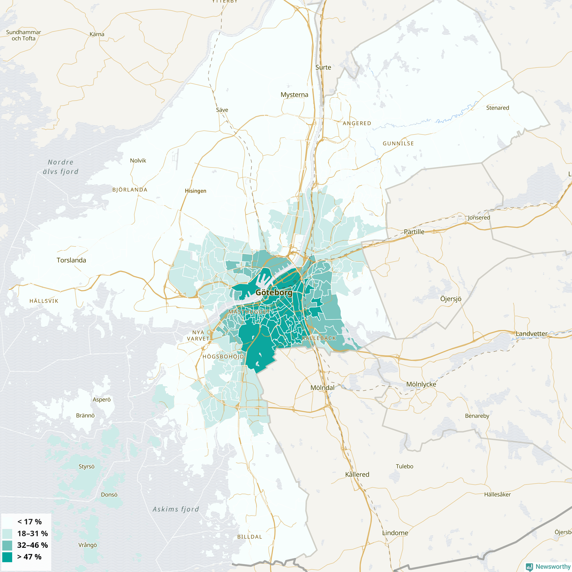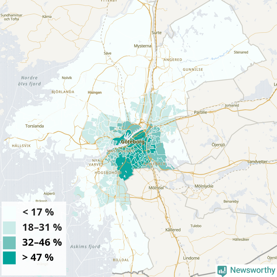 | Göteborg | 28 % | 31 % | 24 % | Olofshöjd och Fogelbergsparken (Vasastaden) (60 %) |