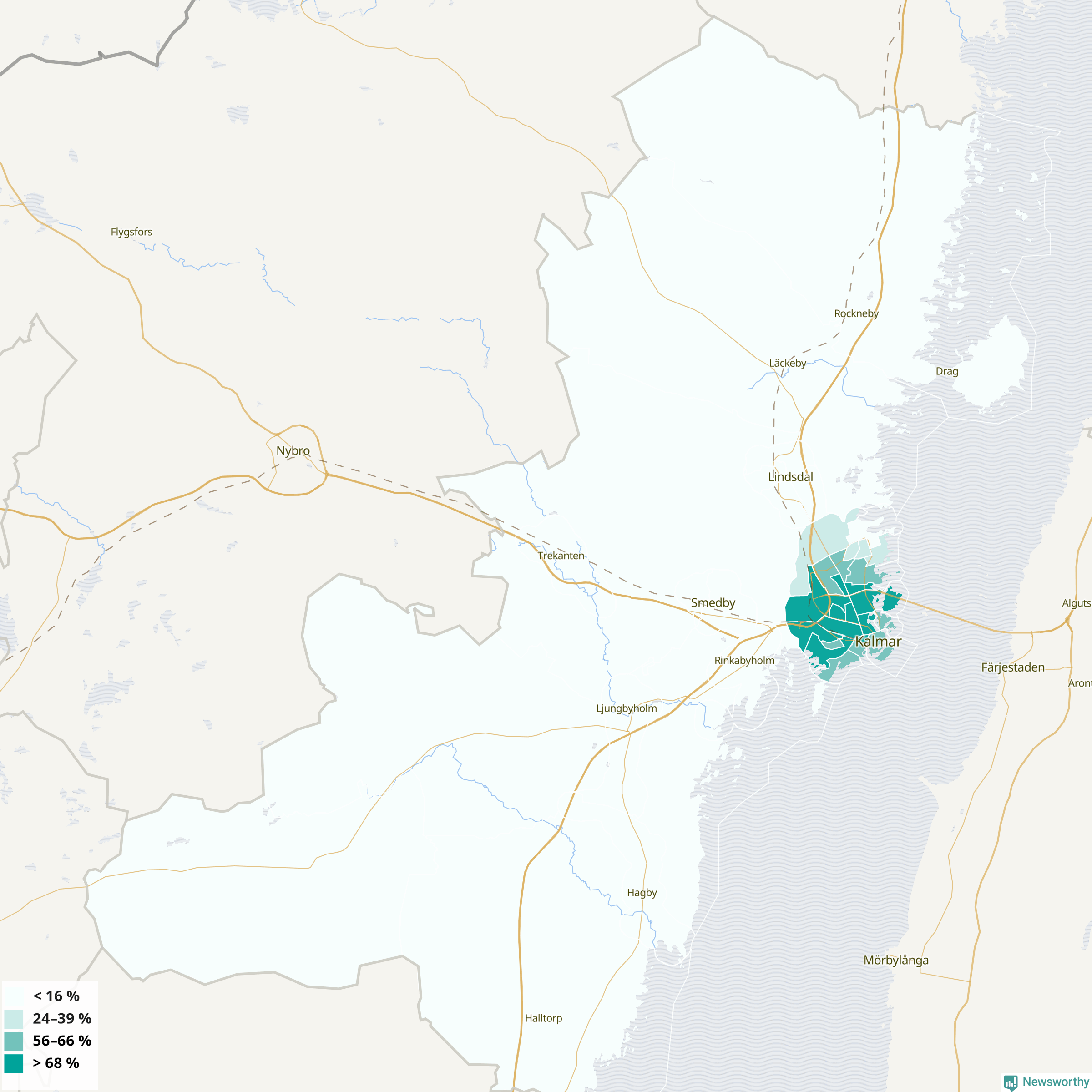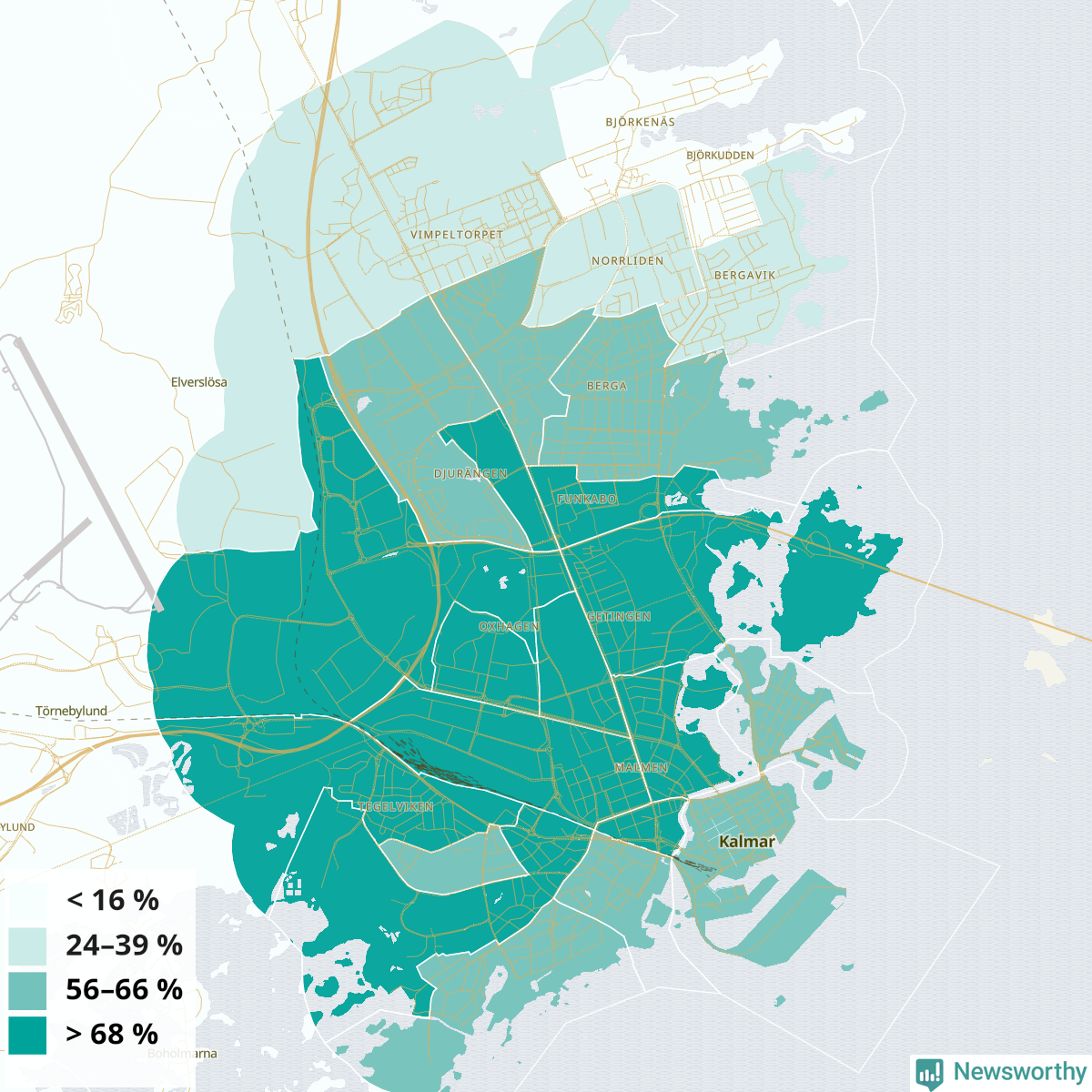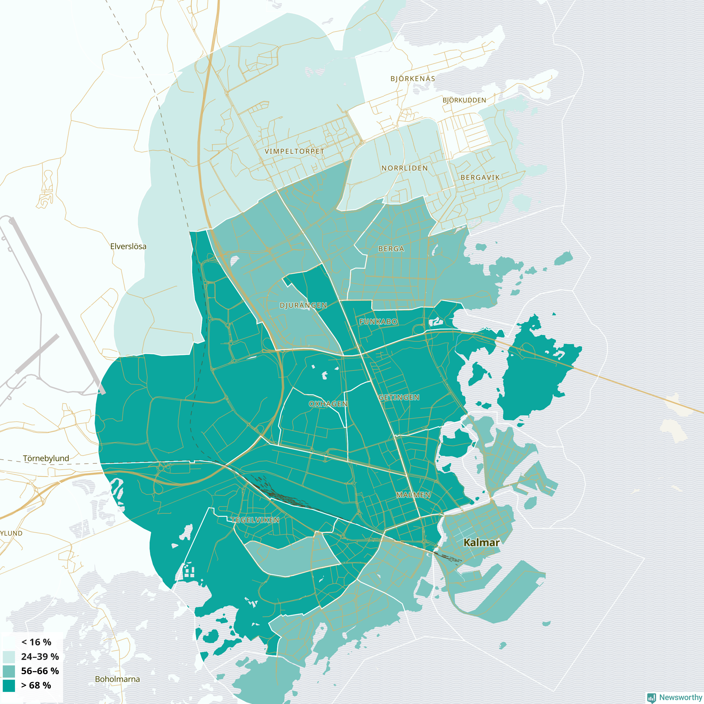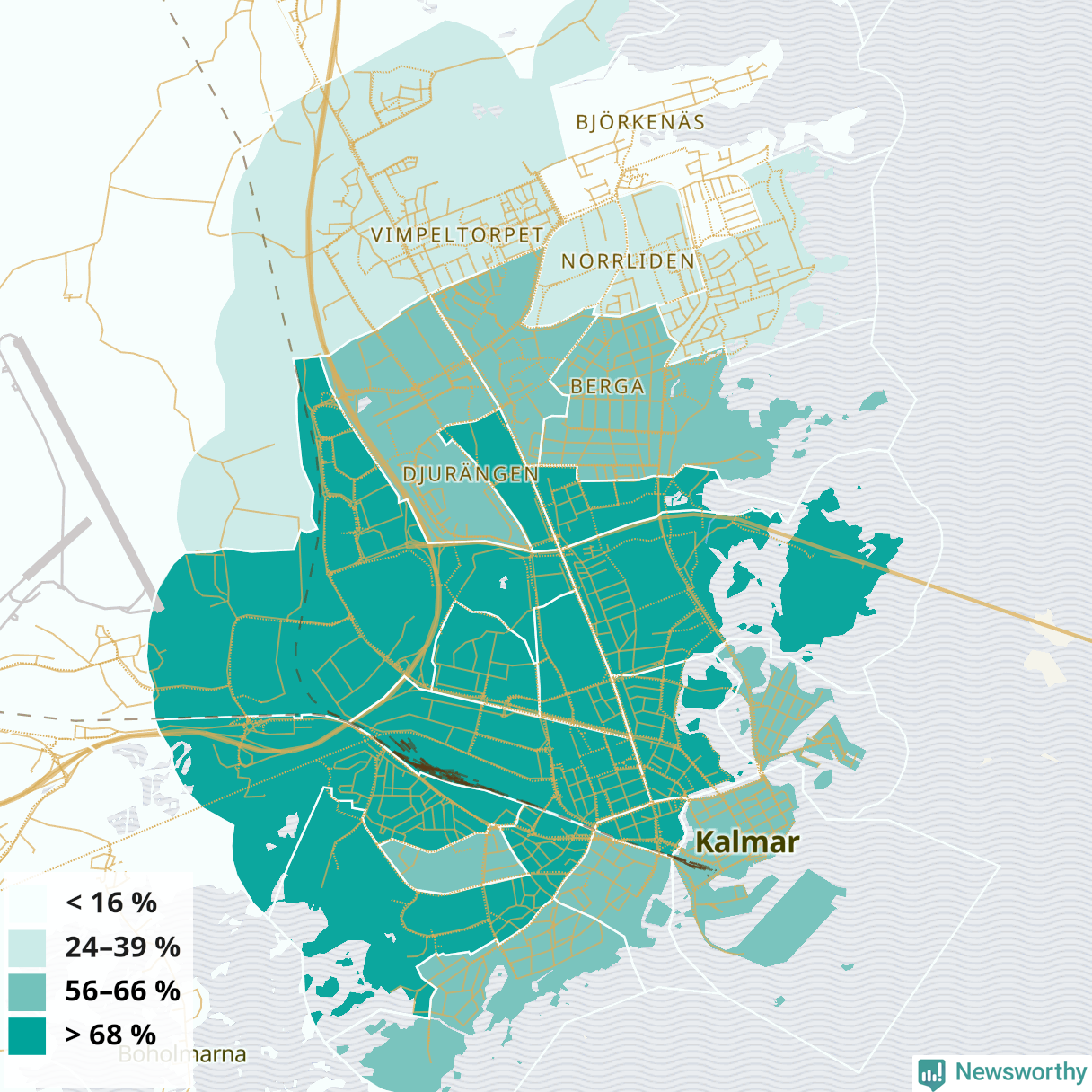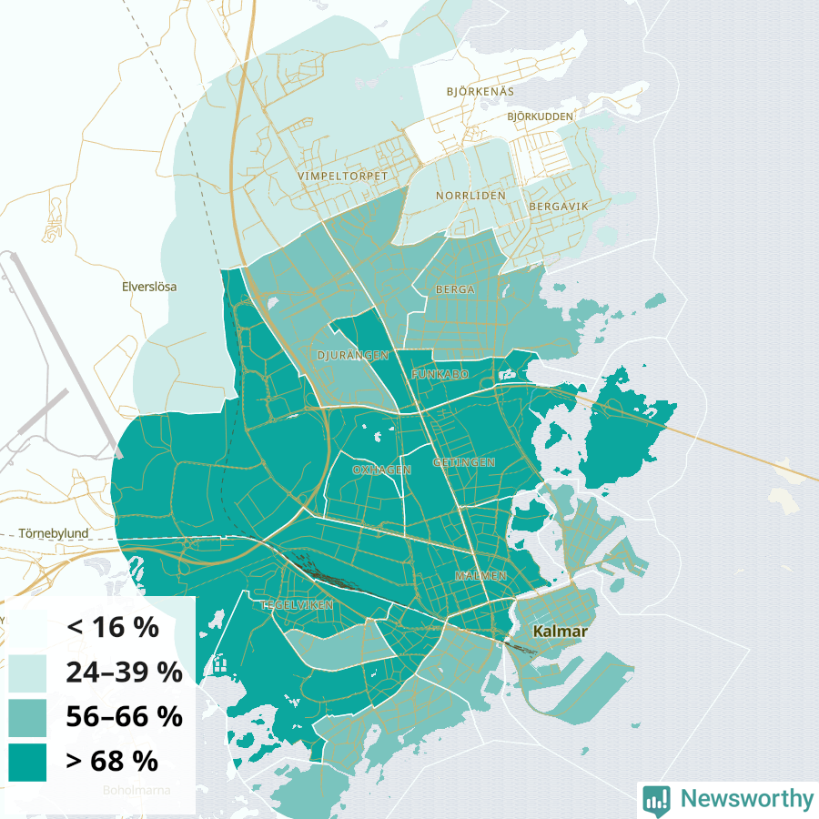 | Kalmar | 39 % | 41 % | 37 % | Norra Oxhagen och Getingen-Tallhagen (76 %) |