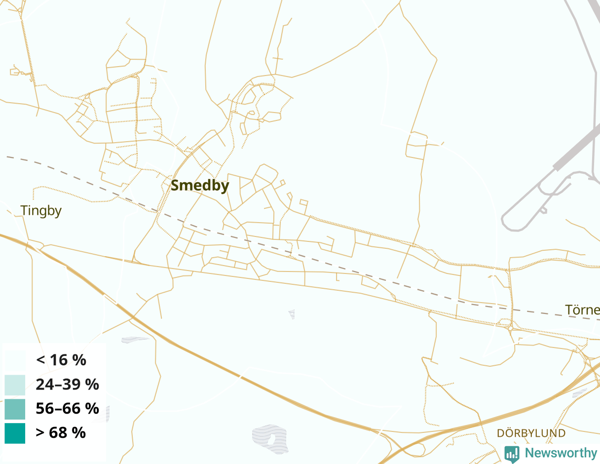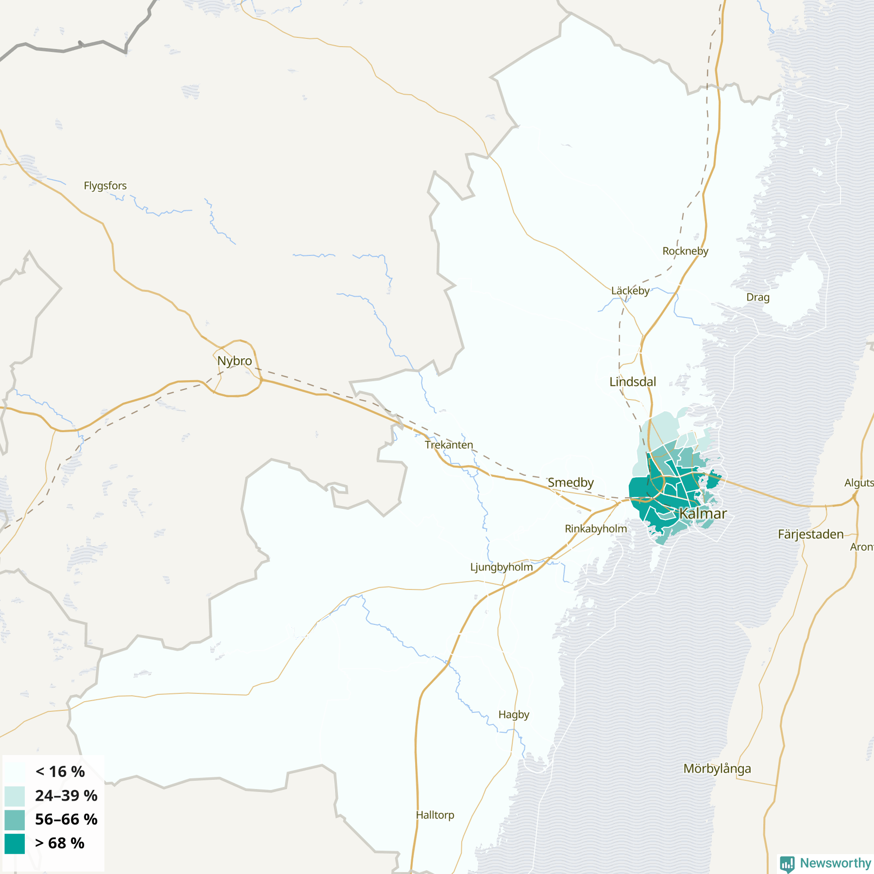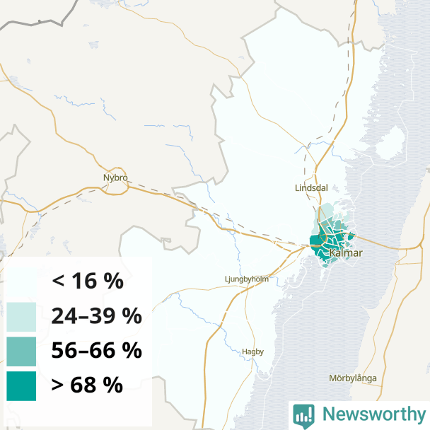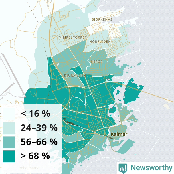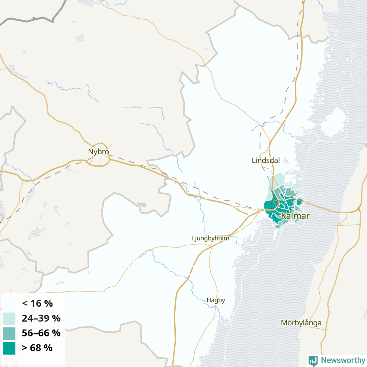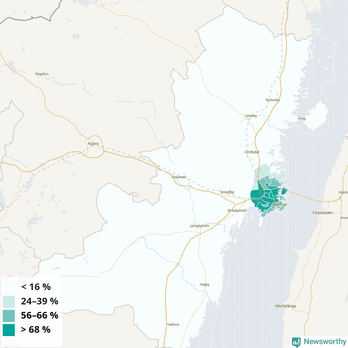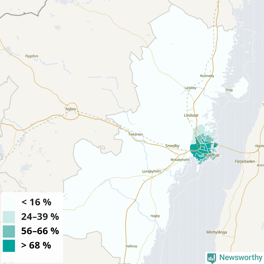 | Kalmar | 39 % | 41 % | 37 % | Norra Oxhagen och Getingen-Tallhagen (76 %) |