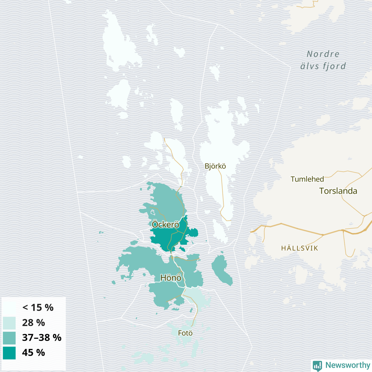 | Orust | 15 % | 17 % | 13 % | Ellös och västra Henån (37 %) |