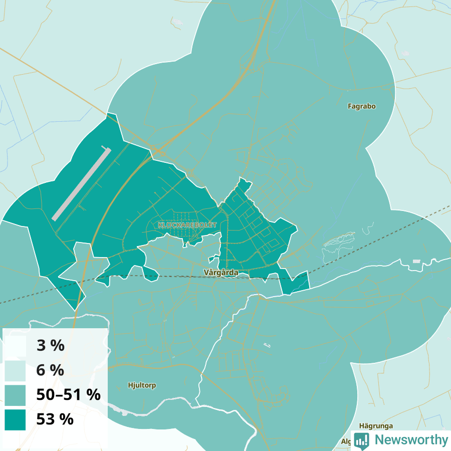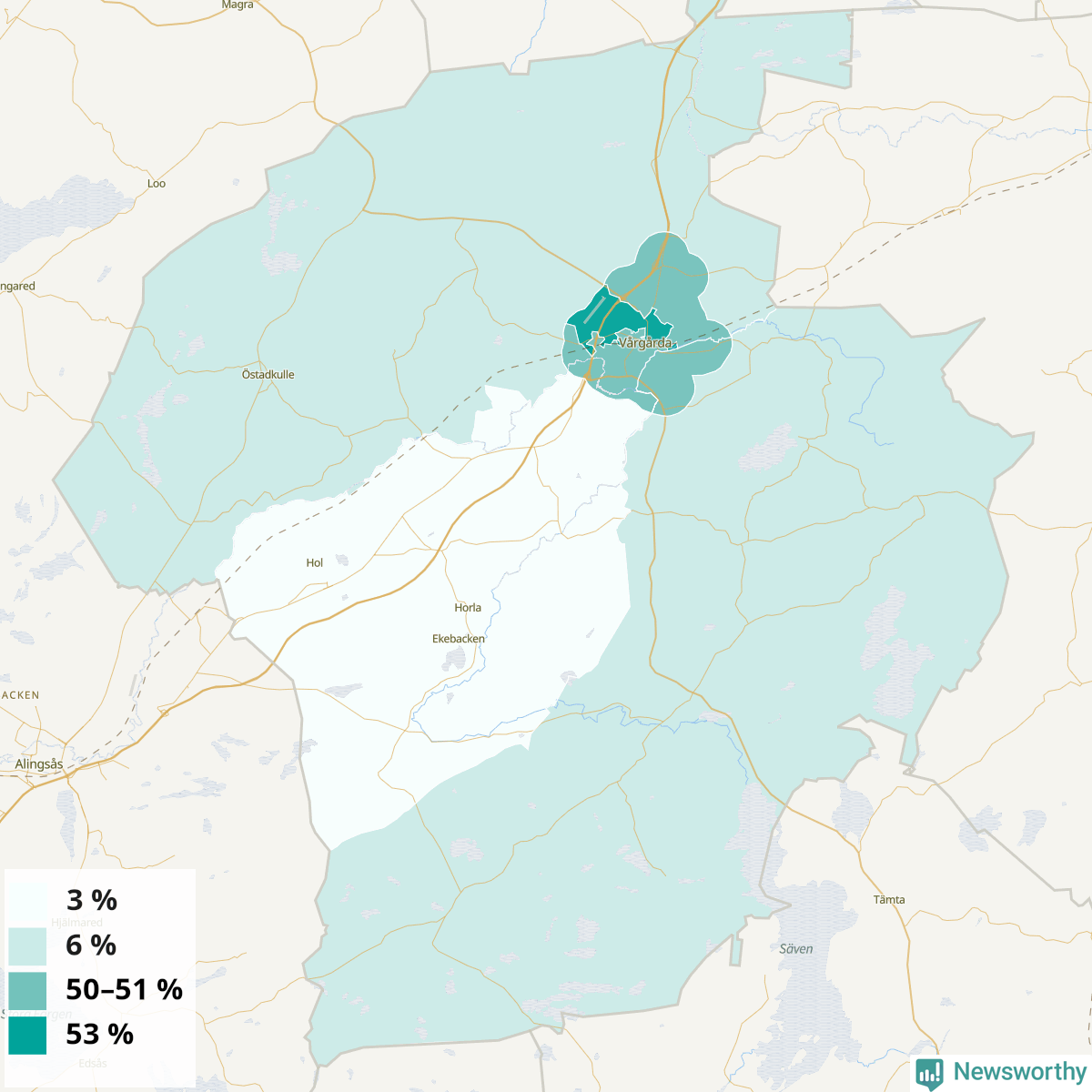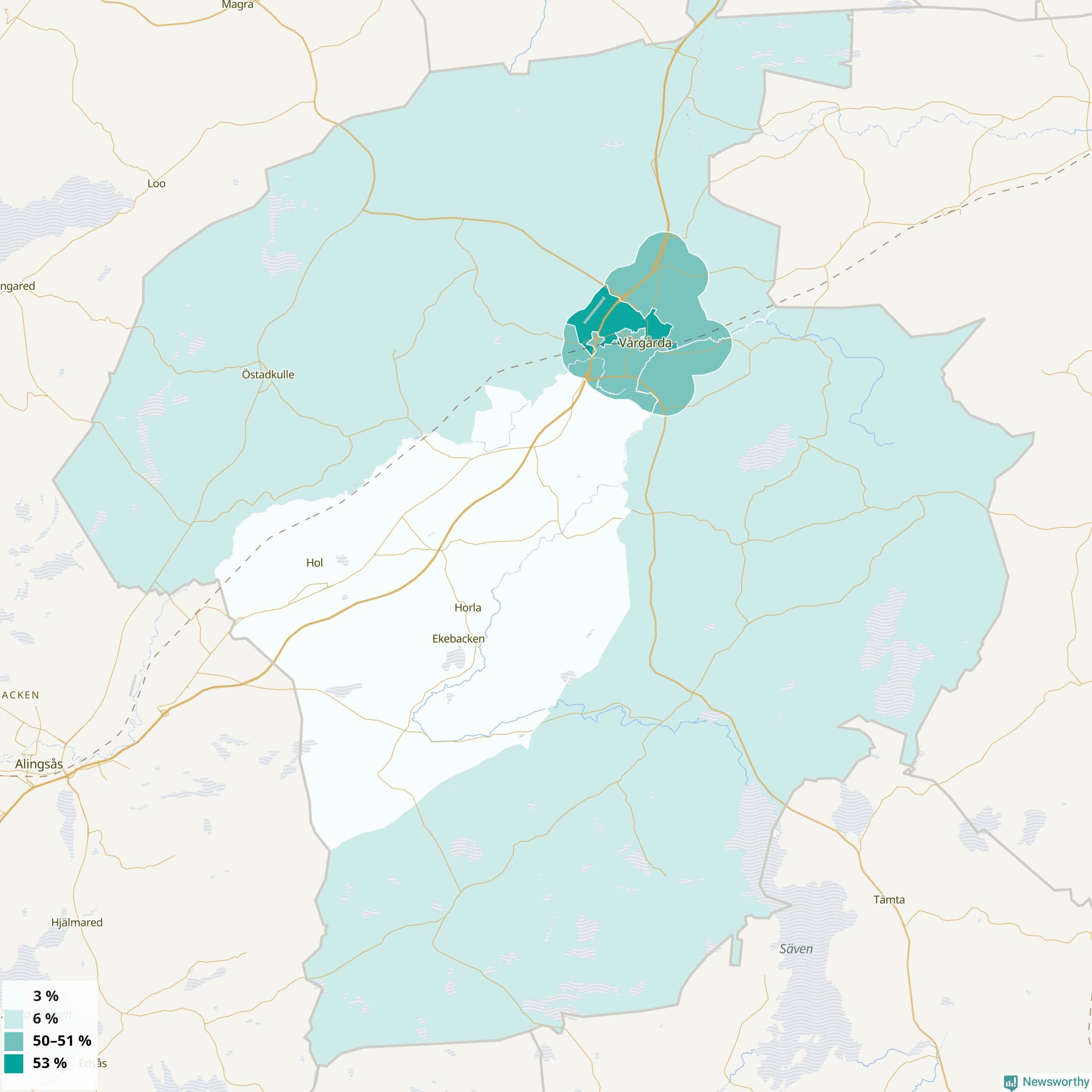 | Vårgårda tätort sydväst-Hallaberget-Hjultorp | 51 % |