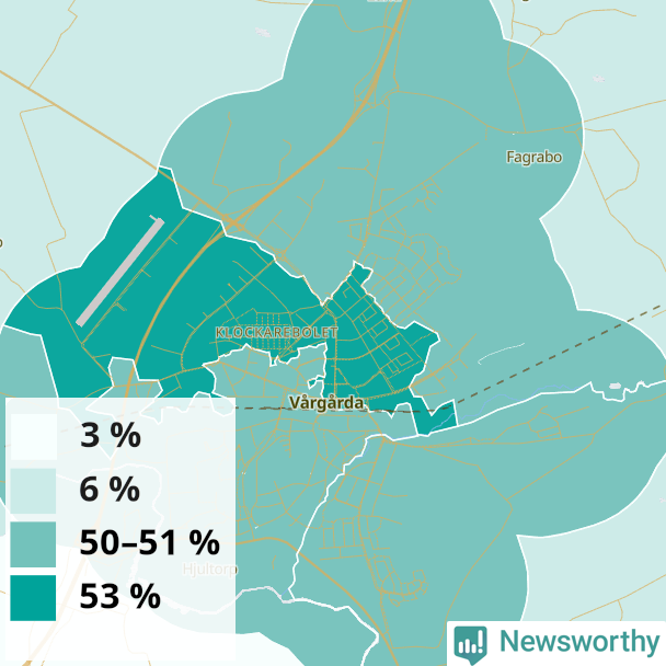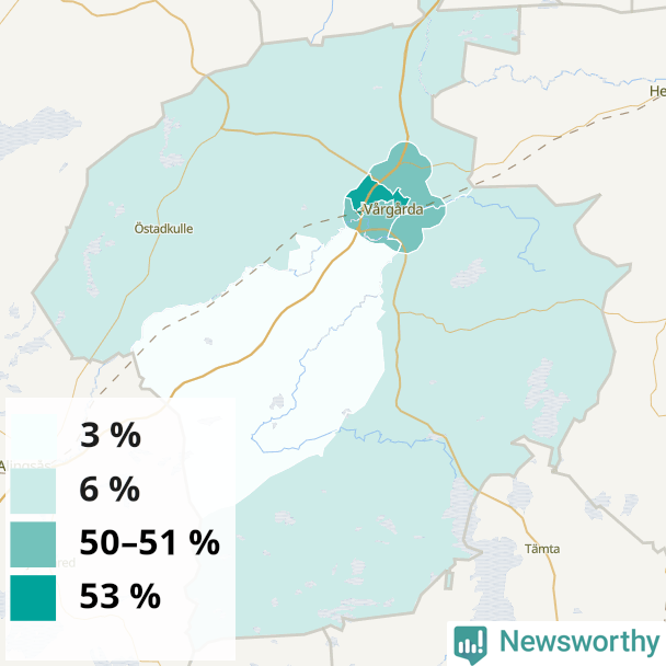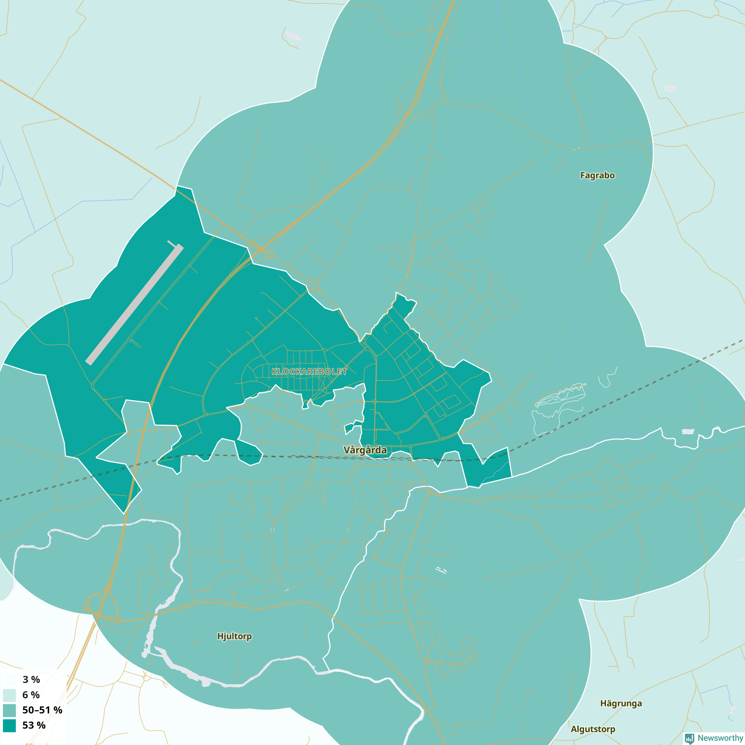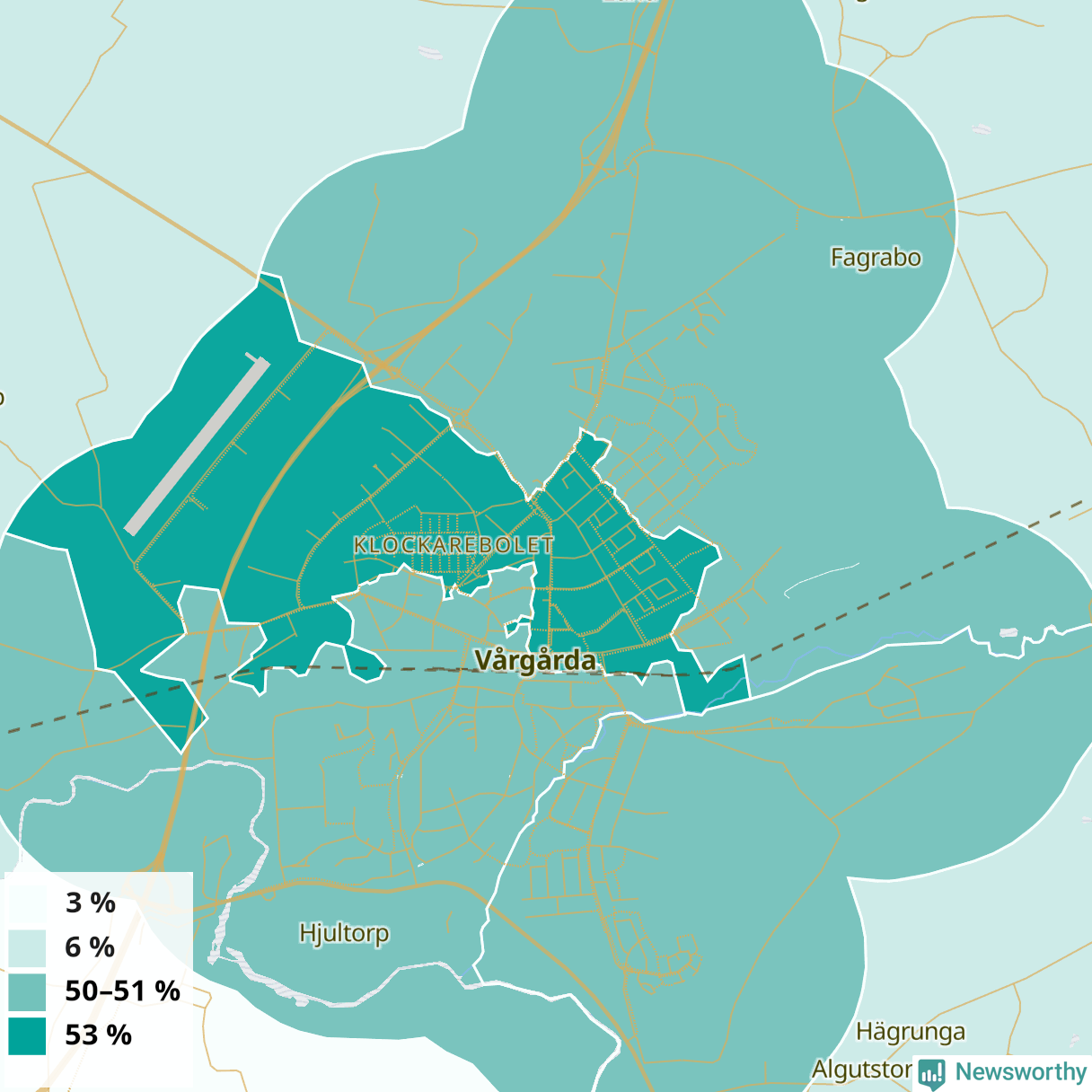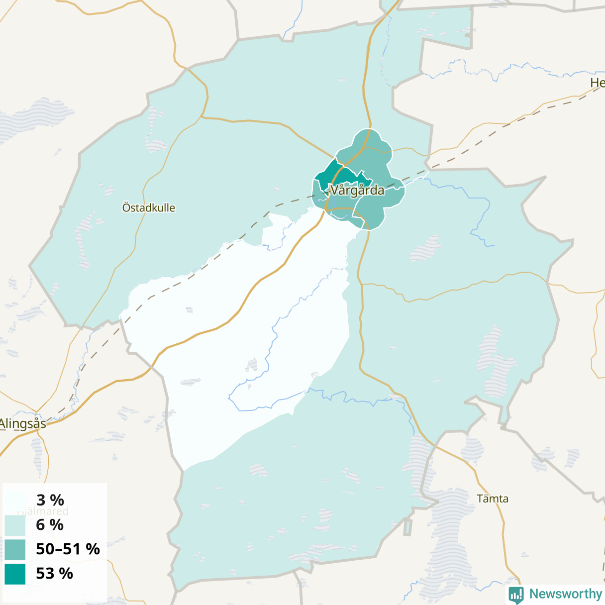 | Vårgårda tätort sydväst-Hallaberget-Hjultorp | 51 % |