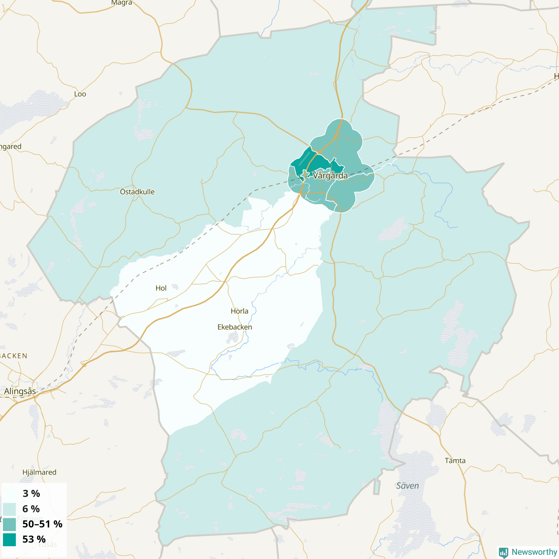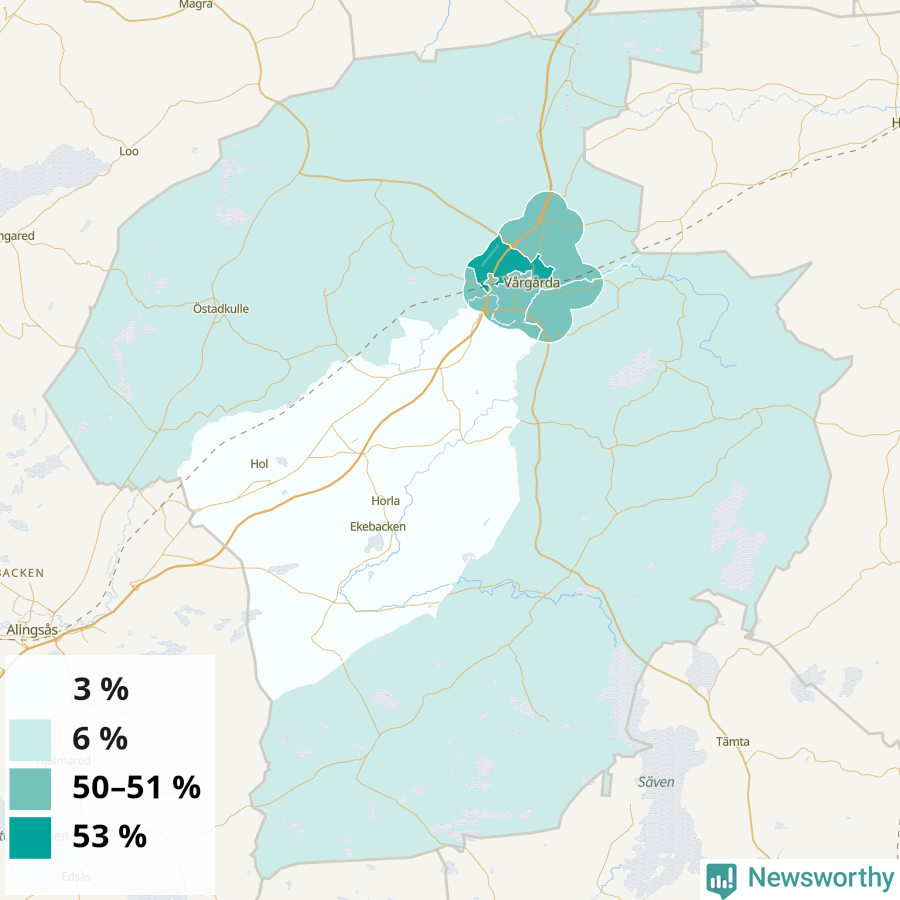 | Vårgårda | 29 % | 29 % | 29 % | Vårgårda tätort väst-Centrum-Hoberg (53 %) |