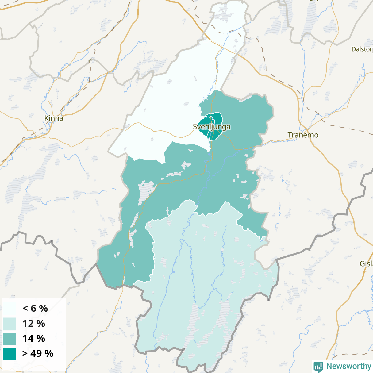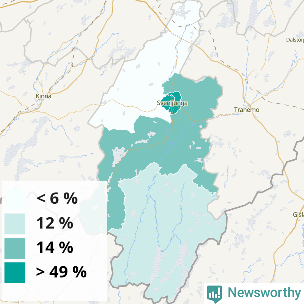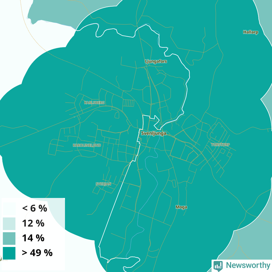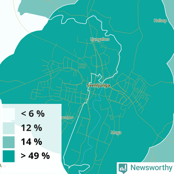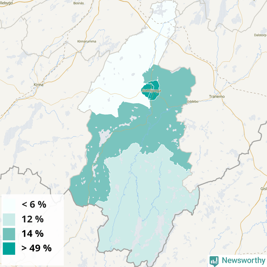 | Svenljunga | 24 % | 28 % | 20 % | Svenljunga västra tätort (50 %) |