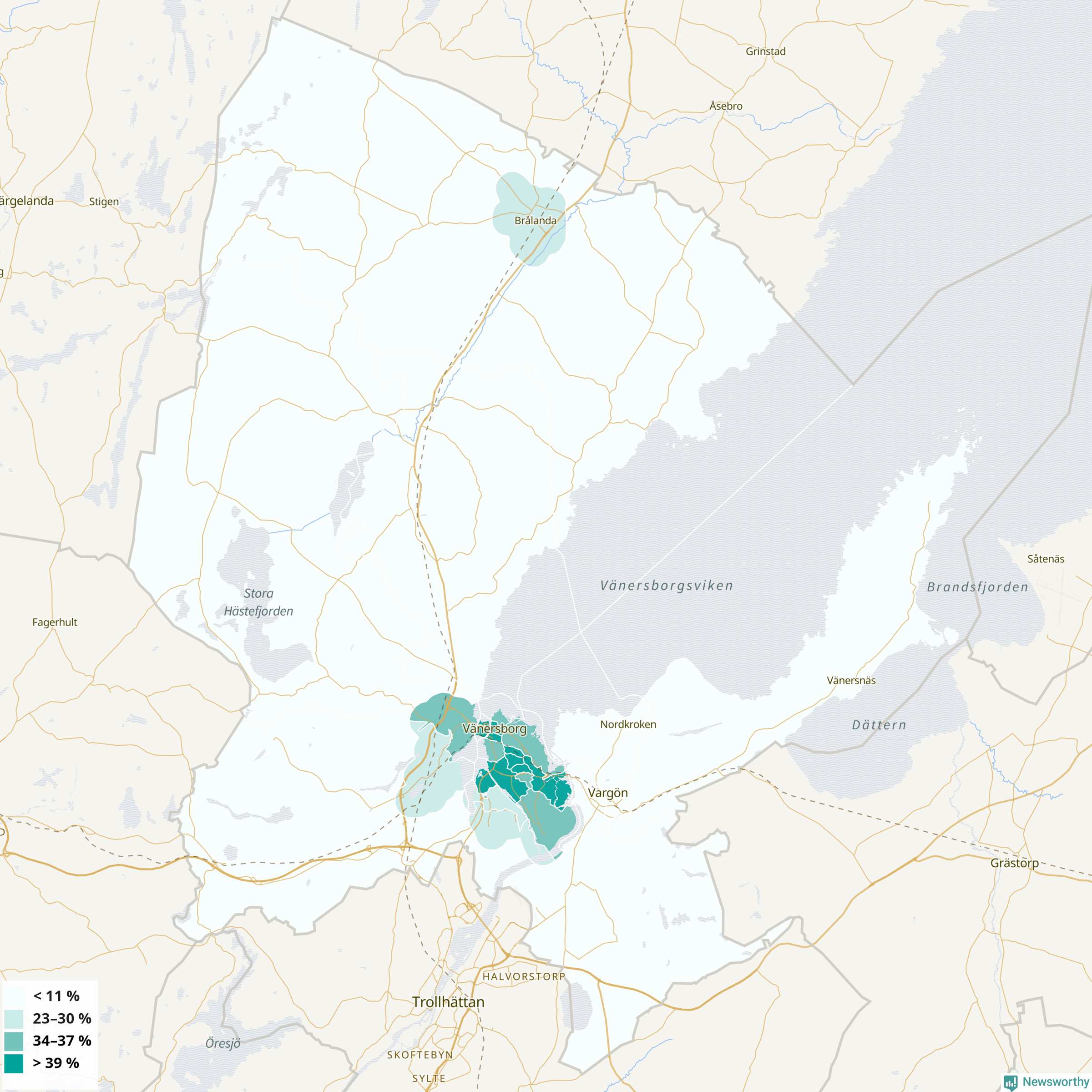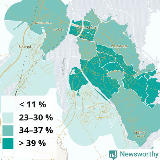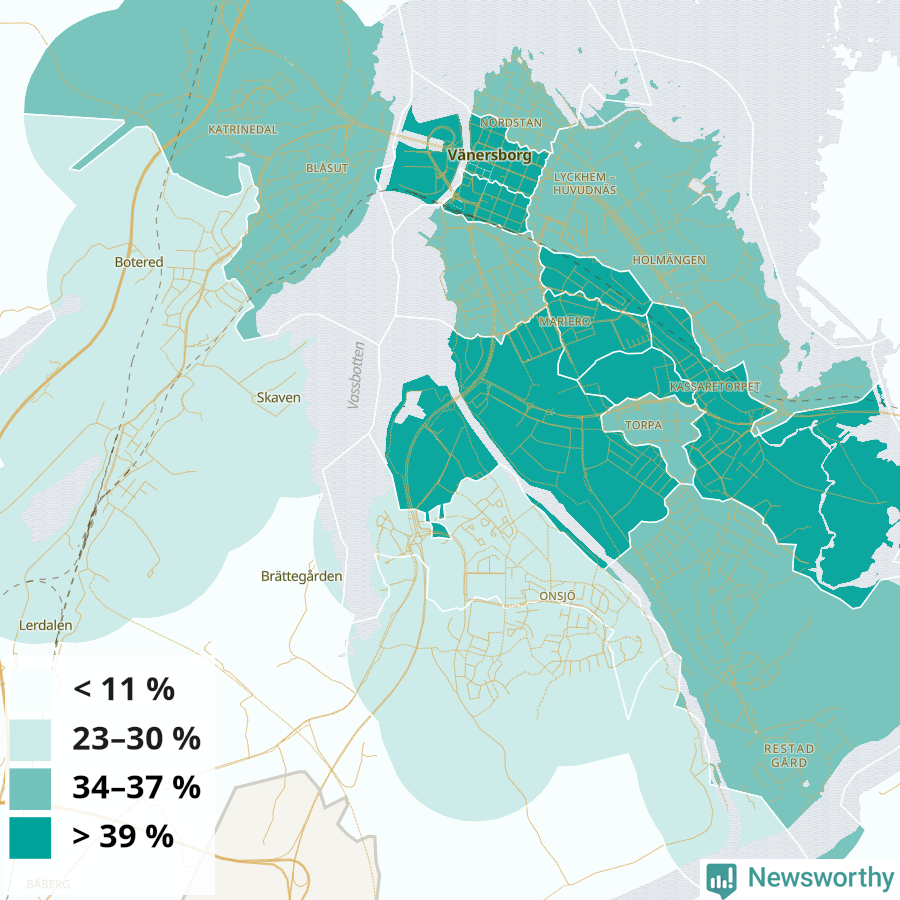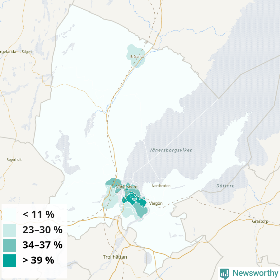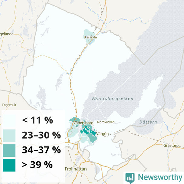 | Delar av Vänersborg centrum | 34 % |