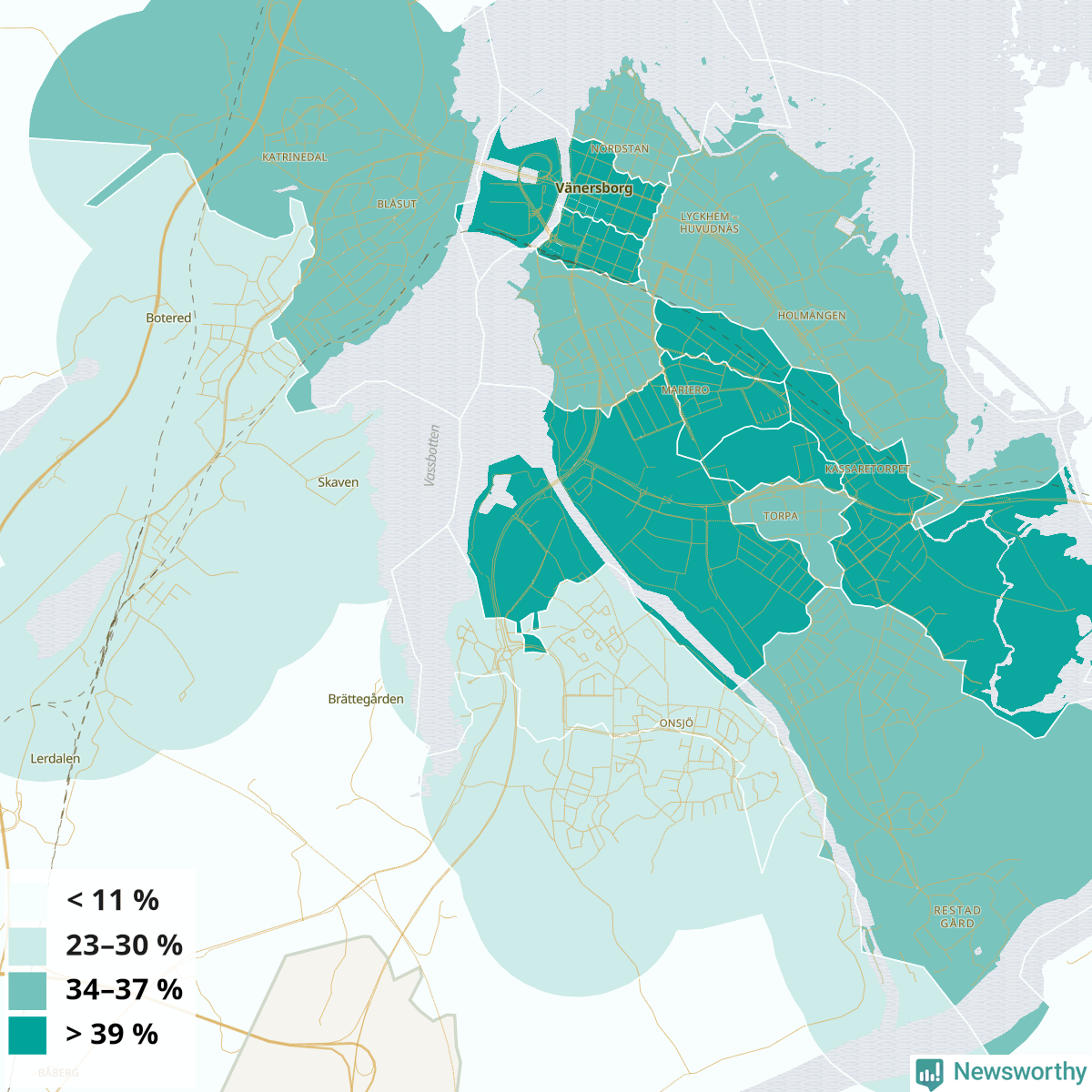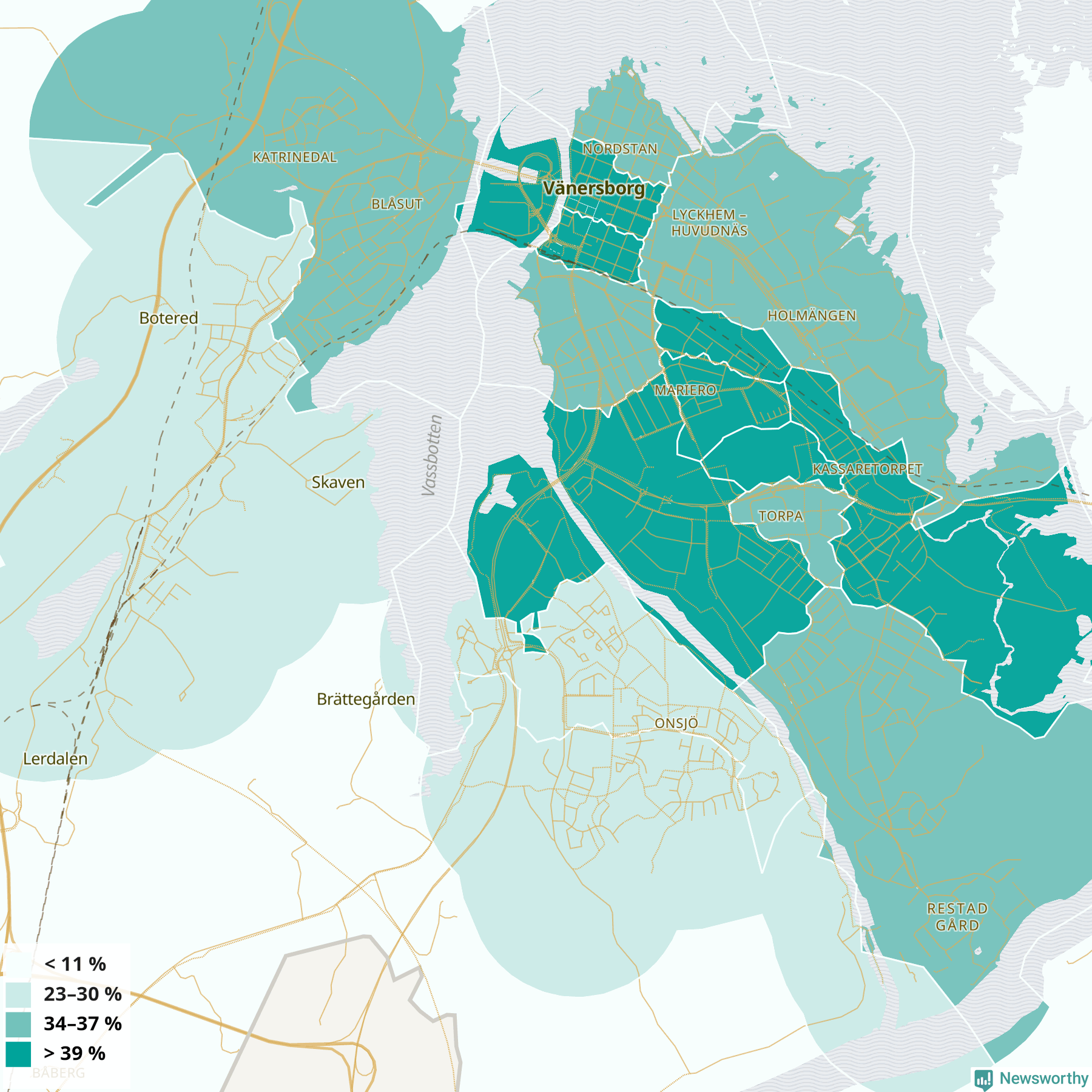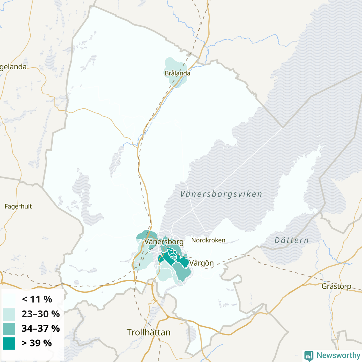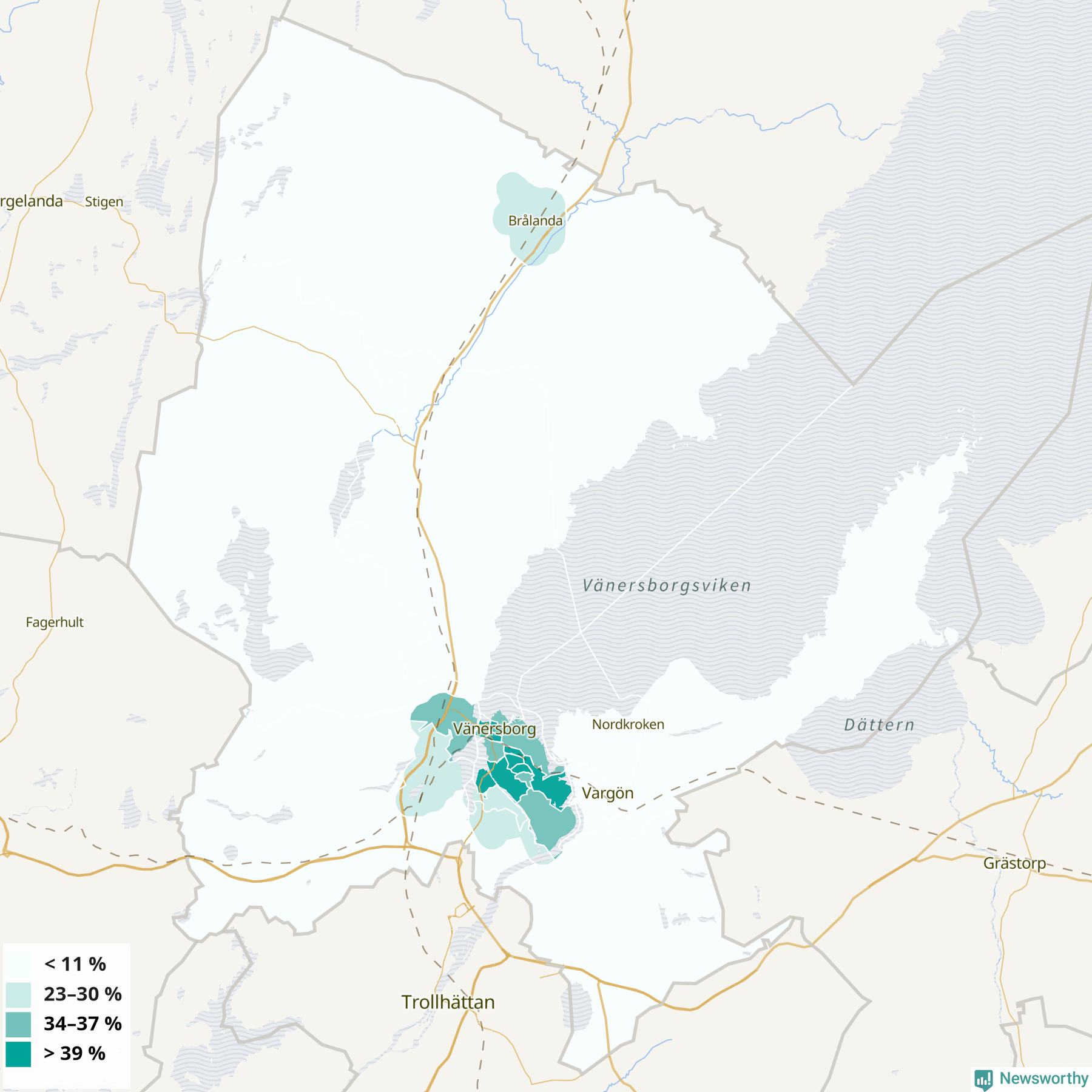 | Delar av Vänersborg centrum | 34 % |