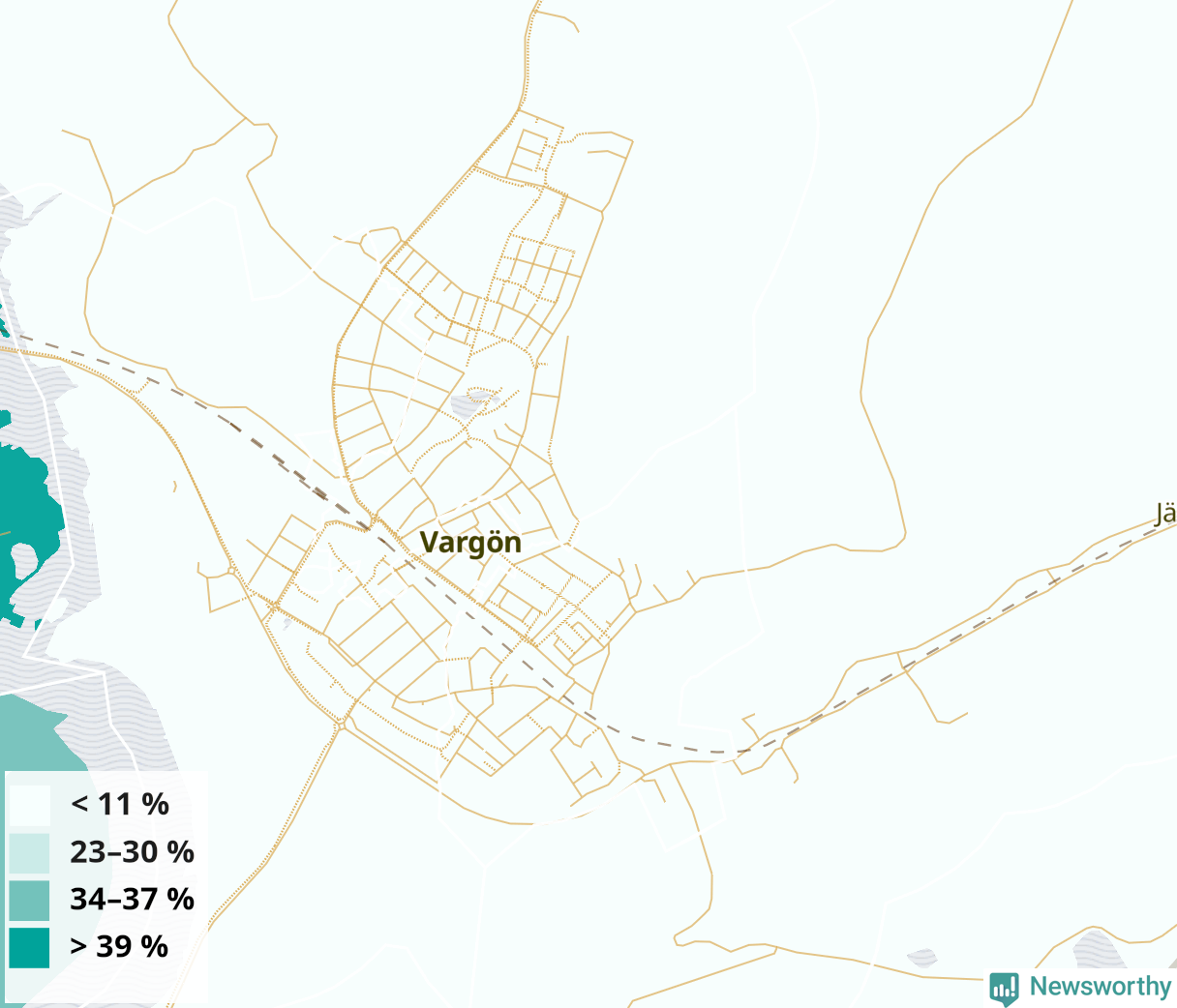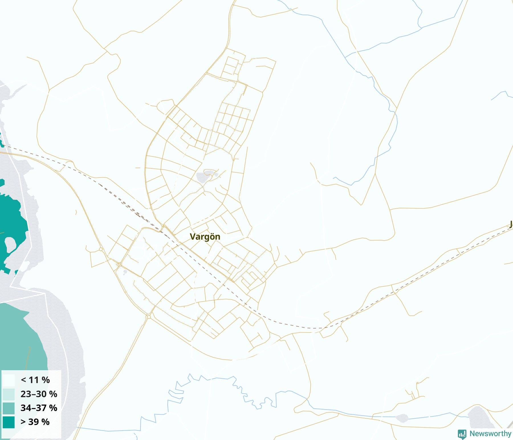 | Götene | 25 % | 24 % | 26 % | Götene tätort södra och Götene tätort nordöstra (55 %) |