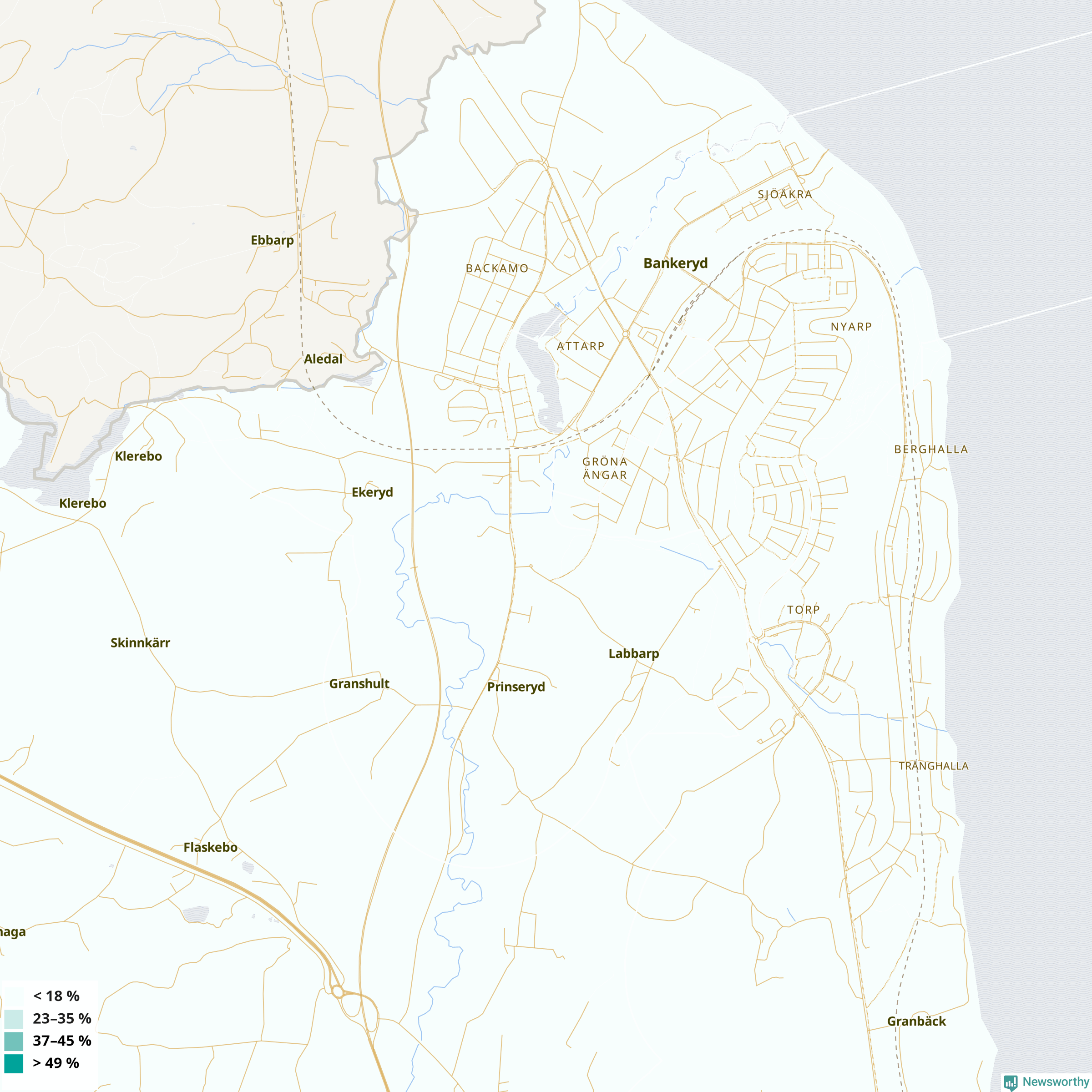 | Mullsjö | 32 % | 37 % | 27 % | Mullsjö tätort nordvästra (42 %) |