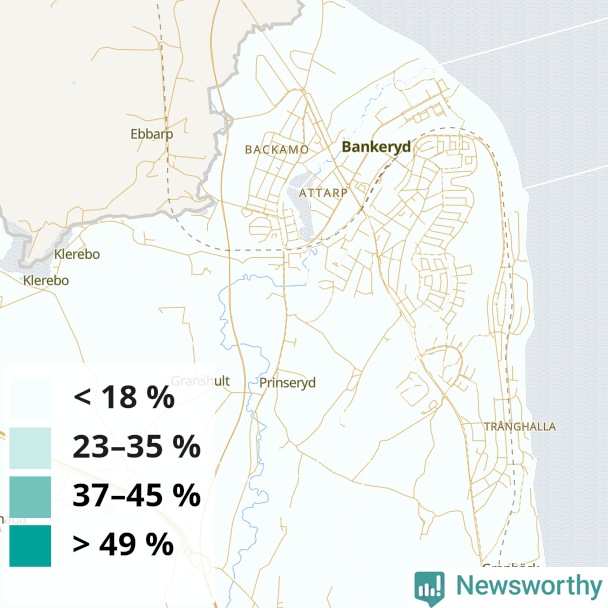 | Gislaved | 39 % | 40 % | 38 % | Smålandsstenar västra (57 %) |