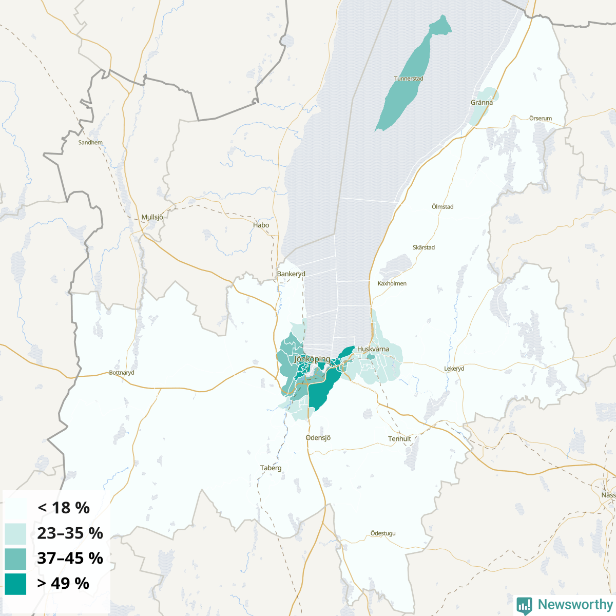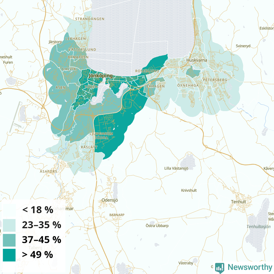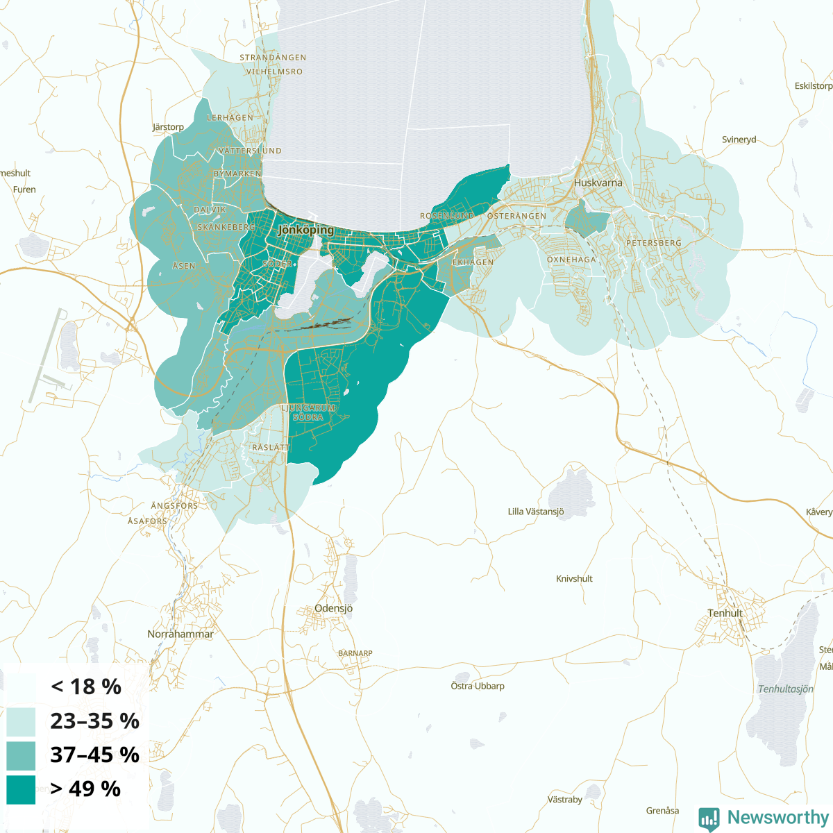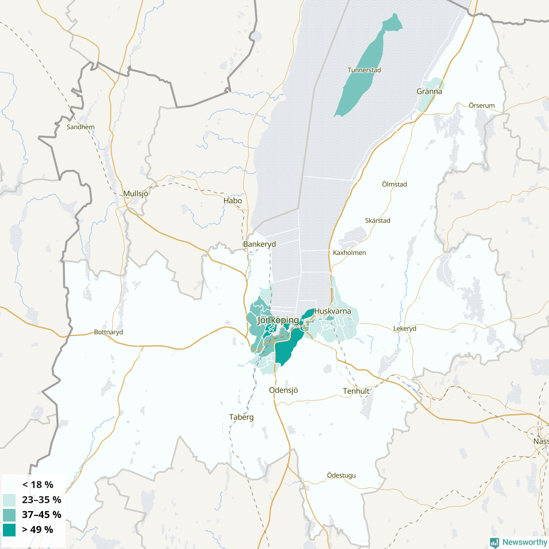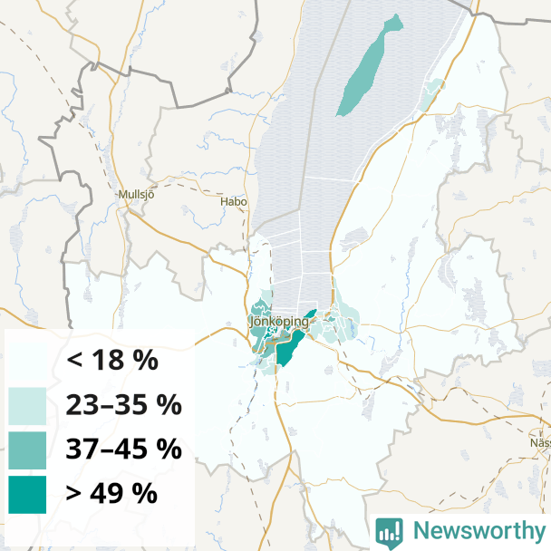 | Jönköping | 31 % | 36 % | 27 % | Delar av Jönköping centrum Öster (59 %) |