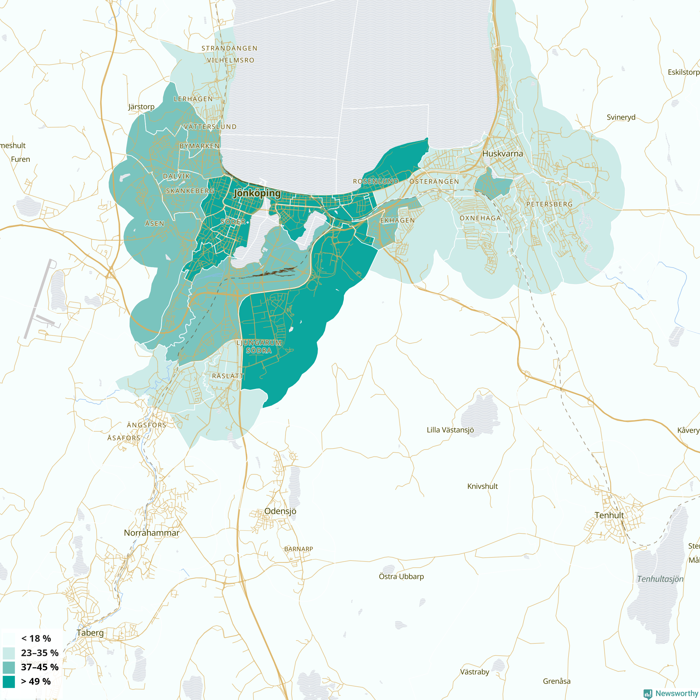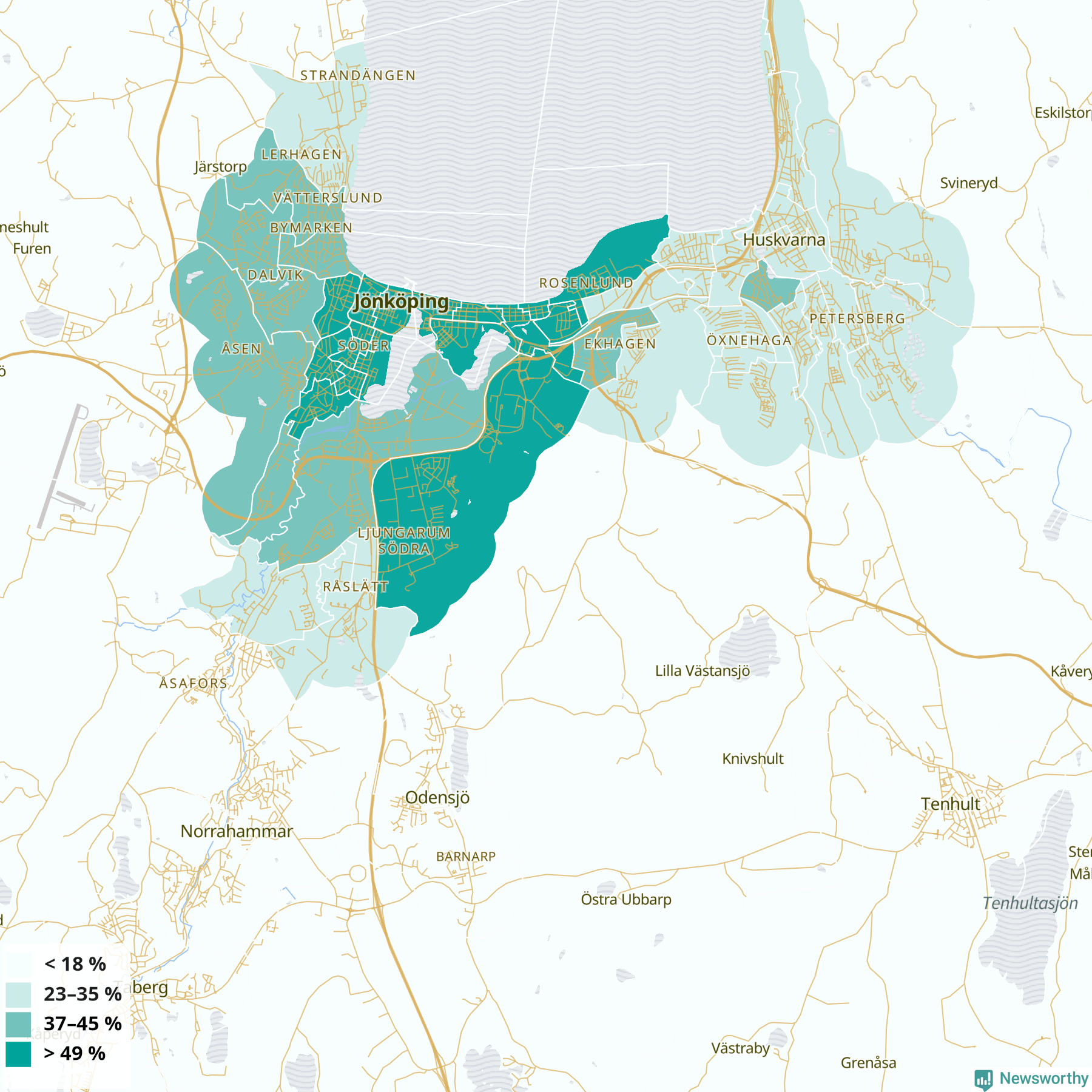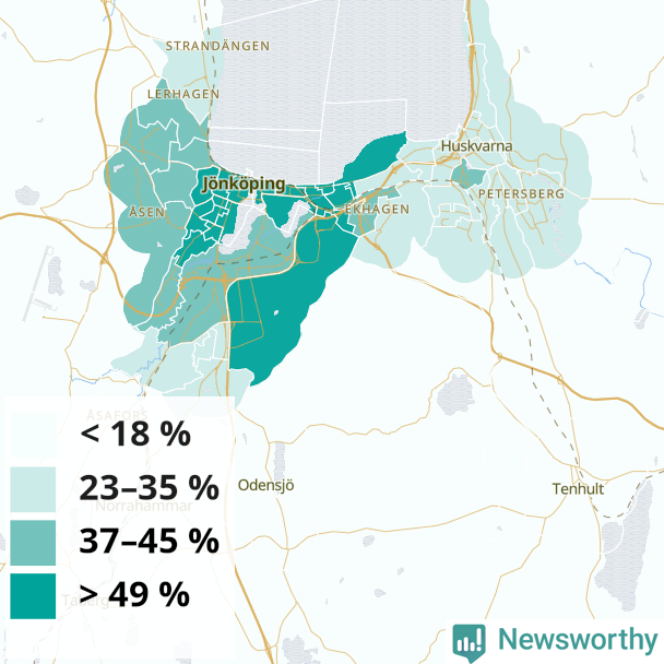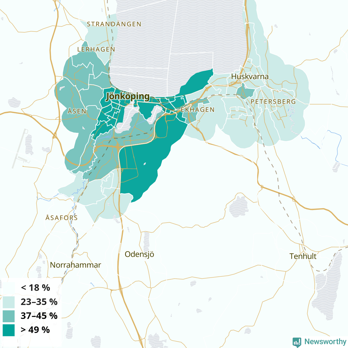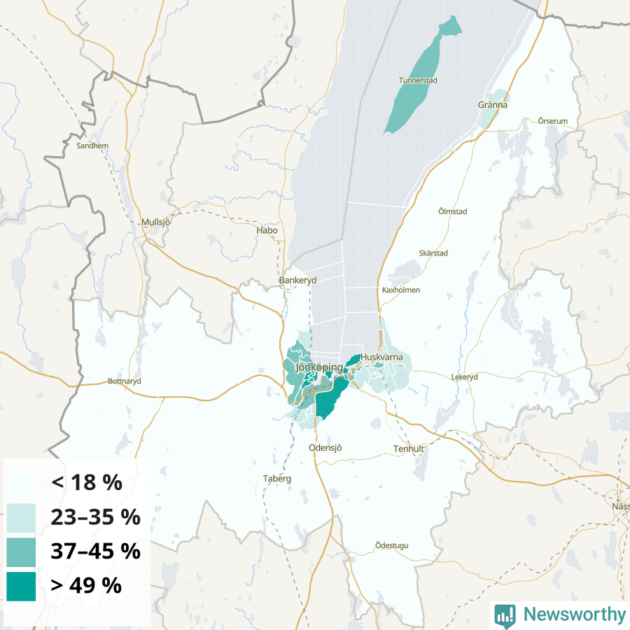 | Jönköping | 31 % | 36 % | 27 % | Delar av Jönköping centrum Öster (59 %) |