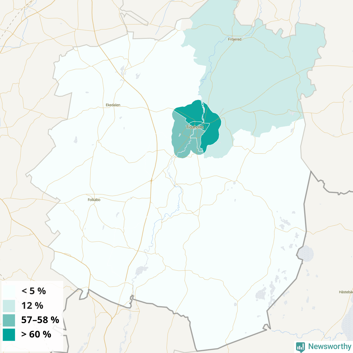 | Tibro | 34 % | 38 % | 30 % | Tibro nordöstra (45 %) |