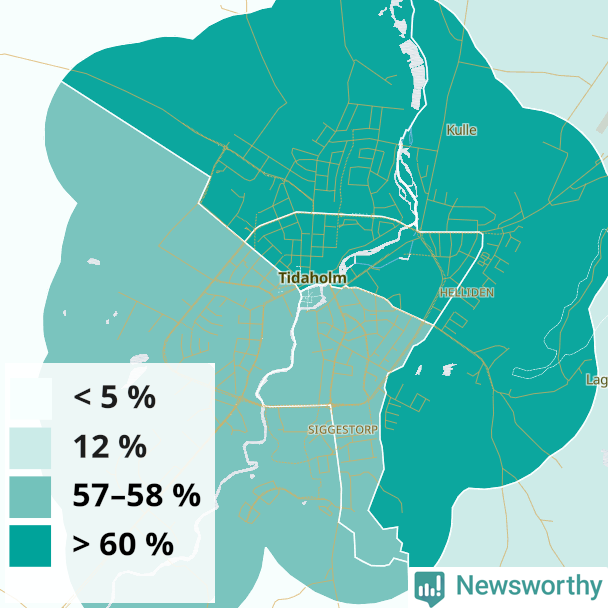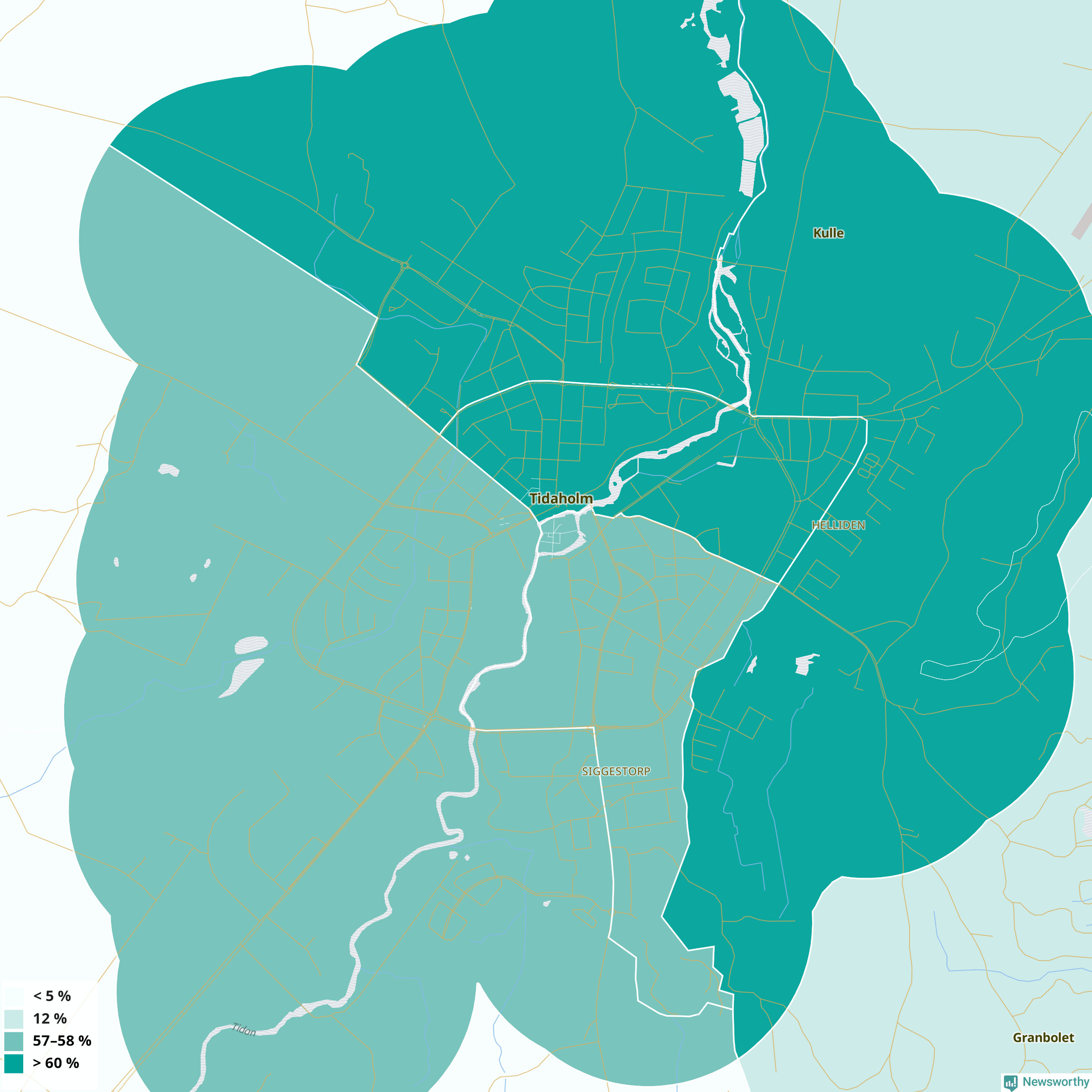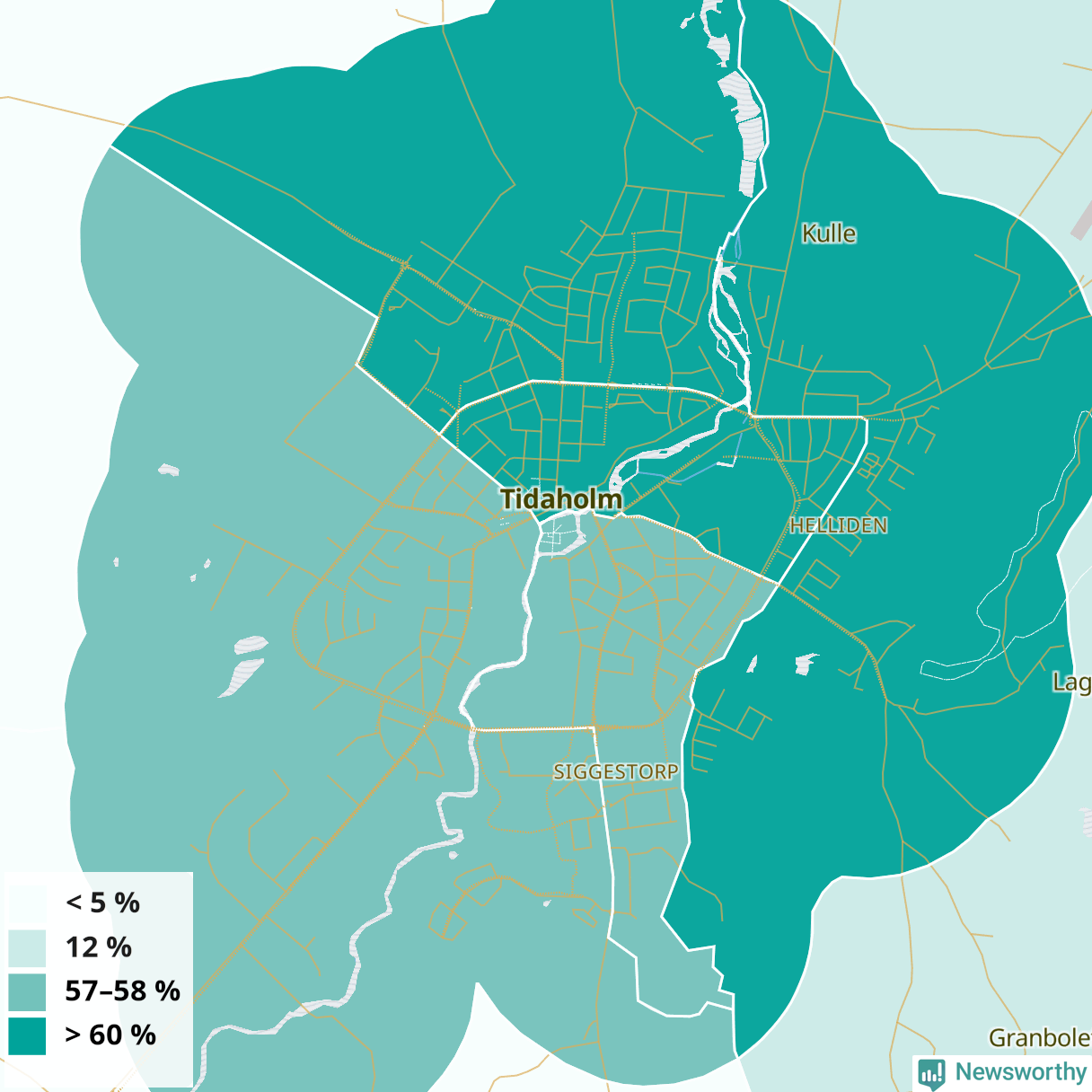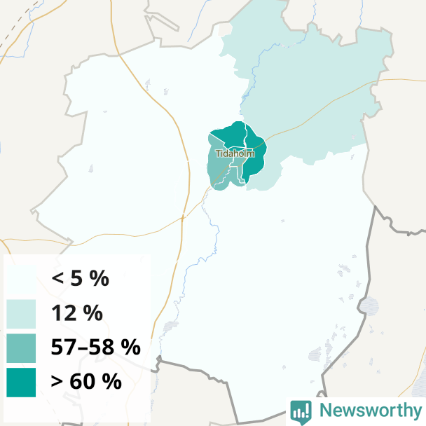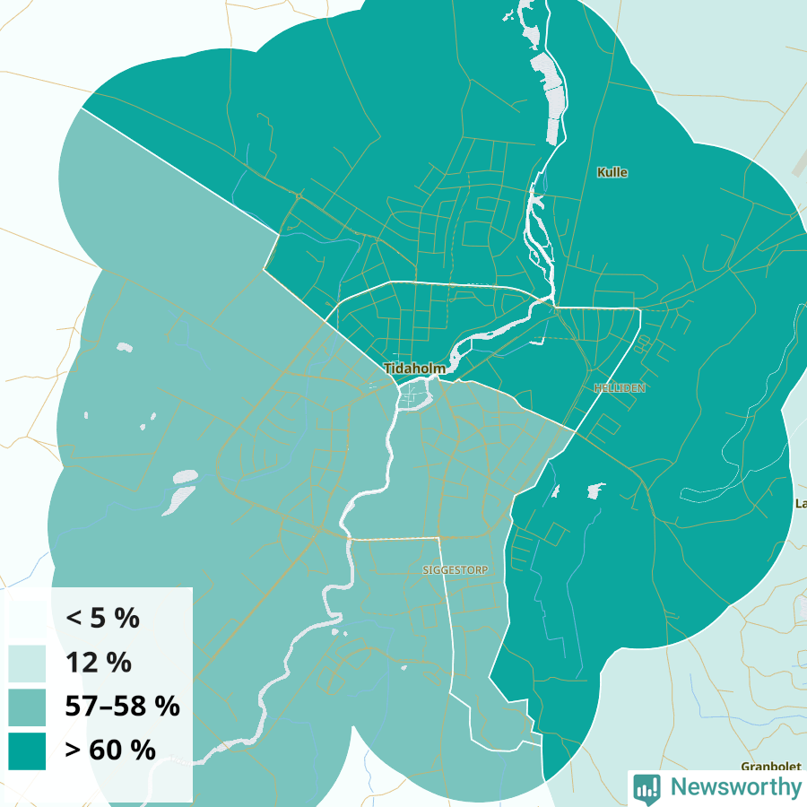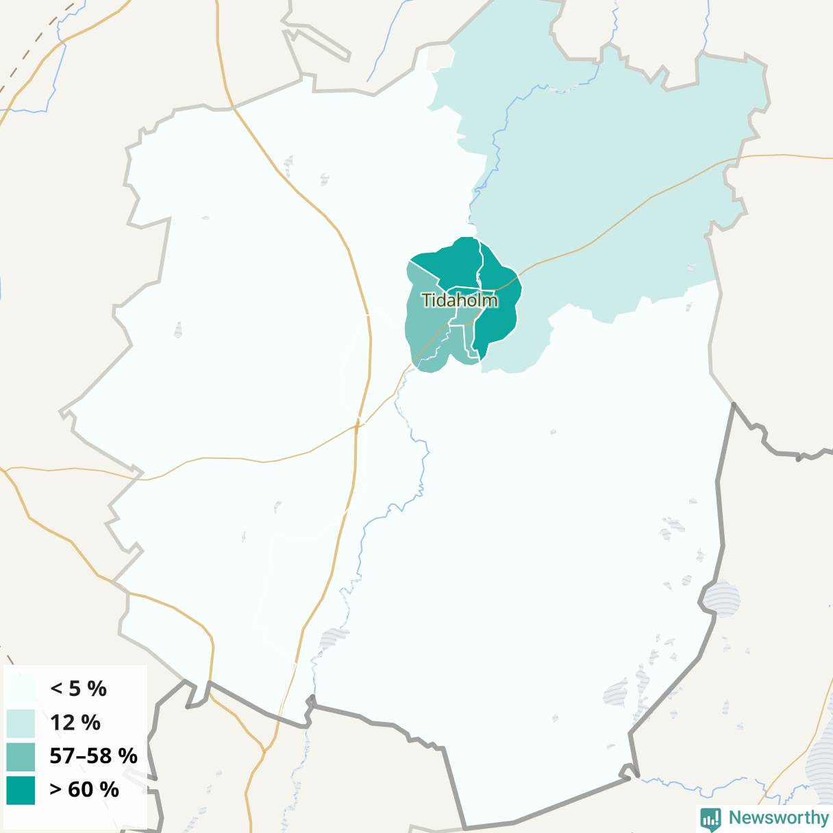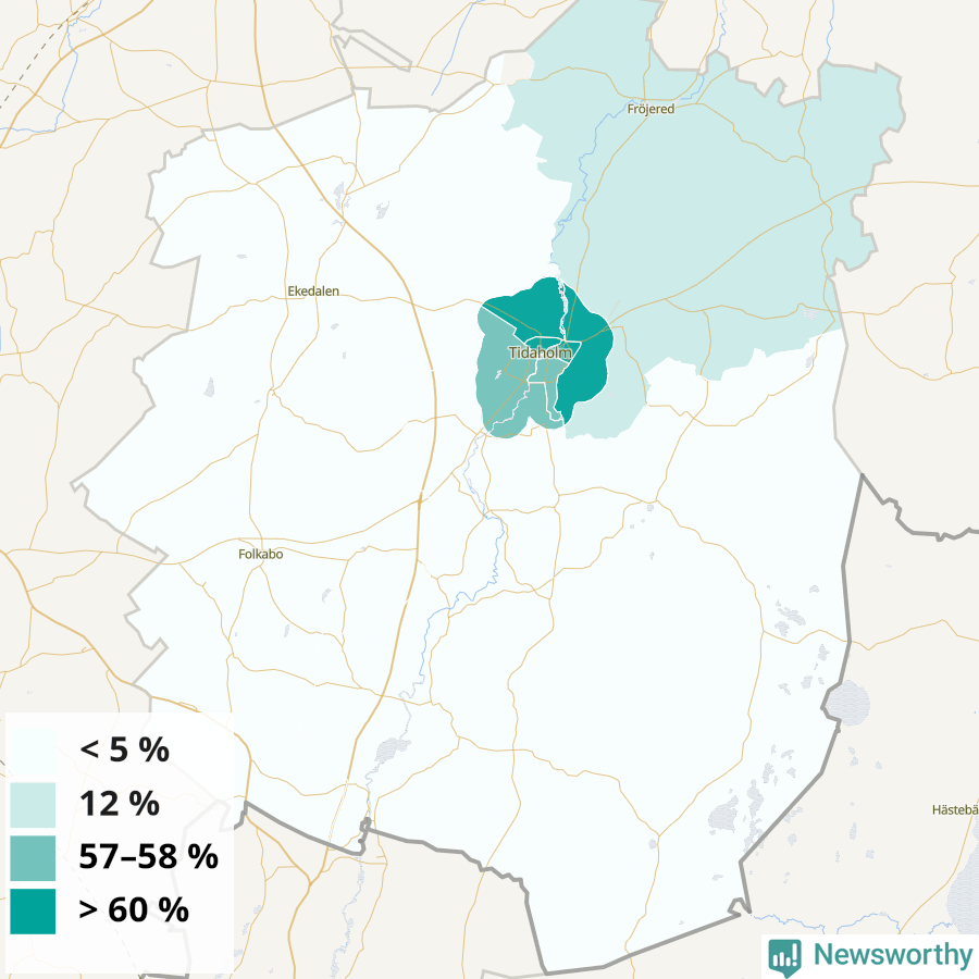 | Tidaholm | 40 % | 44 % | 36 % | Tidaholm östra (62 %) |