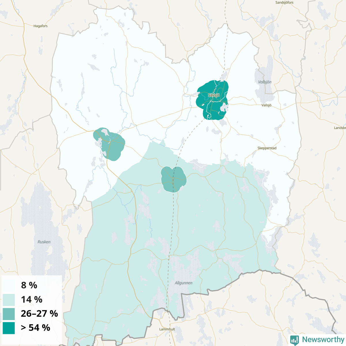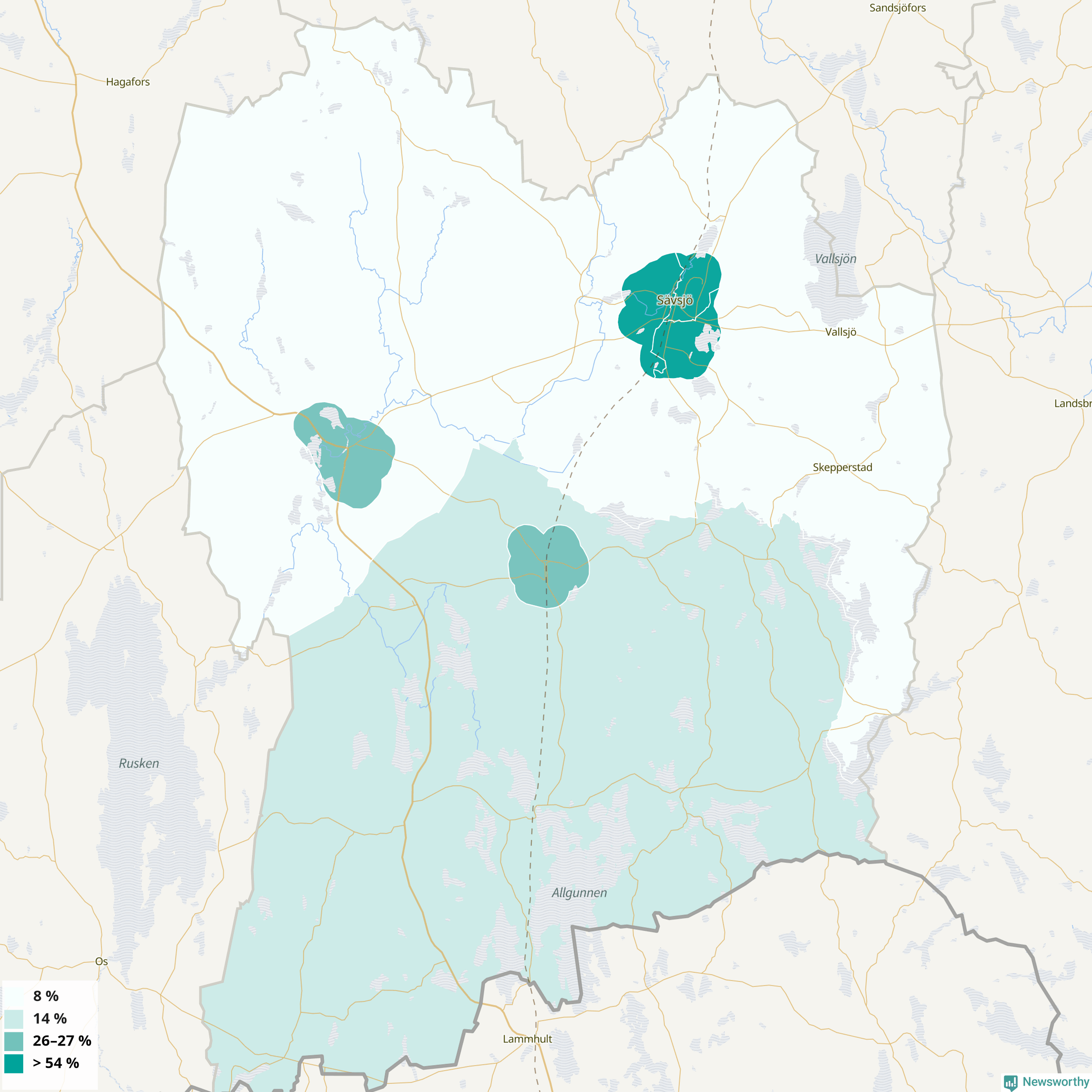 | Mullsjö | 32 % | 37 % | 27 % | Mullsjö tätort nordvästra (42 %) |