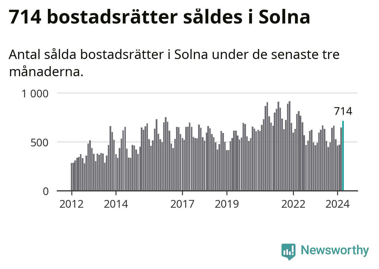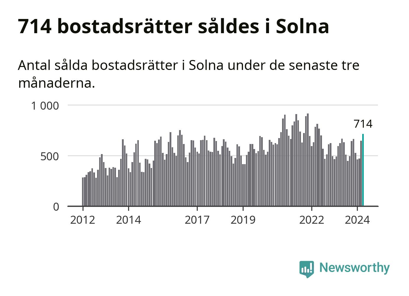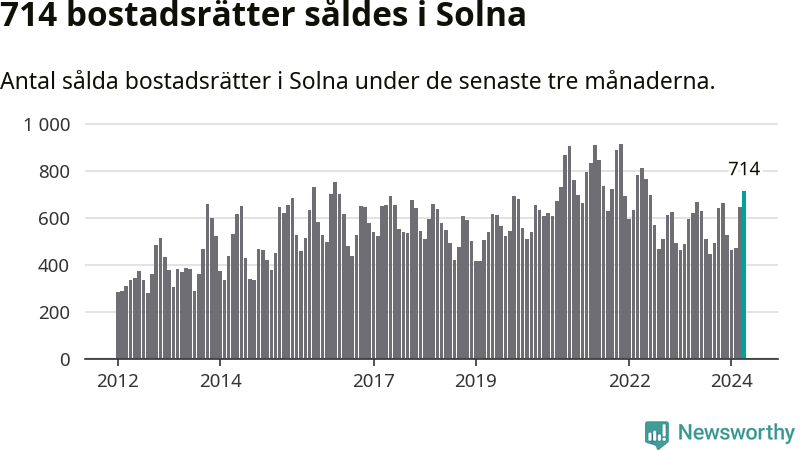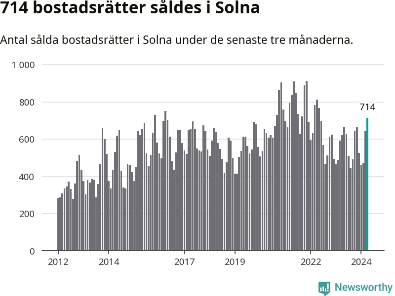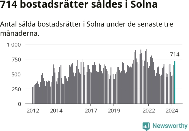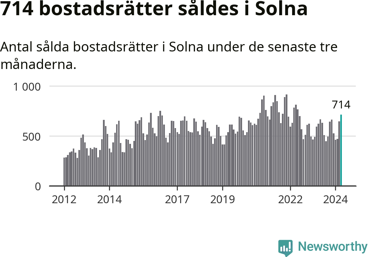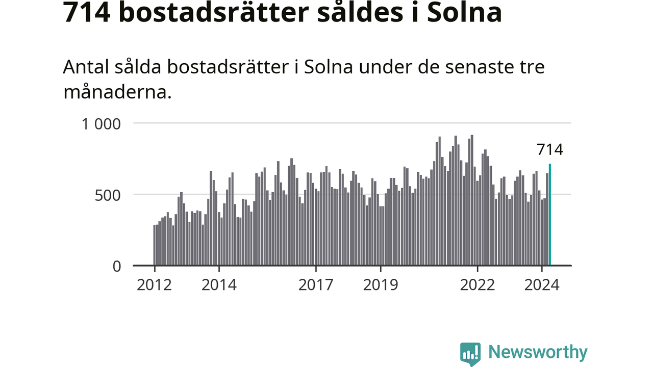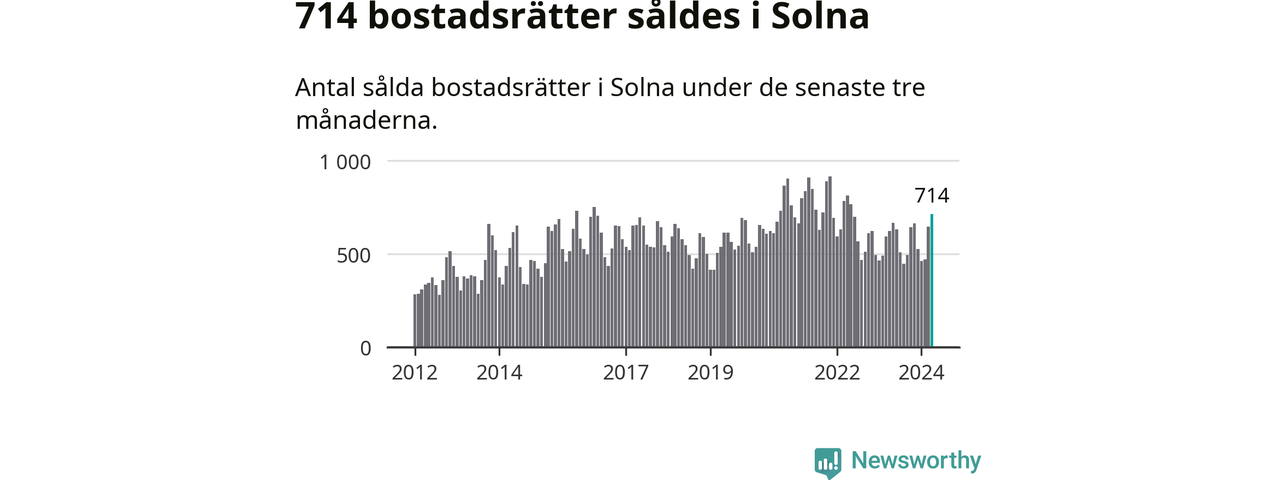 Sammanlagt såldes 714 bostadsrätter i Solna kommun mellan februari och april till ett genomsnittligt pris på 3,9 miljoner kronor. I fjol gjordes 622 affärer vid den här tiden på året.