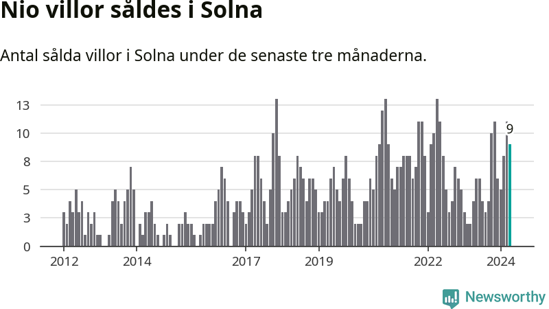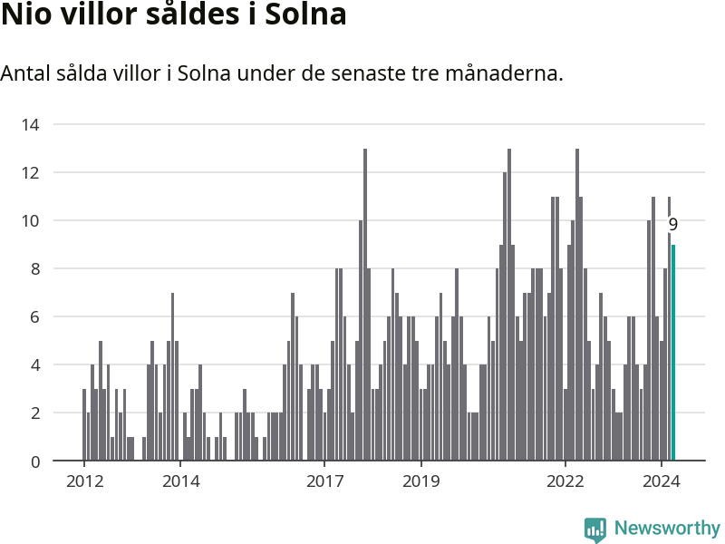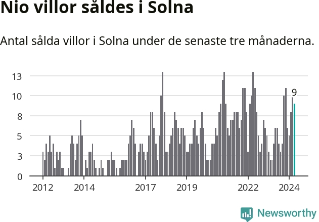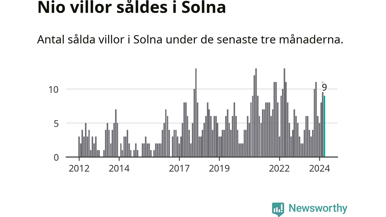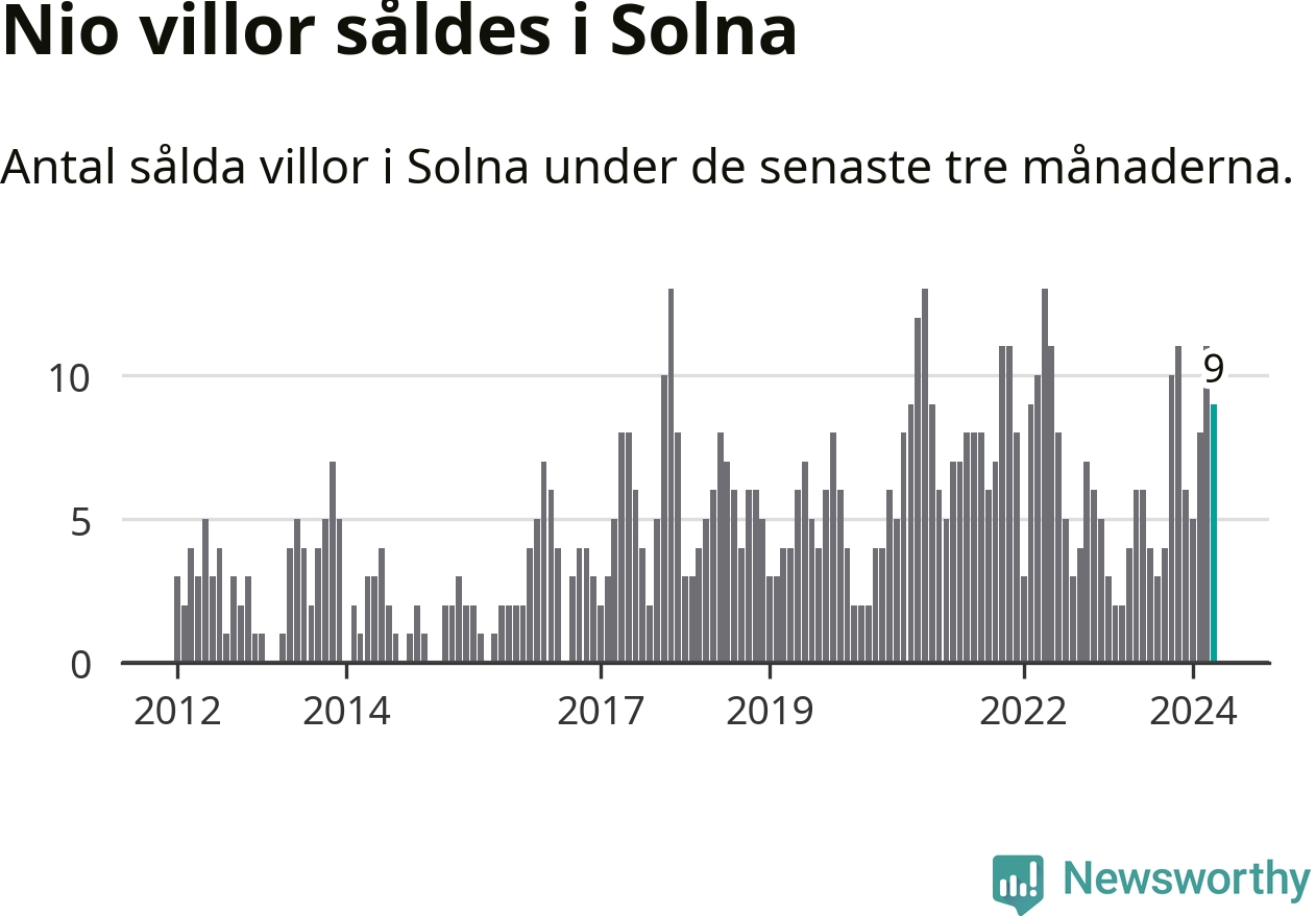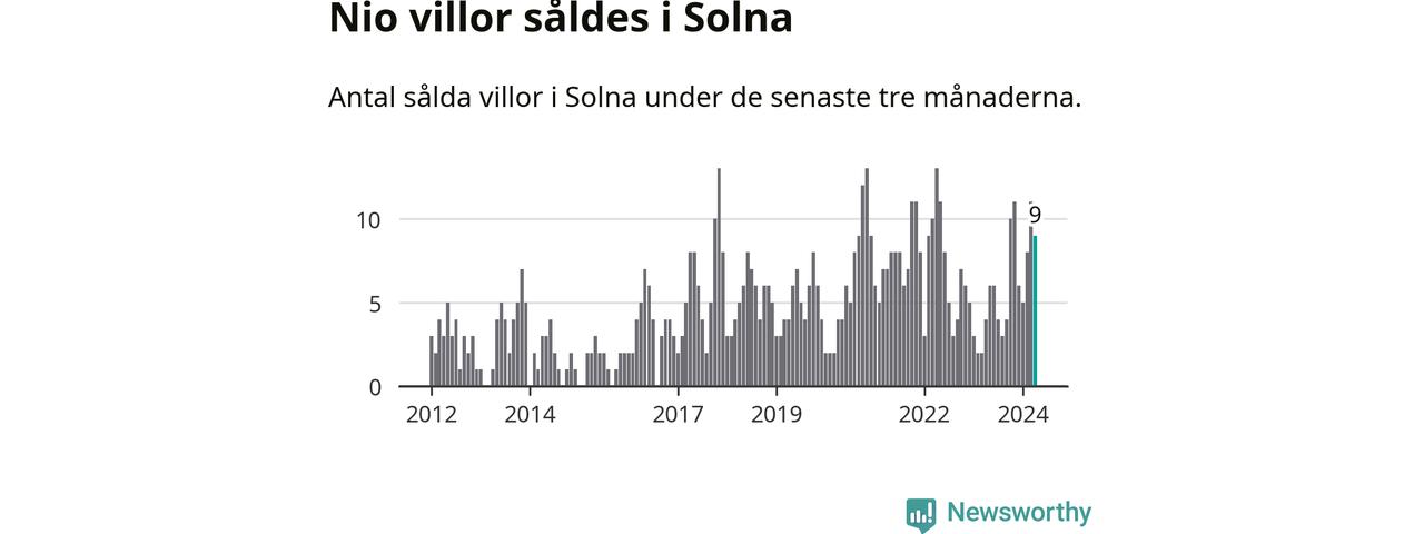 Mellan februari och april gjordes sammanlagt nio affärer med villor i Solna kommun. Det kan jämföras med fyra vid motsvarande tid i fjol.