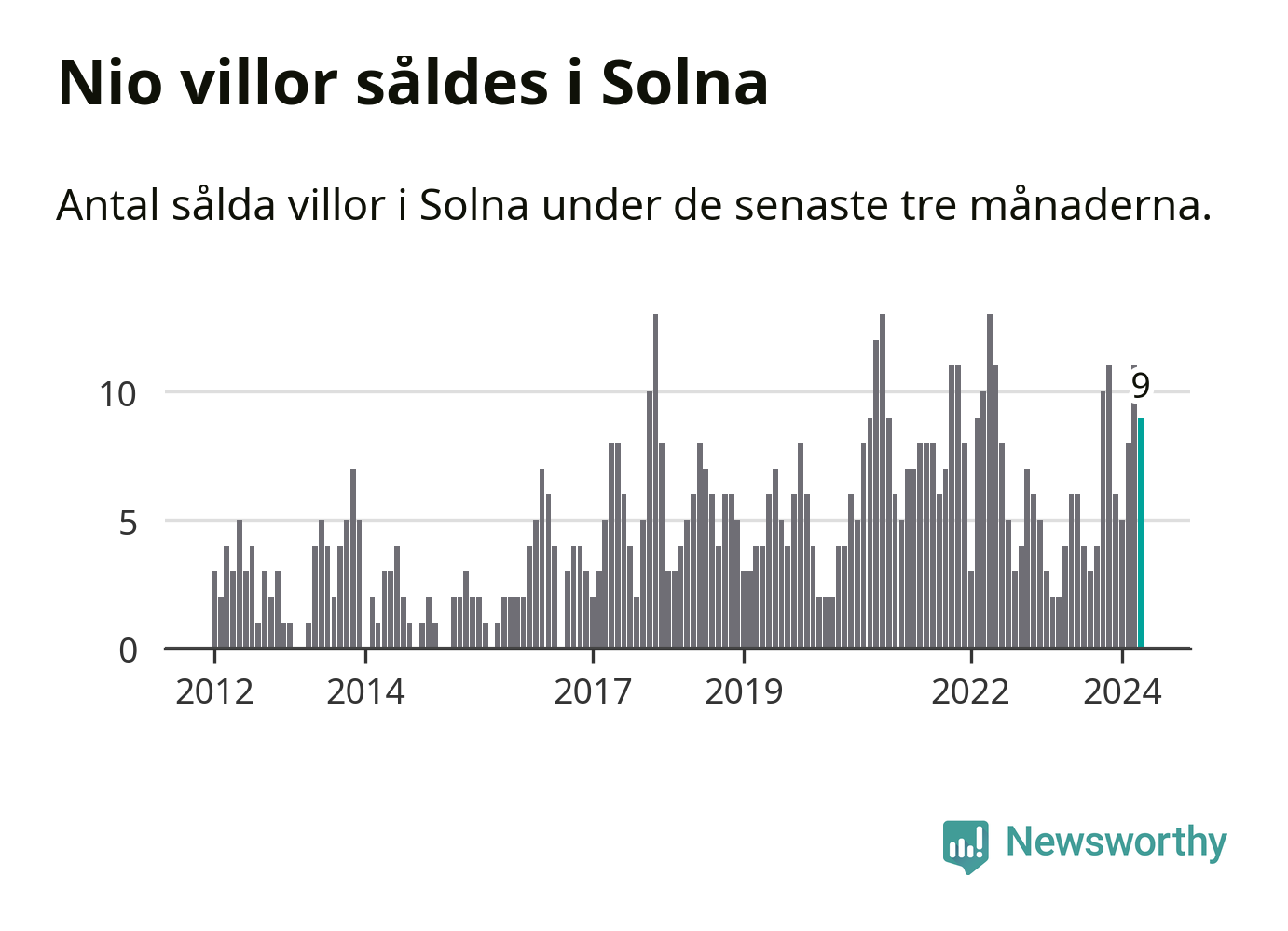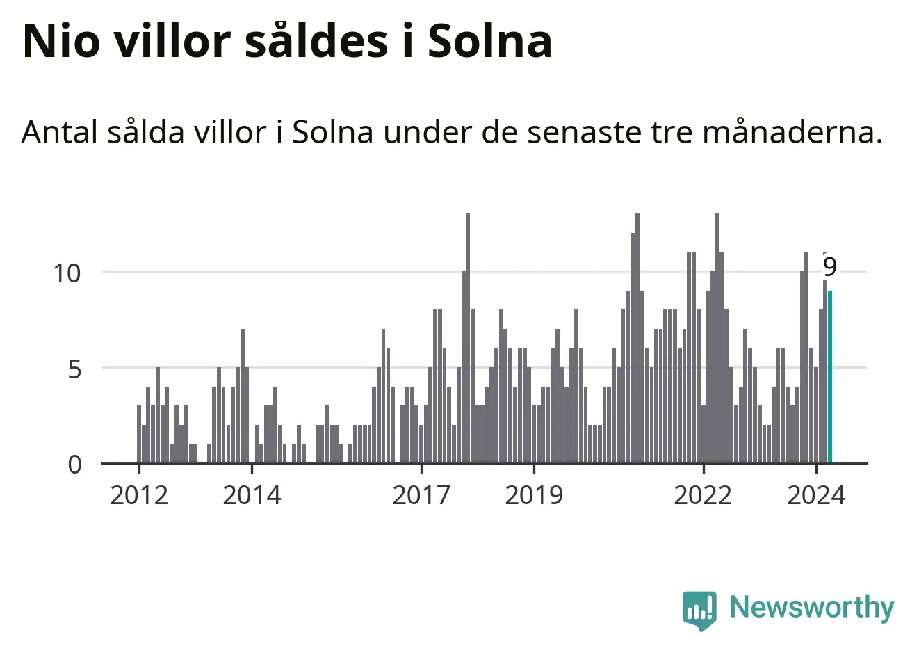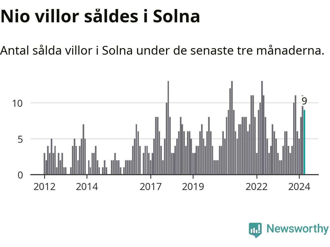 Mellan februari och april gjordes sammanlagt nio affärer med villor i Solna kommun. Det kan jämföras med fyra vid motsvarande tid i fjol.
