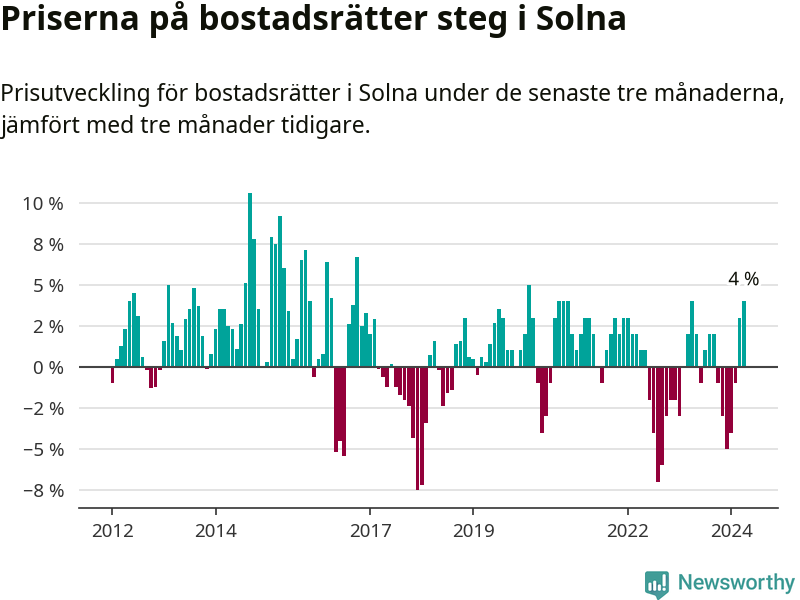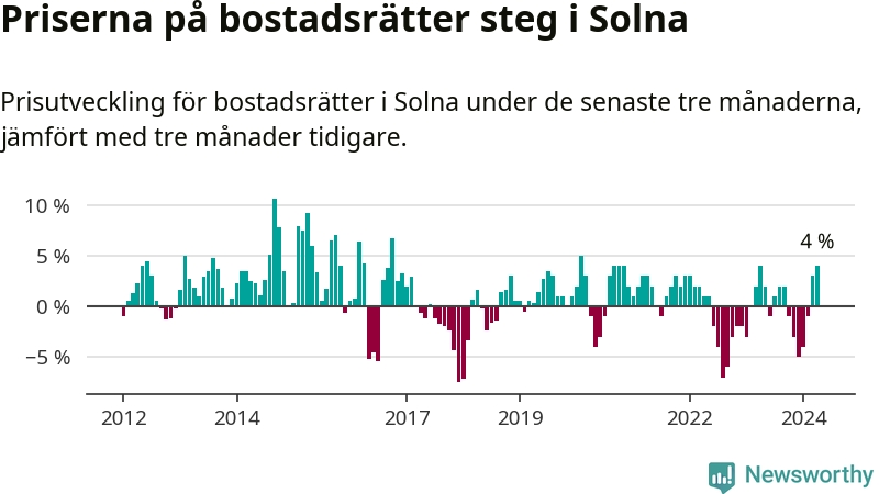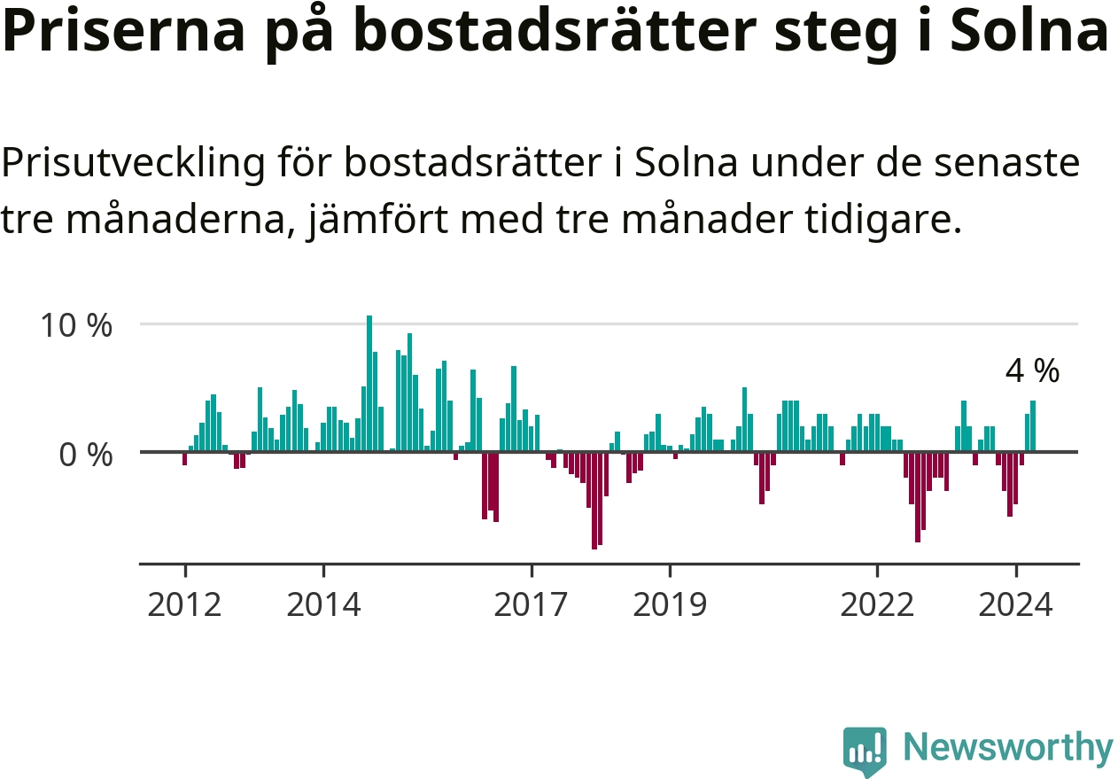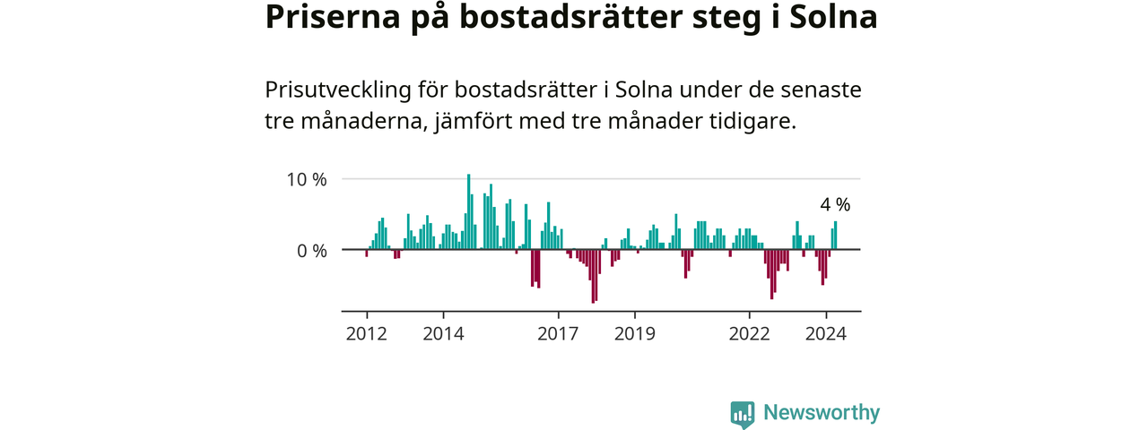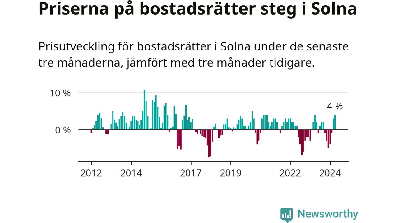 Priserna på bostadsrätter steg mellan februari och april med 4 procent i Solna kommun. Det är en betydande uppgång jämfört med det gångna året då priserna i snitt stått stilla.