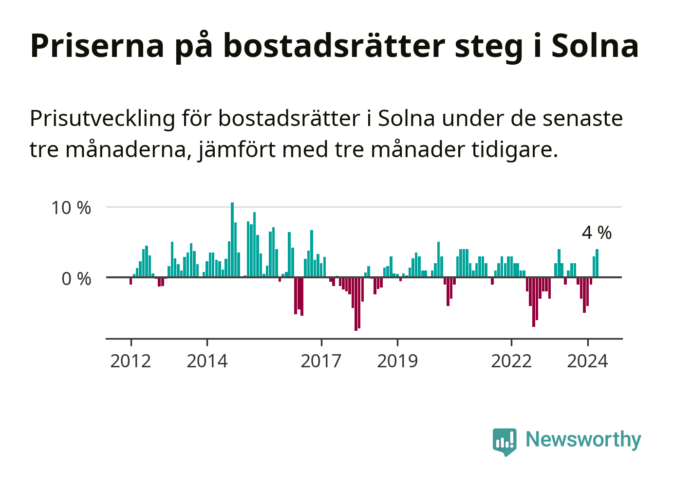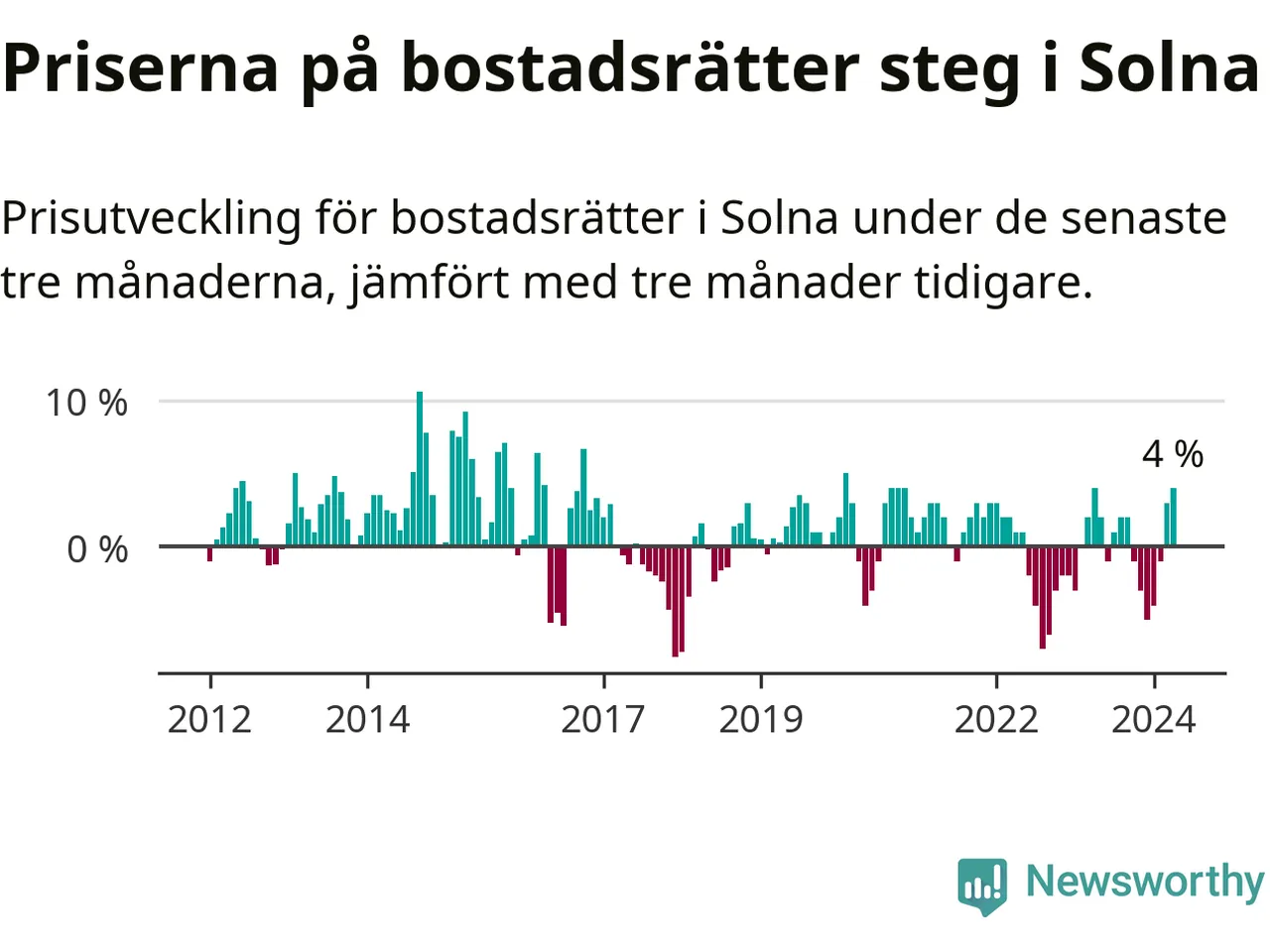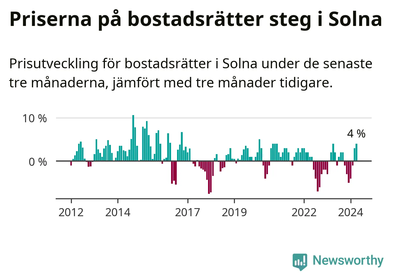 Priserna på bostadsrätter steg mellan februari och april med 4 procent i Solna kommun. Det är en betydande uppgång jämfört med det gångna året då priserna i snitt stått stilla.