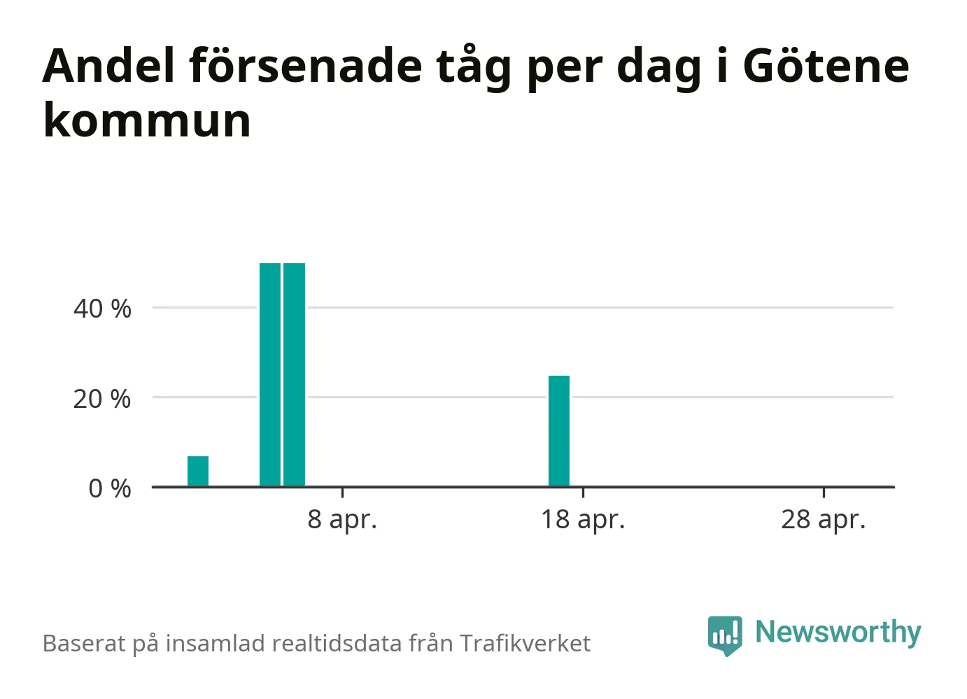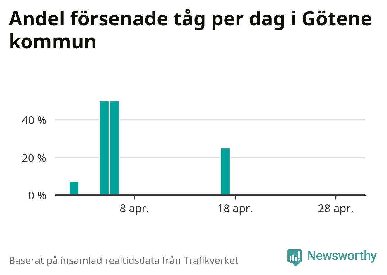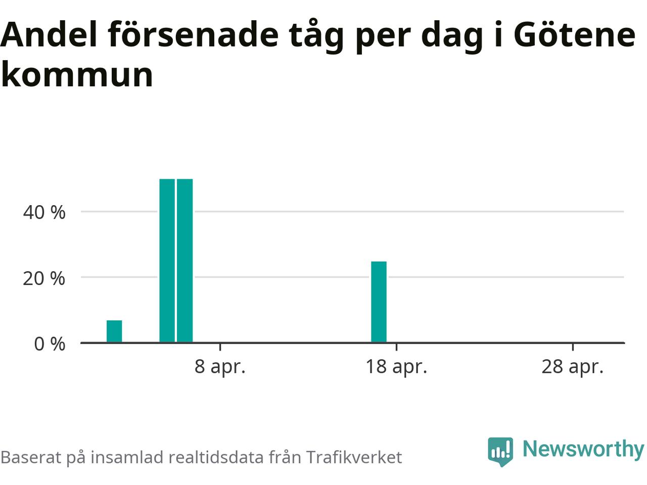 Totalt var sex procent av de ankommande tågen i Götene kommun mer än fem minuter försenade under april bland de tåg som angjorde någon av stationerna i kommunen. En procent var så mycket som en kvart försenade.