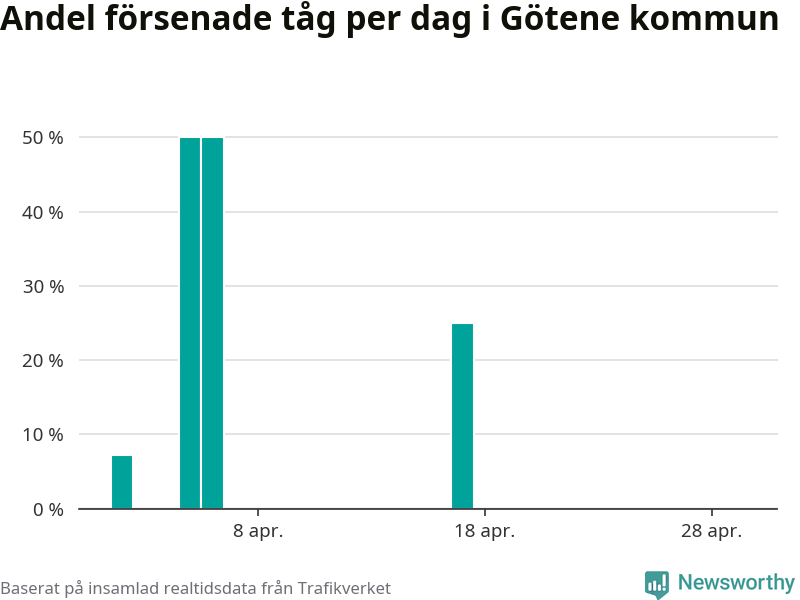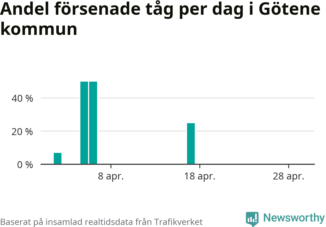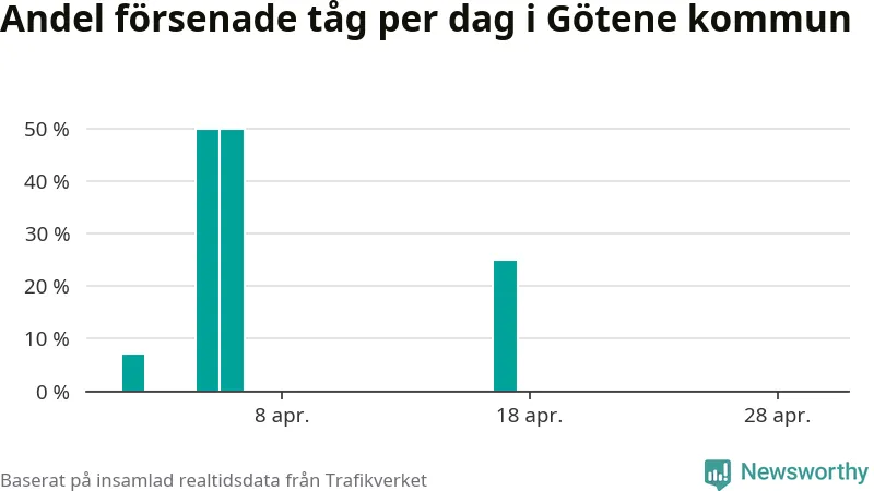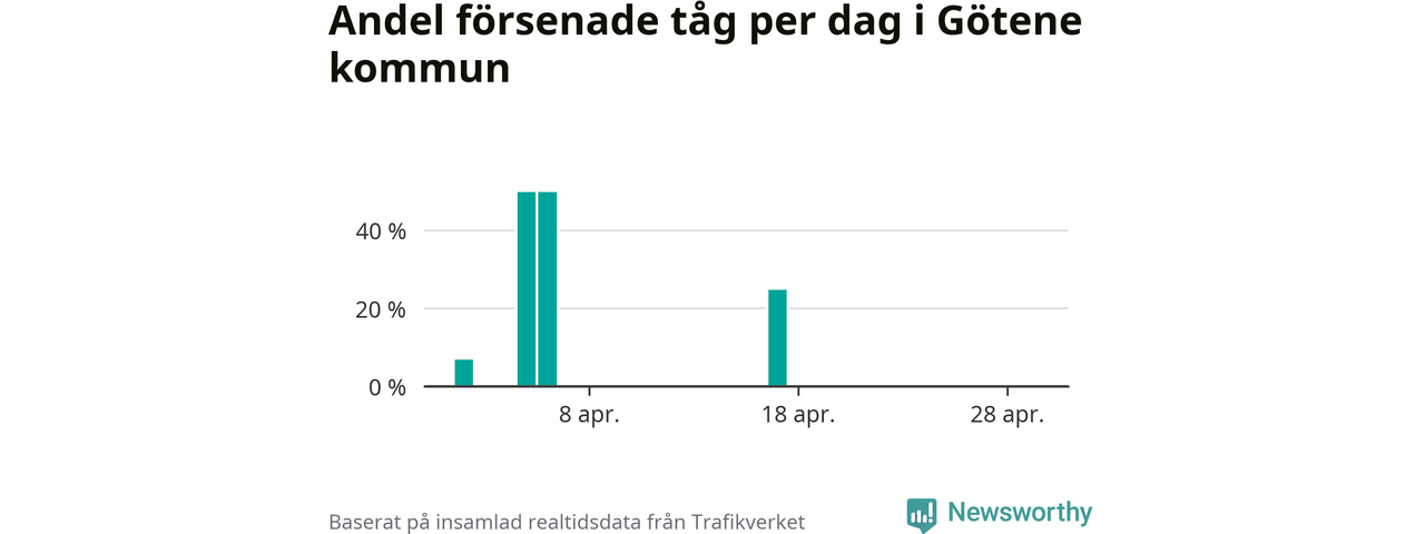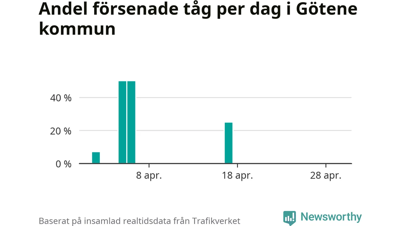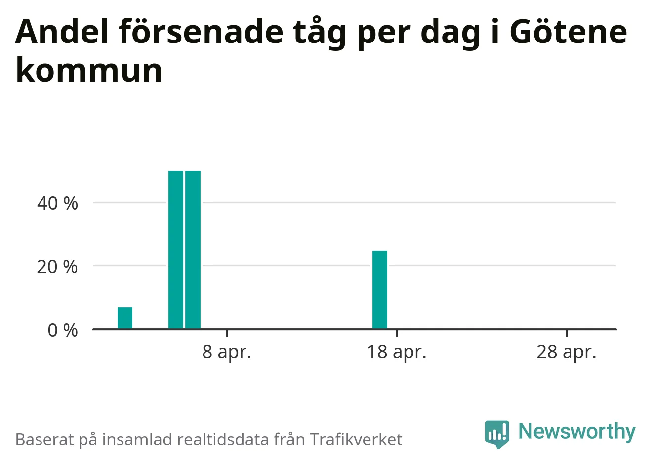 Totalt var sex procent av de ankommande tågen i Götene kommun mer än fem minuter försenade under april bland de tåg som angjorde någon av stationerna i kommunen. En procent var så mycket som en kvart försenade.