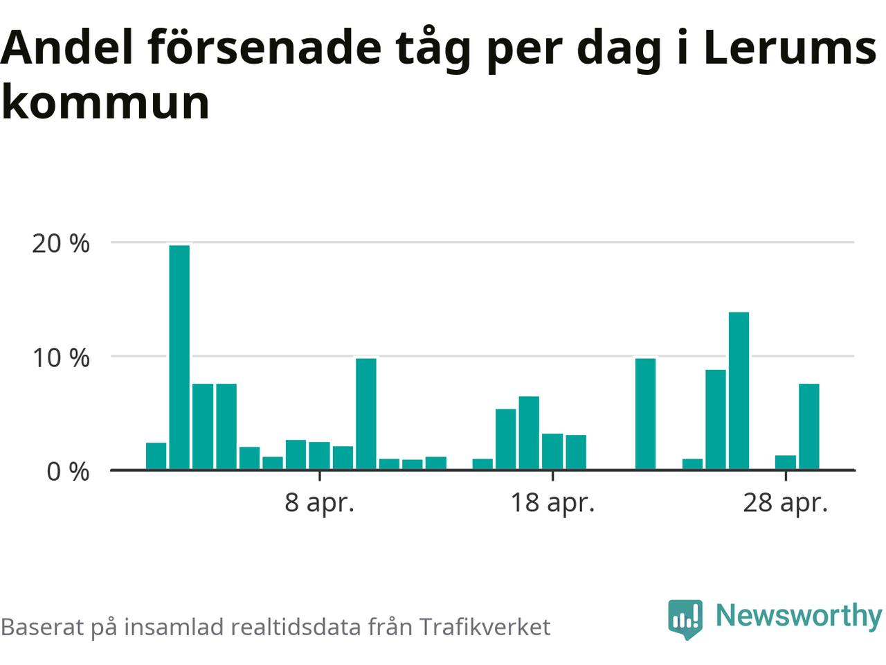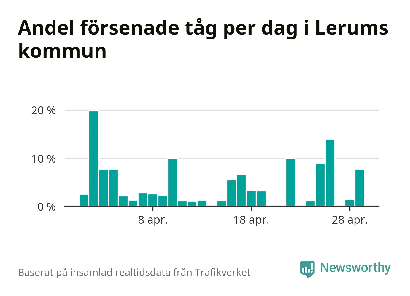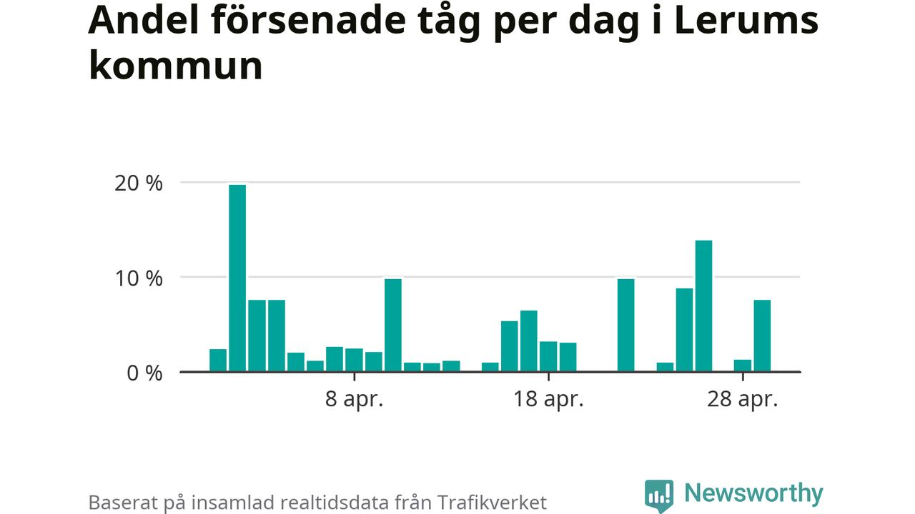Vårvintern har kantats av stora tågförseningar. Newsworthy har samlat in tågens ankomsttider under april, för att se hur stor andel av tågen till Lerums kommun som var i tid under månaden.