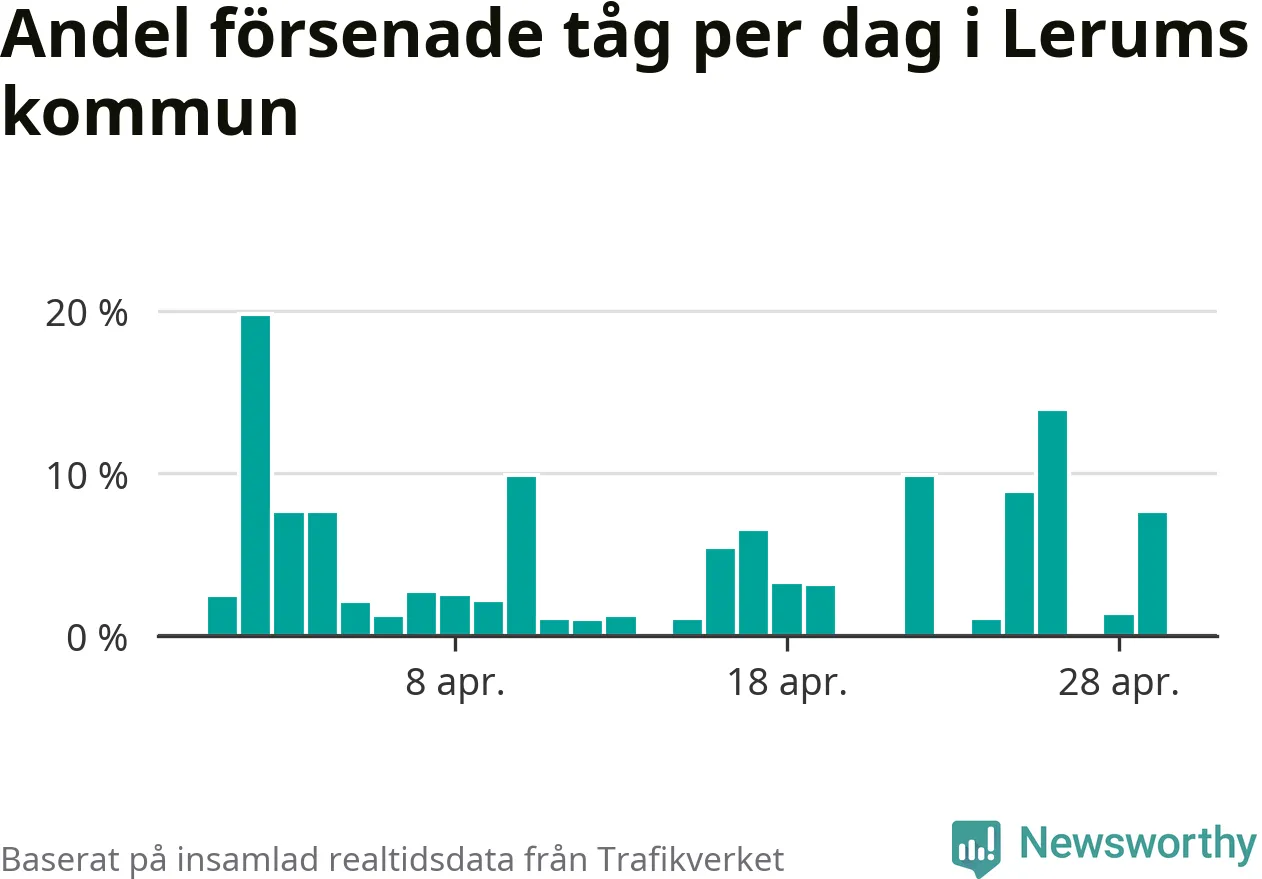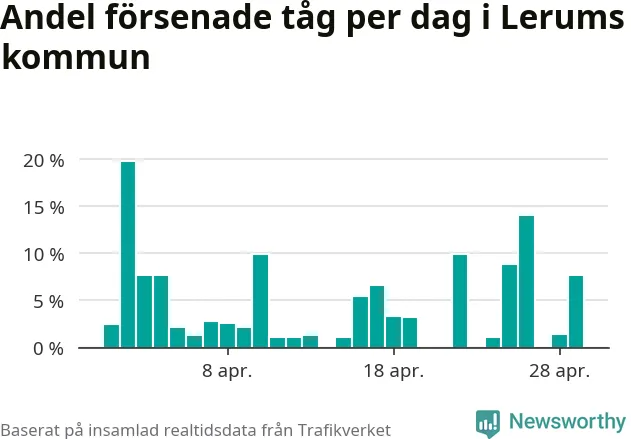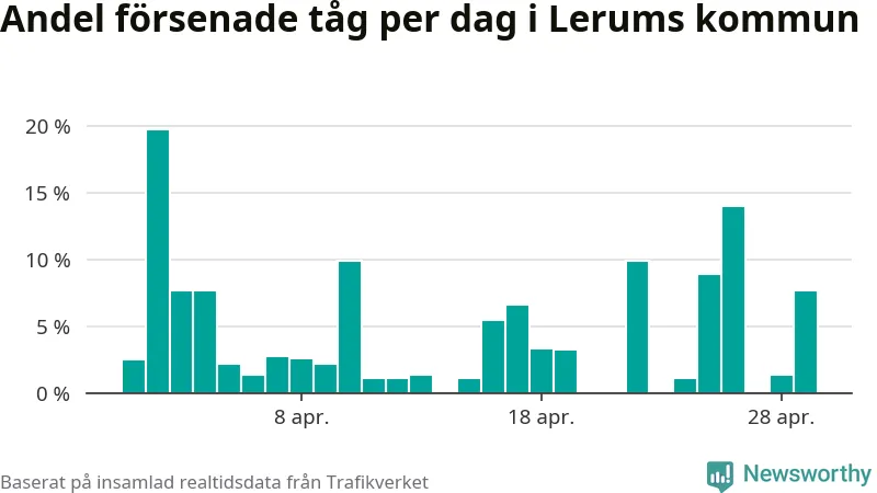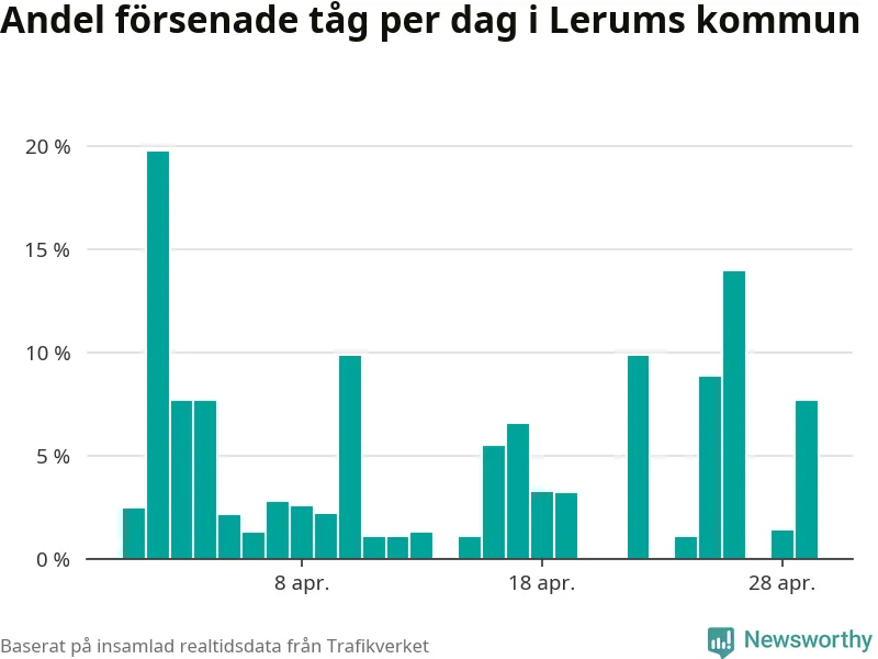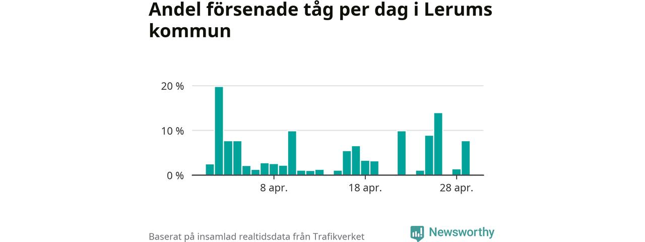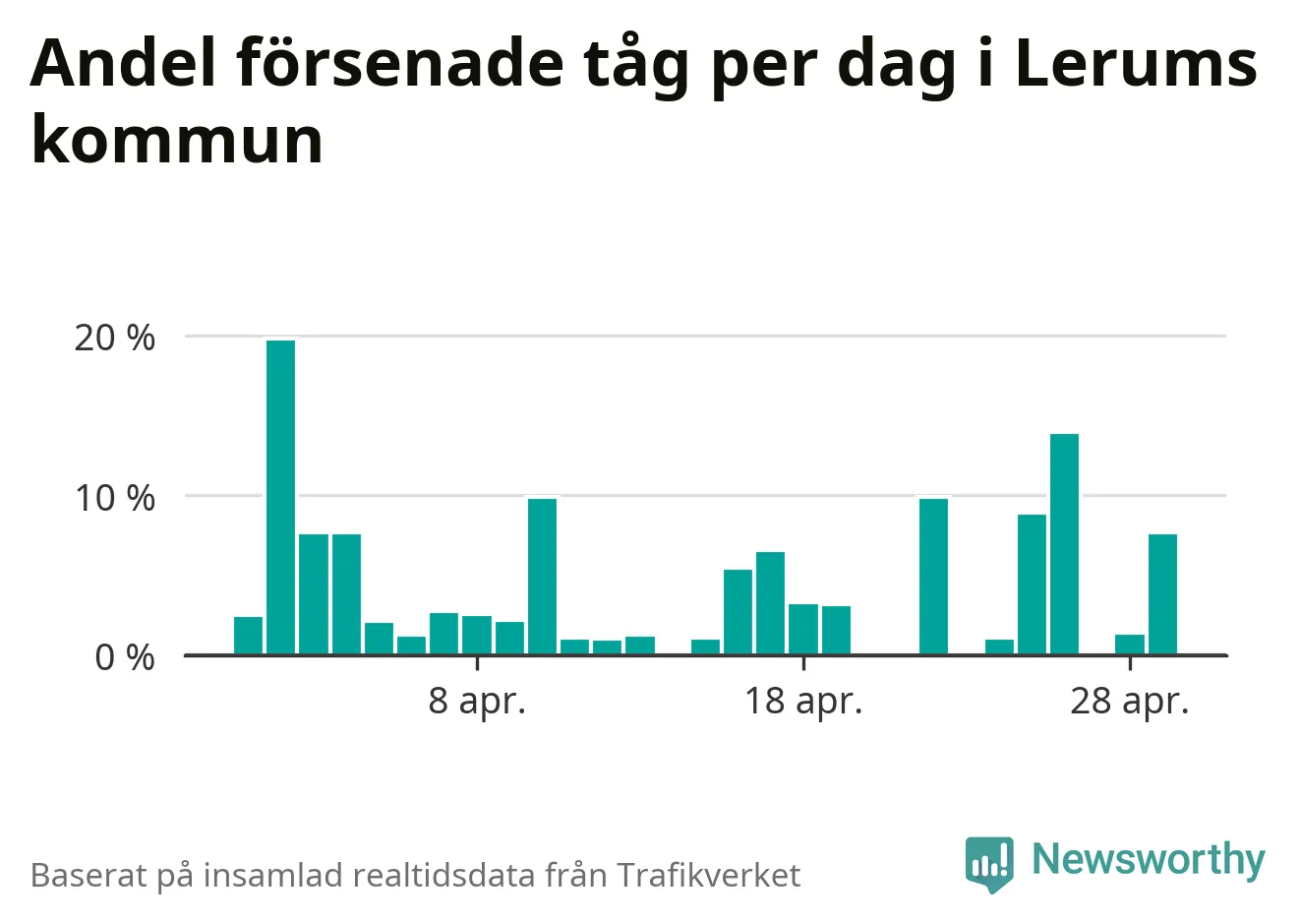 Vårvintern har kantats av stora tågförseningar. Newsworthy har samlat in tågens ankomsttider under april, för att se hur stor andel av tågen till Lerums kommun som var i tid under månaden.