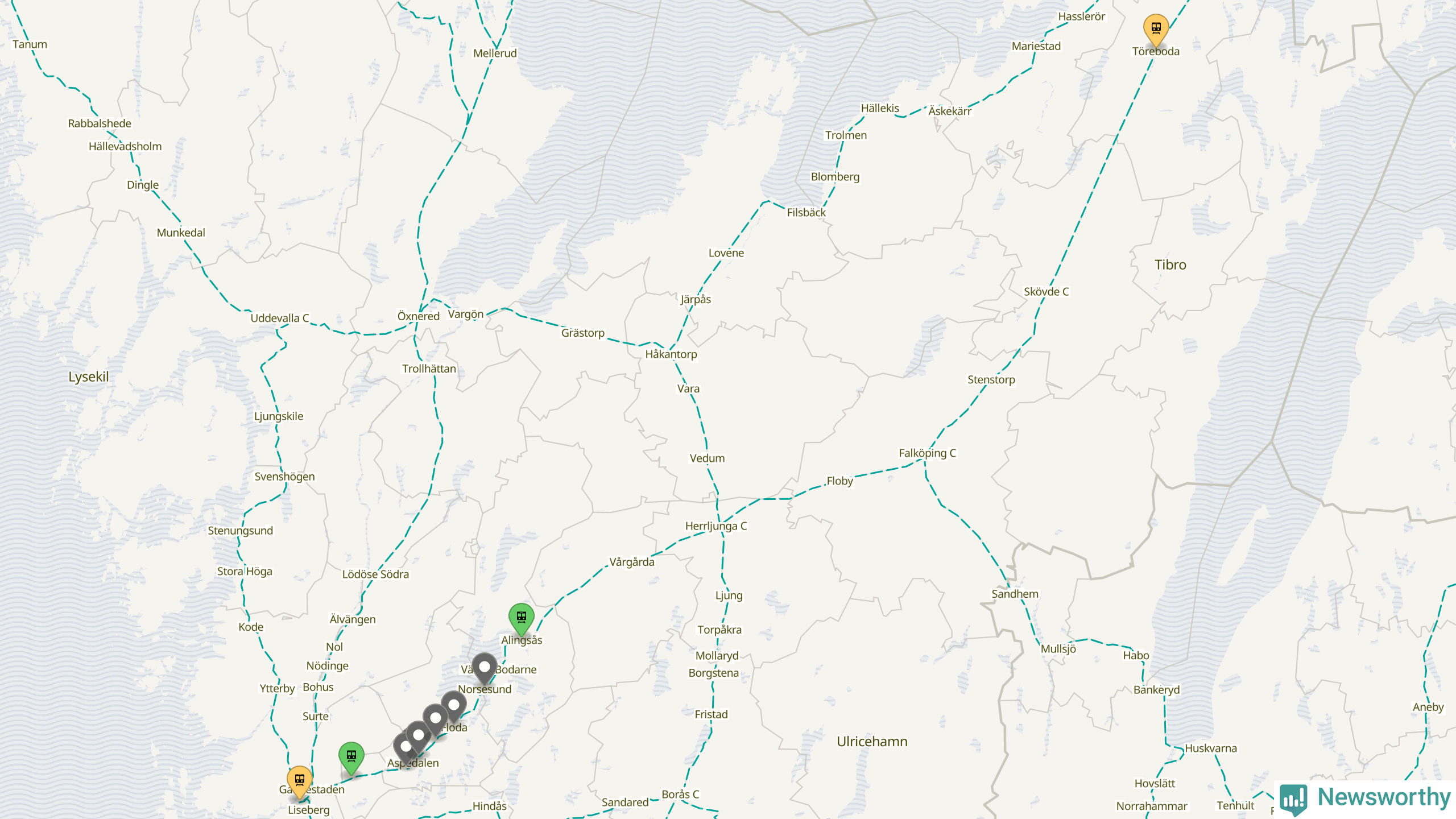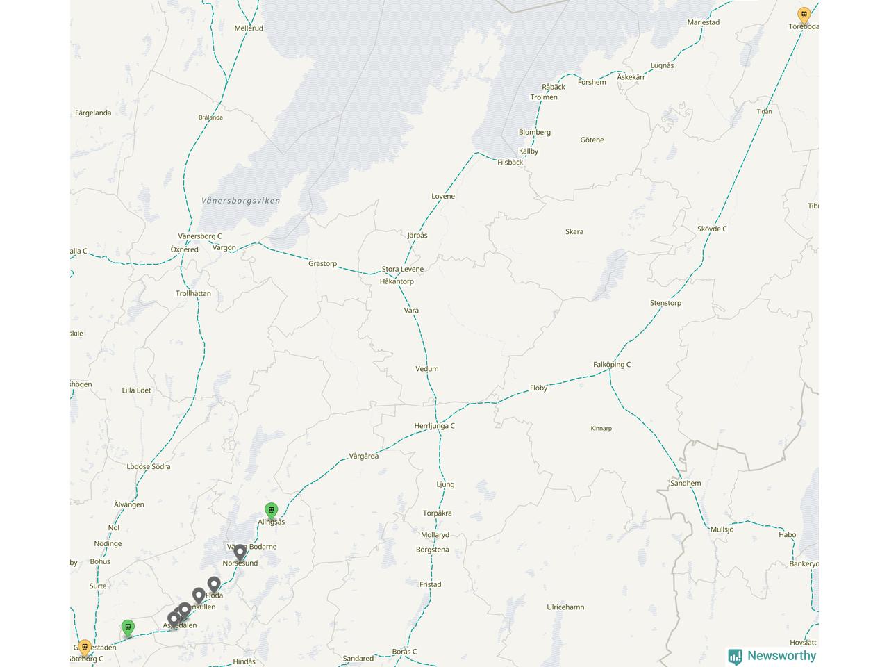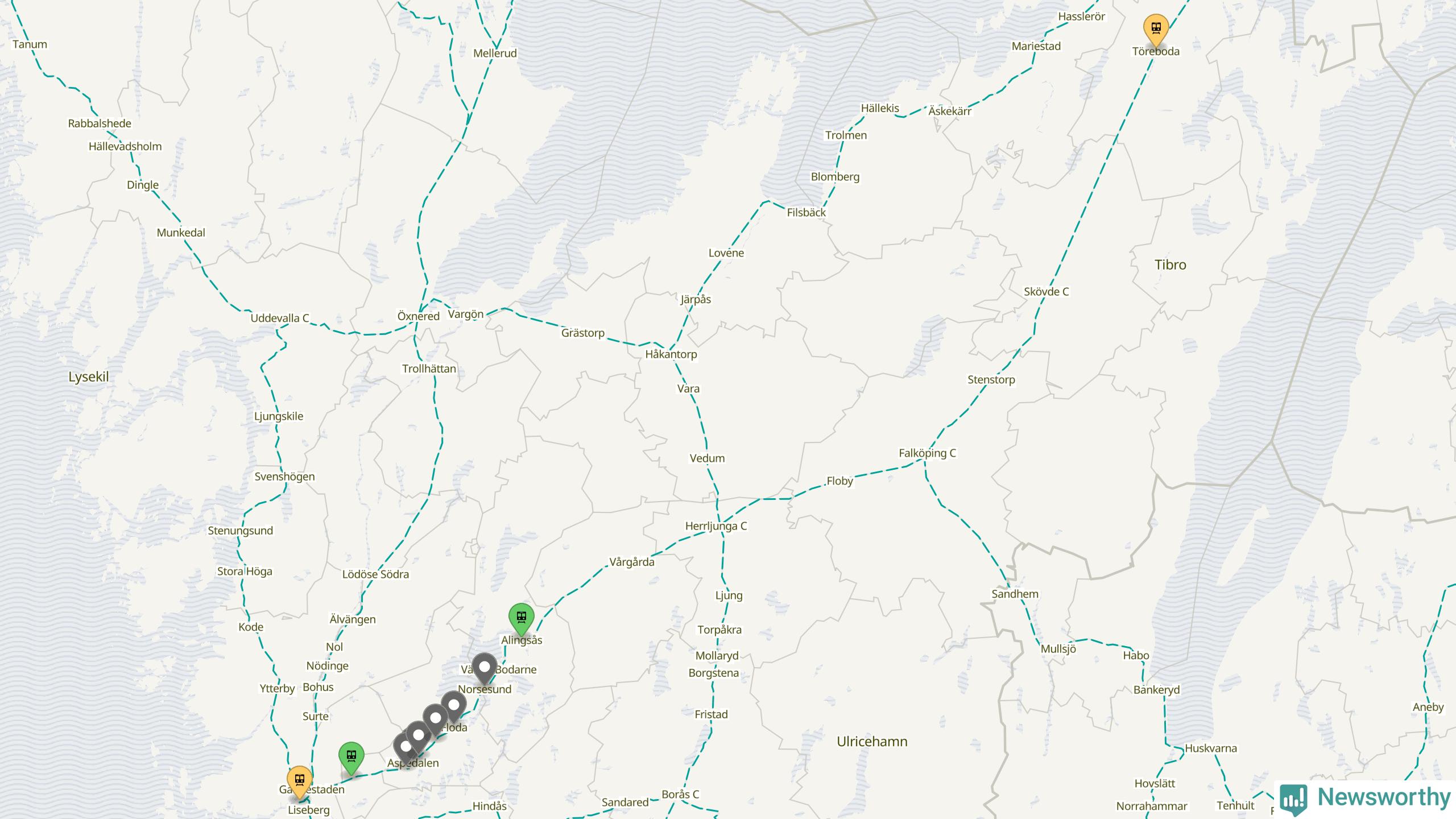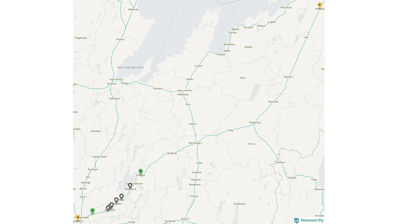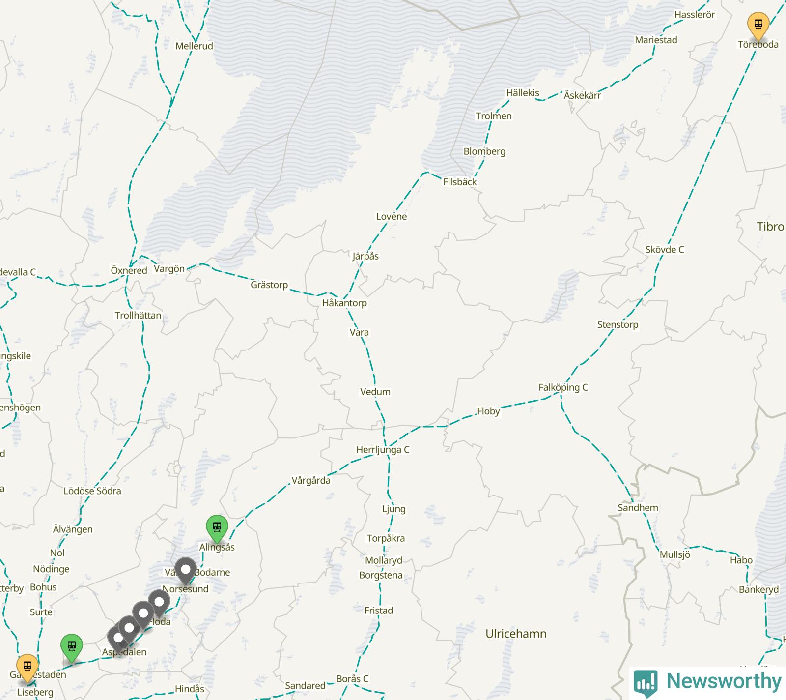 Kartdata från Mapbox, Newsworthy, OpenStreetMap och Trafikverket. Uppgifter om sträckor med passagerartrafik från jarnvag.net.