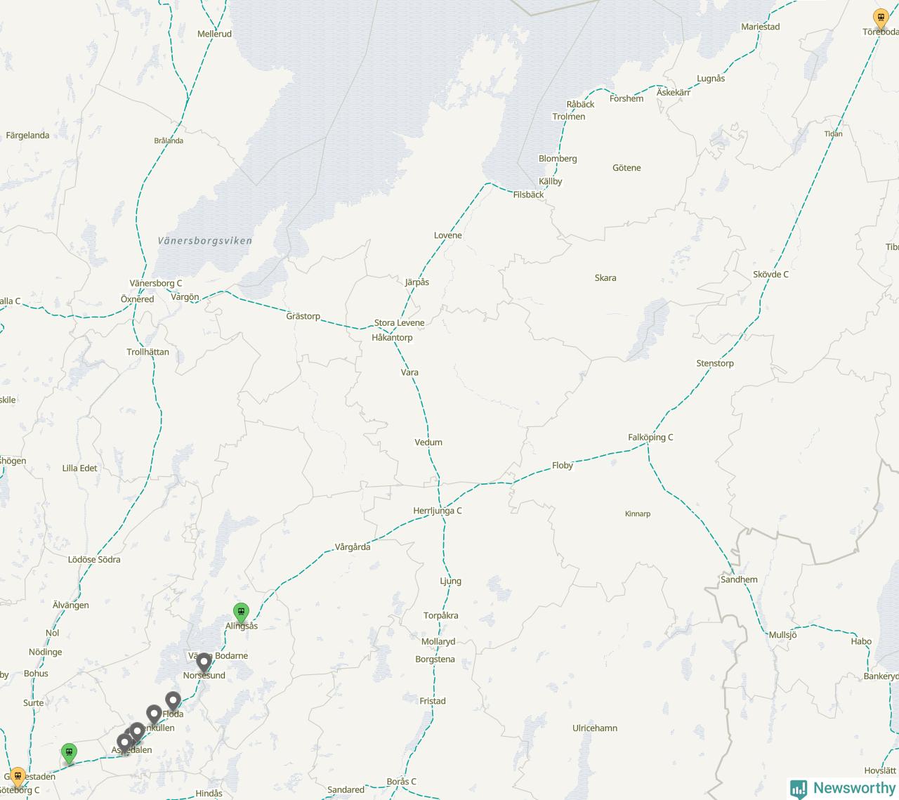 2 april 8.59–12.00trädStopp i tågtrafiken mellan Vara och Vedum sedan kl 09:00 på grund av träd mot kontaktledningen