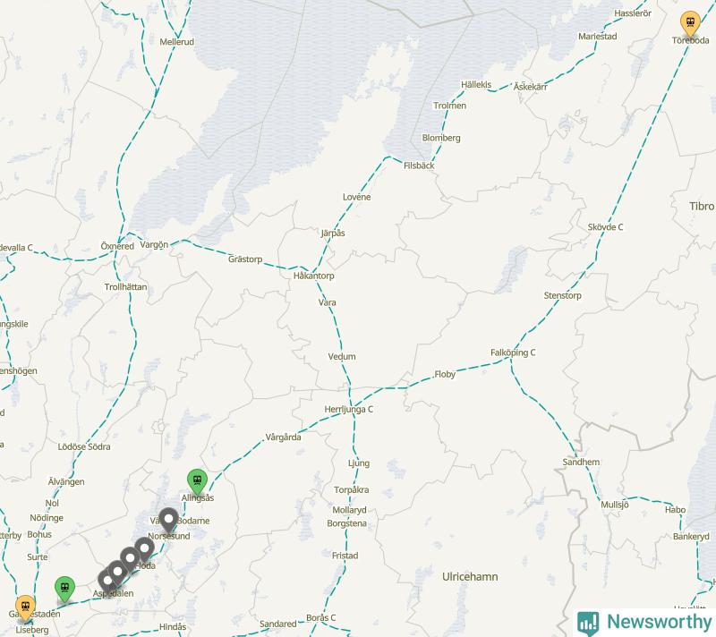 2 april 11.36–21.30trädStopp i tågtrafiken mellan Vedum och Vara sedan kl 11:30 på grund av träd mot kontaktledningen