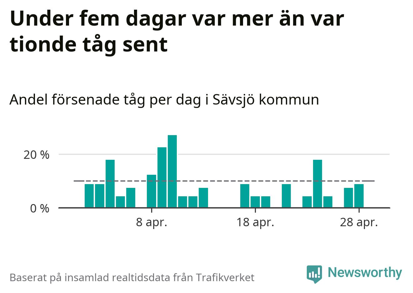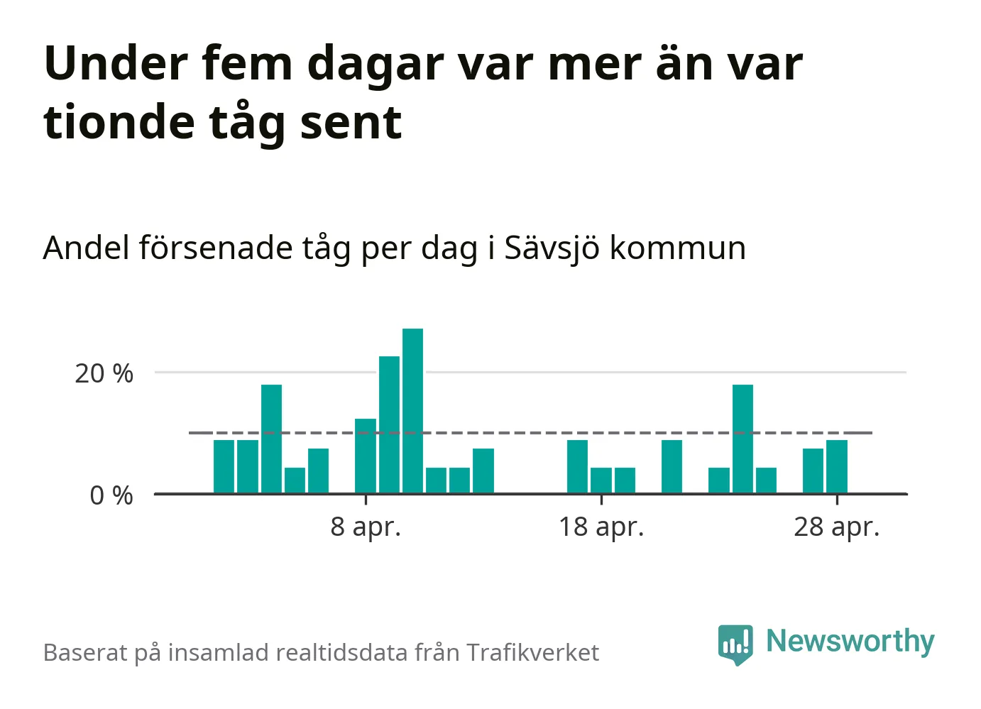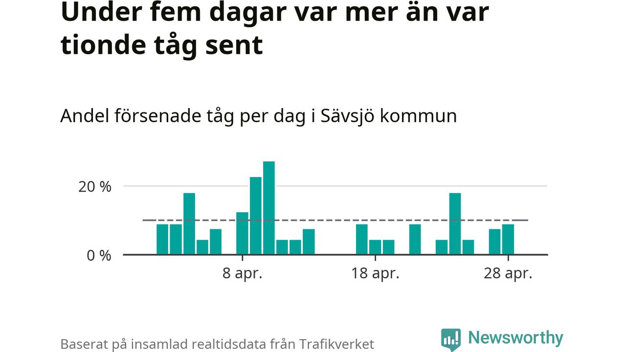 Vårvintern har kantats av stora tågförseningar. Newsworthy har samlat in tågens ankomsttider under april, för att se hur stor andel av tågen till Sävsjö kommun som var i tid under månaden.