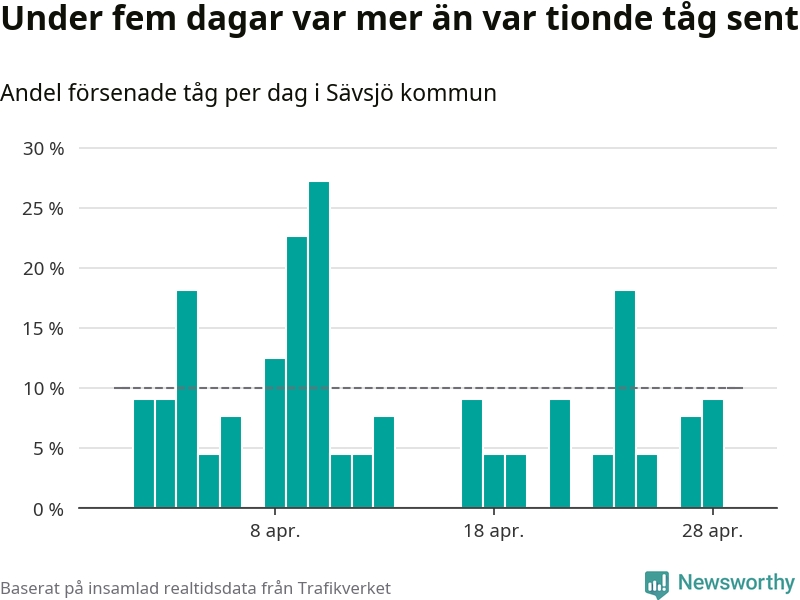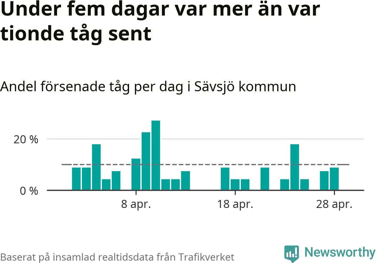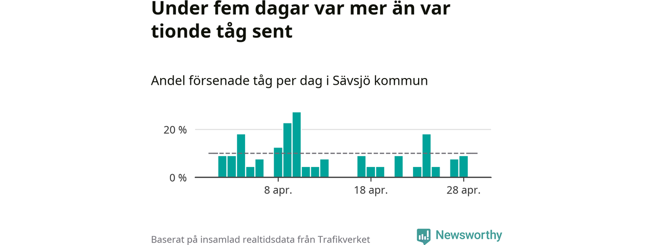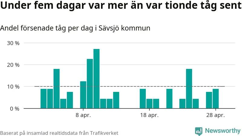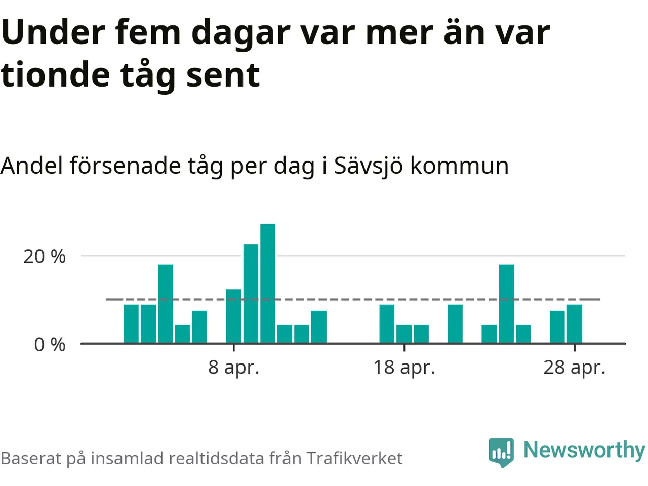 Vårvintern har kantats av stora tågförseningar. Newsworthy har samlat in tågens ankomsttider under april, för att se hur stor andel av tågen till Sävsjö kommun som var i tid under månaden.