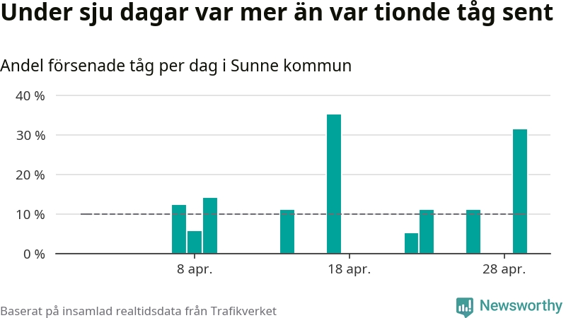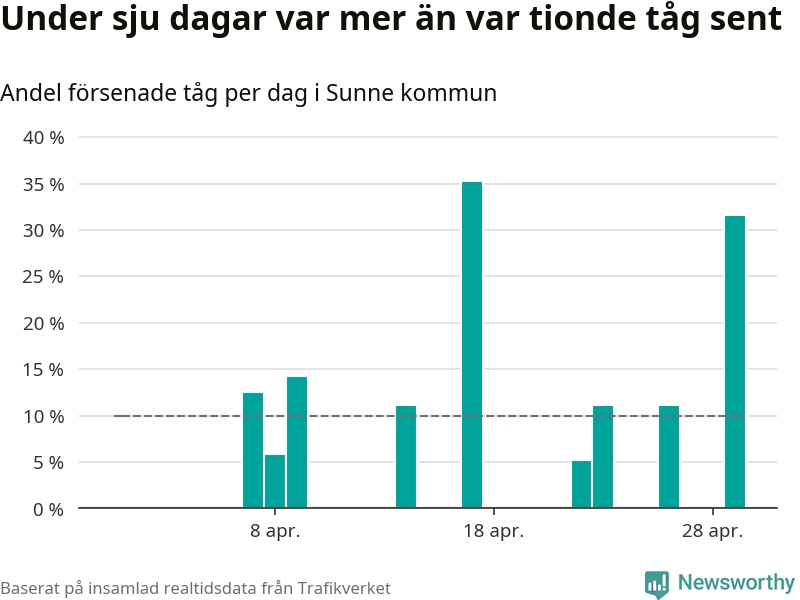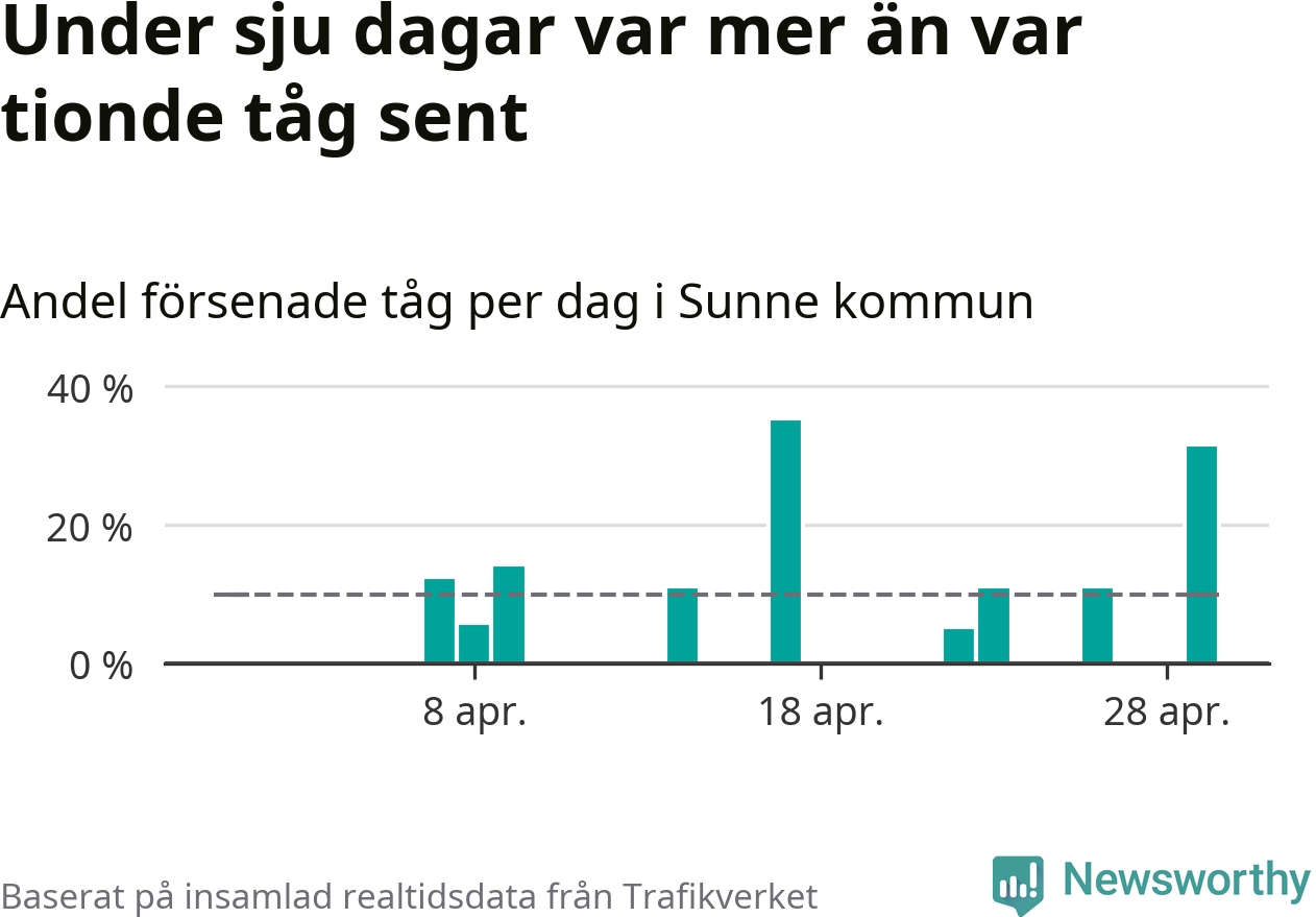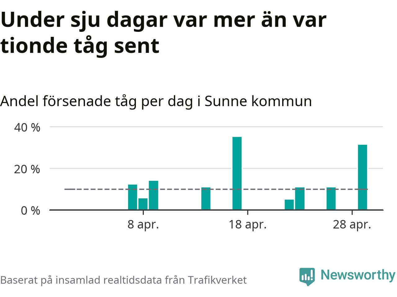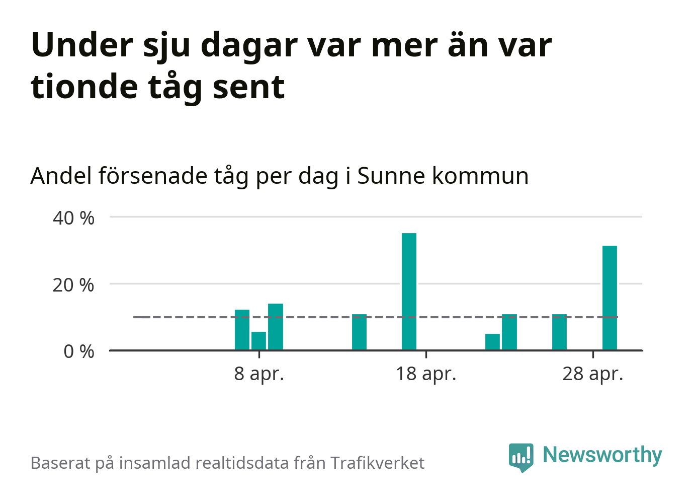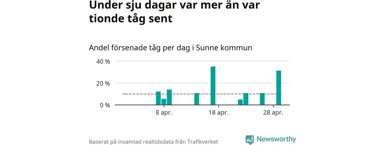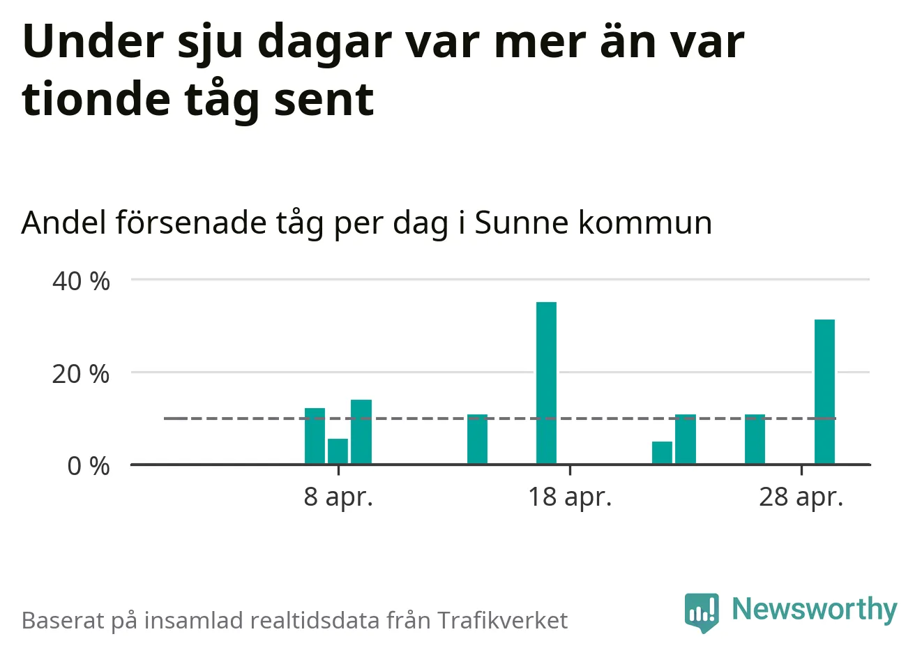 Så många som 17 procent av tågen i Sunne kommun ställdes in under april. Det visar Newsworthys sammanställning av alla sena och inställda förra månaden.