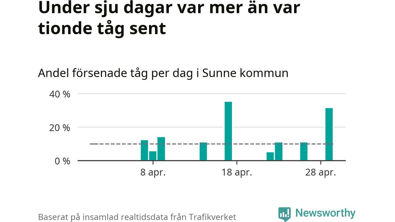 Totalt var sex procent av de ankommande tågen i Sunne kommun mer än fem minuter försenade under april bland de tåg som angjorde någon av stationerna i kommunen. Två procent var så mycket som en kvart försenade.