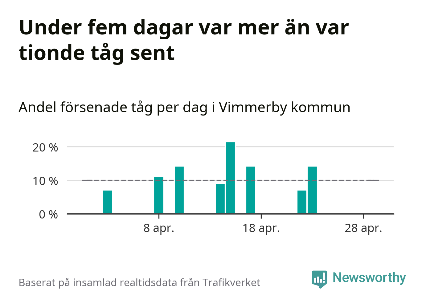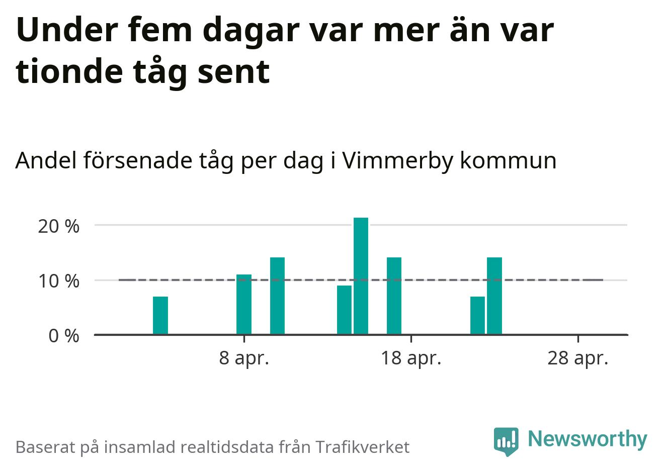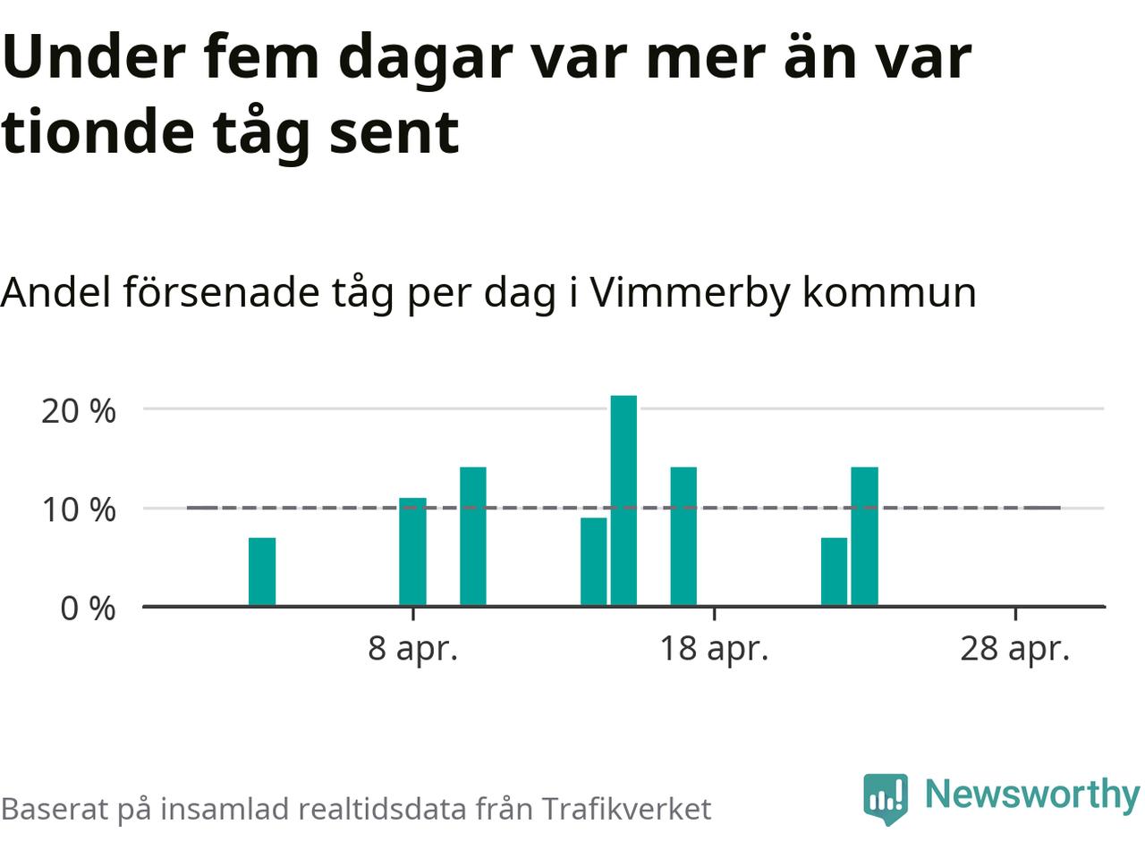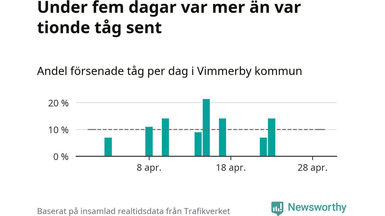 Så många som elva procent av tågen i Vimmerby kommun ställdes in under april. Det visar Newsworthys sammanställning av alla sena och inställda förra månaden.