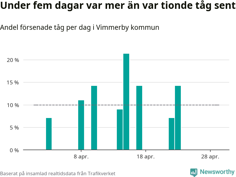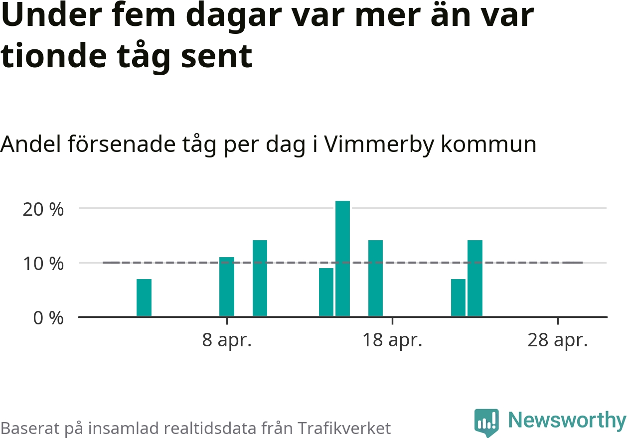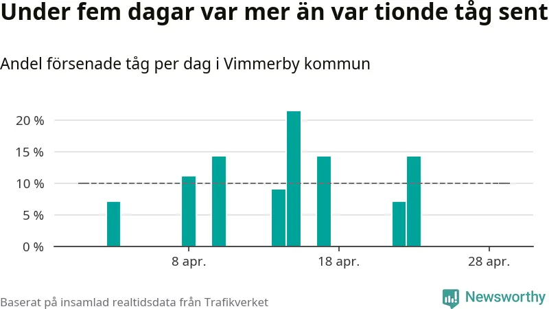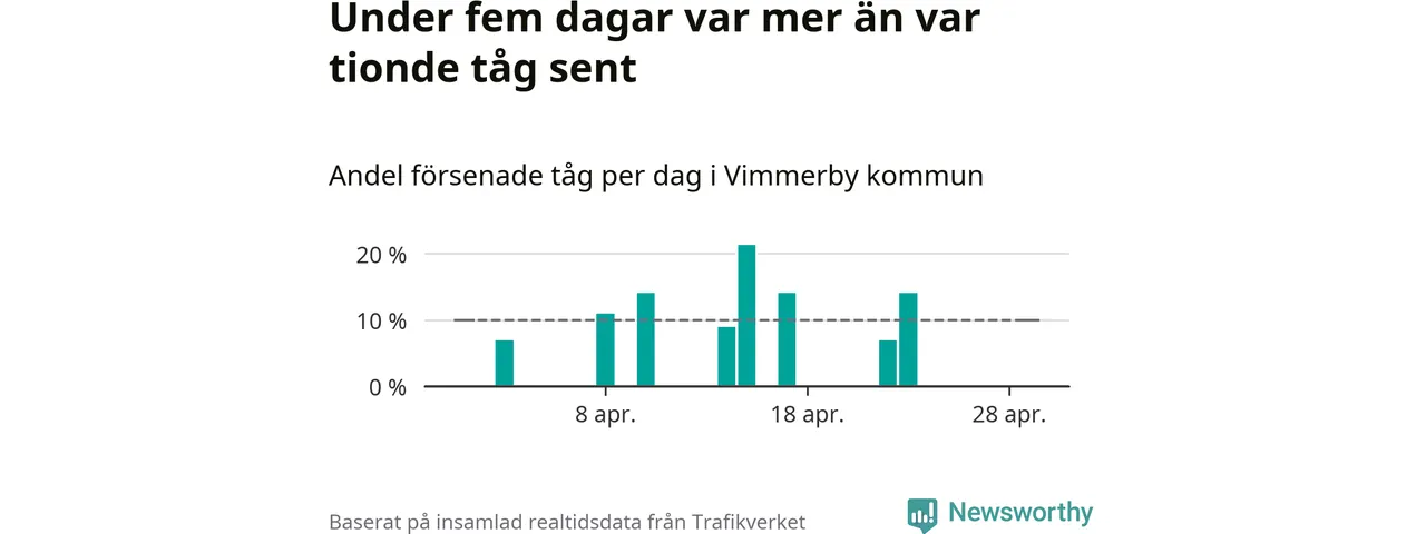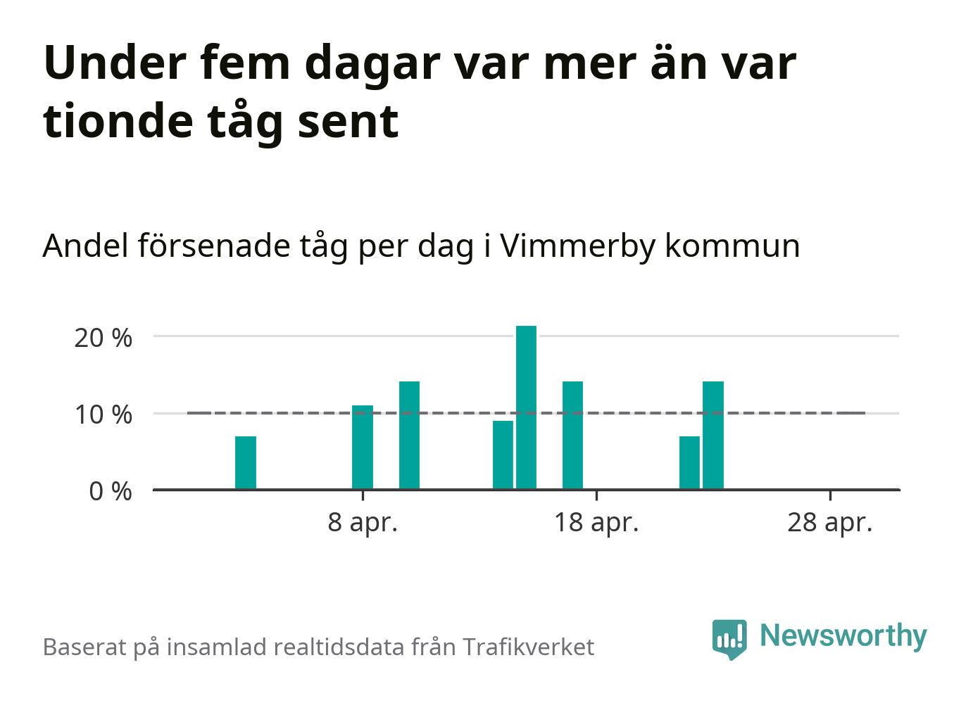 Så många som elva procent av tågen i Vimmerby kommun ställdes in under april. Det visar Newsworthys sammanställning av alla sena och inställda förra månaden.