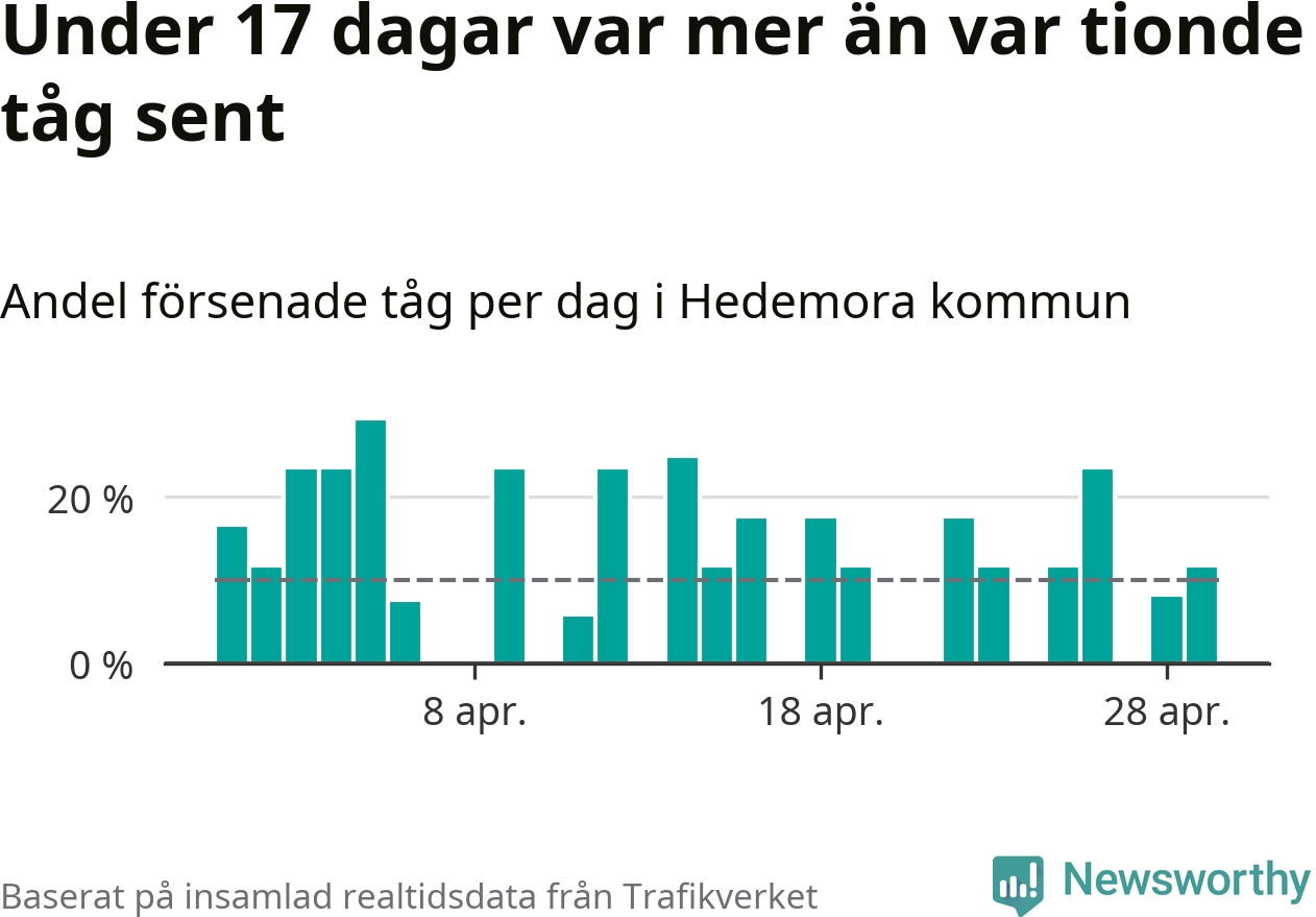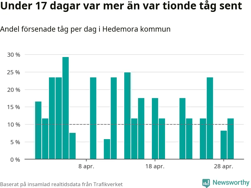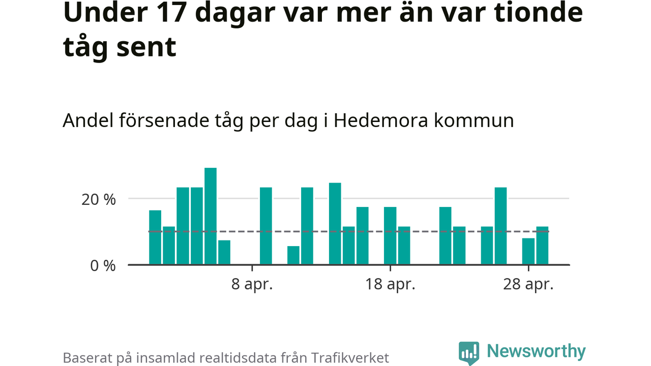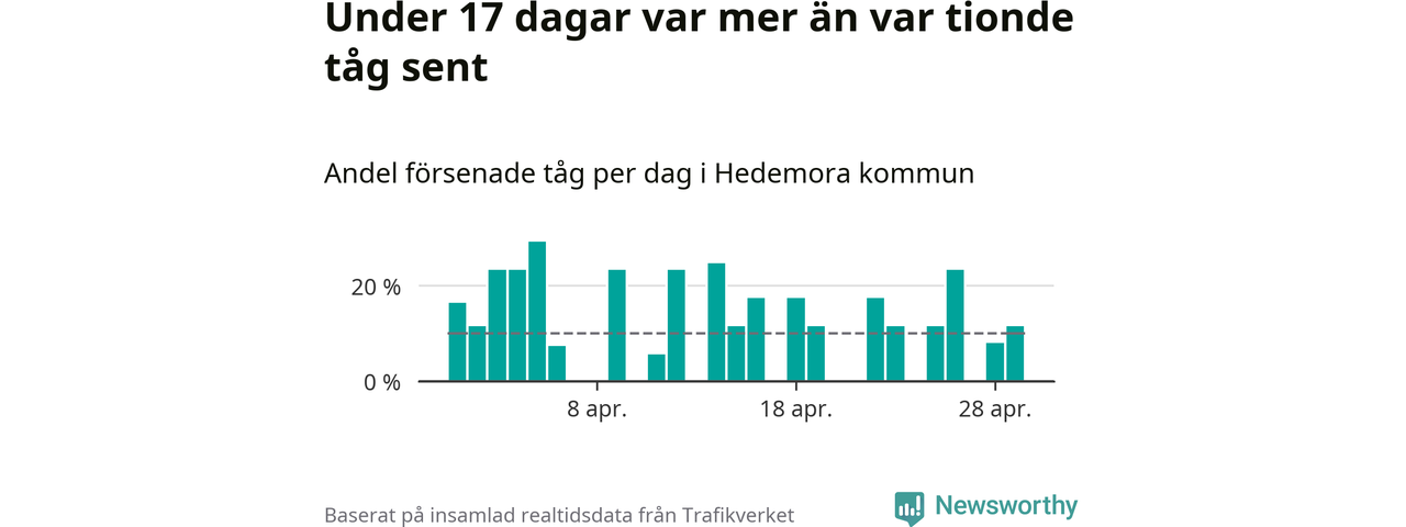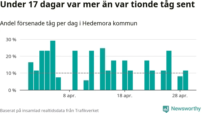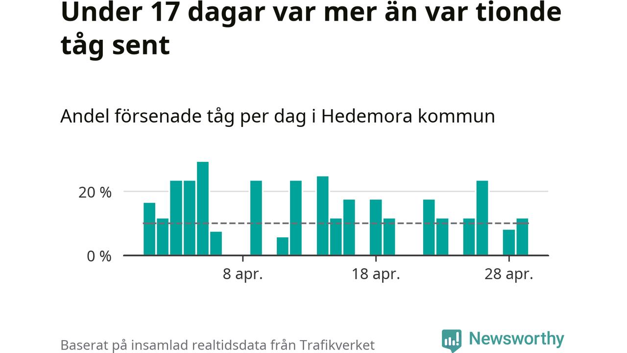 Under 17 av 30 dagar i april var mer än var tionde tåg vid Hedemora försenat. Det visar Newsworthys sammanställning av alla tågförseningar förra månaden.