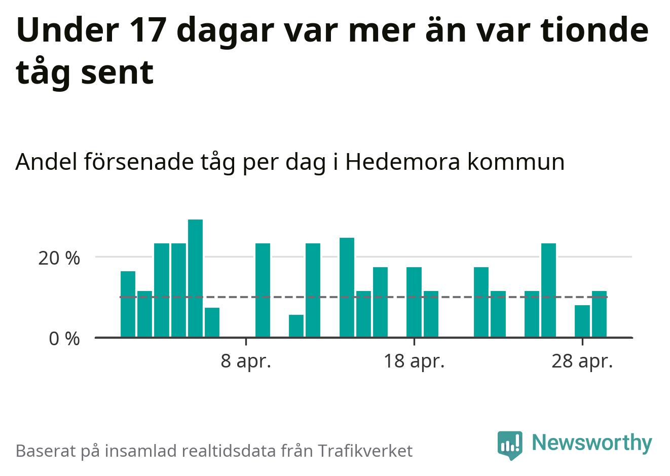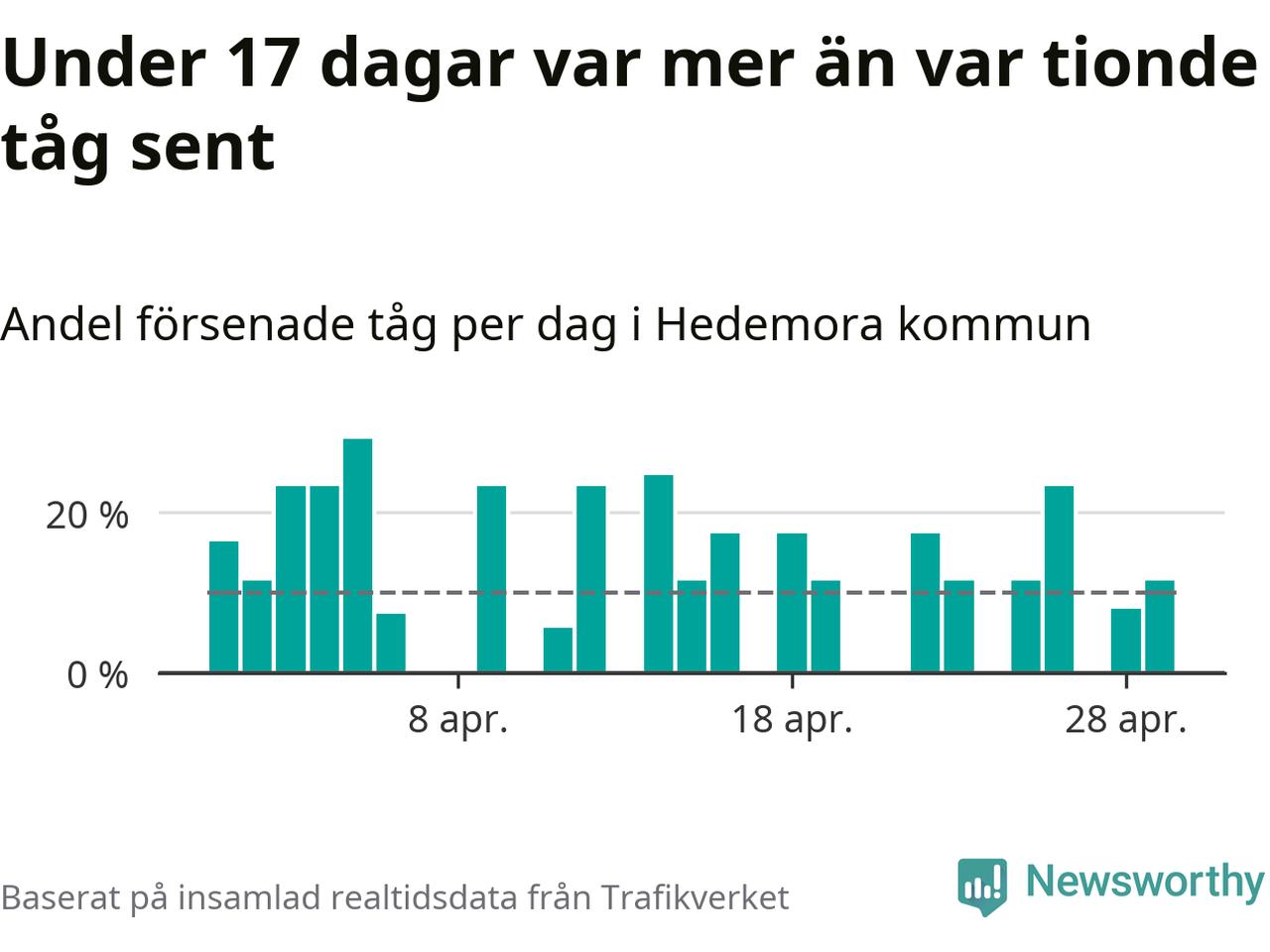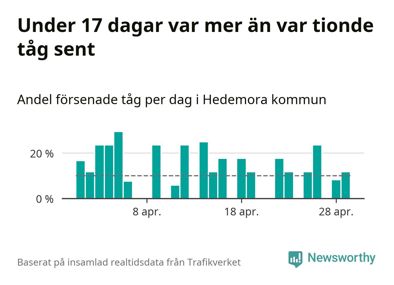 Under 17 av 30 dagar i april var mer än var tionde tåg vid Hedemora försenat. Det visar Newsworthys sammanställning av alla tågförseningar förra månaden.