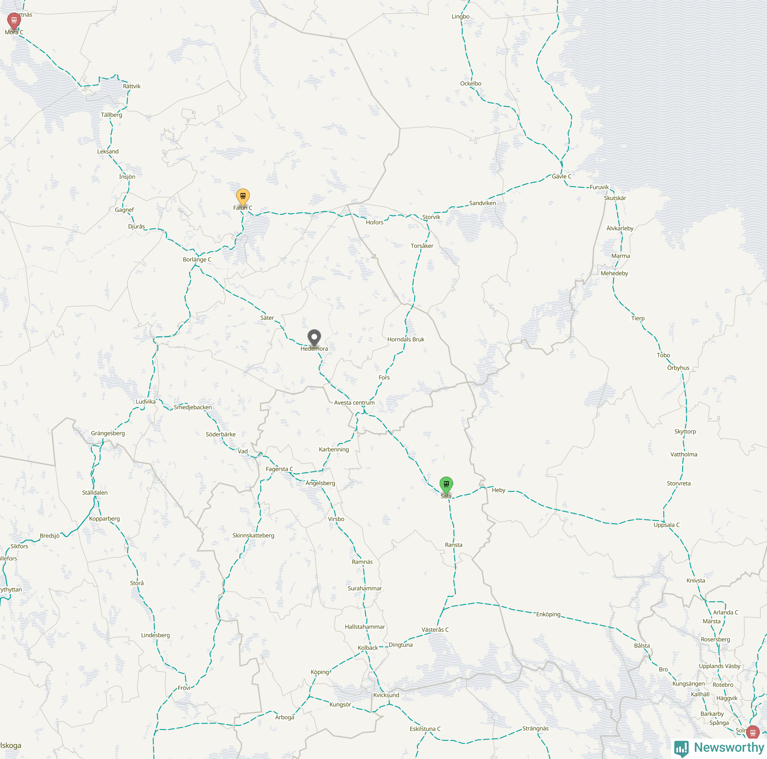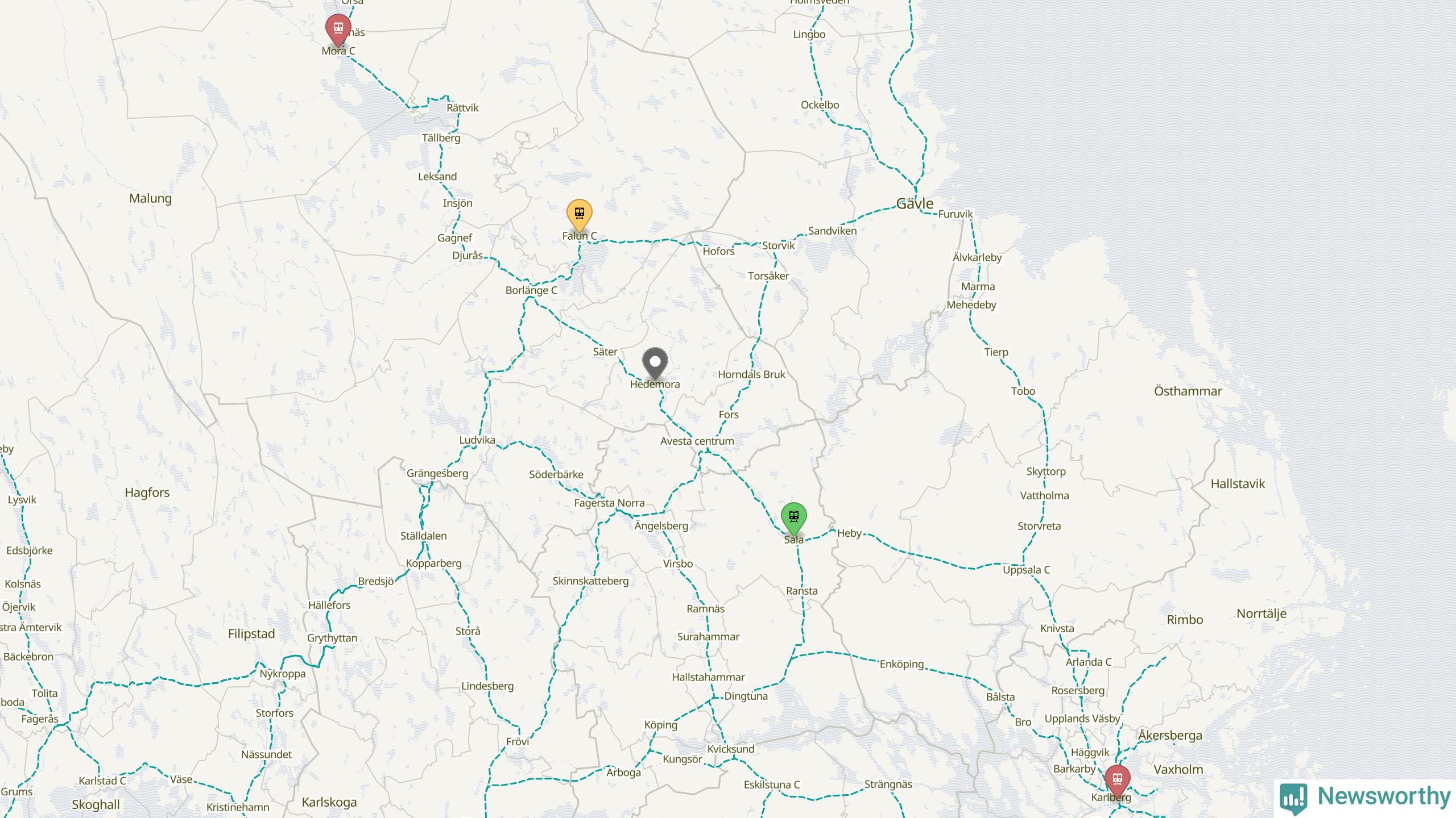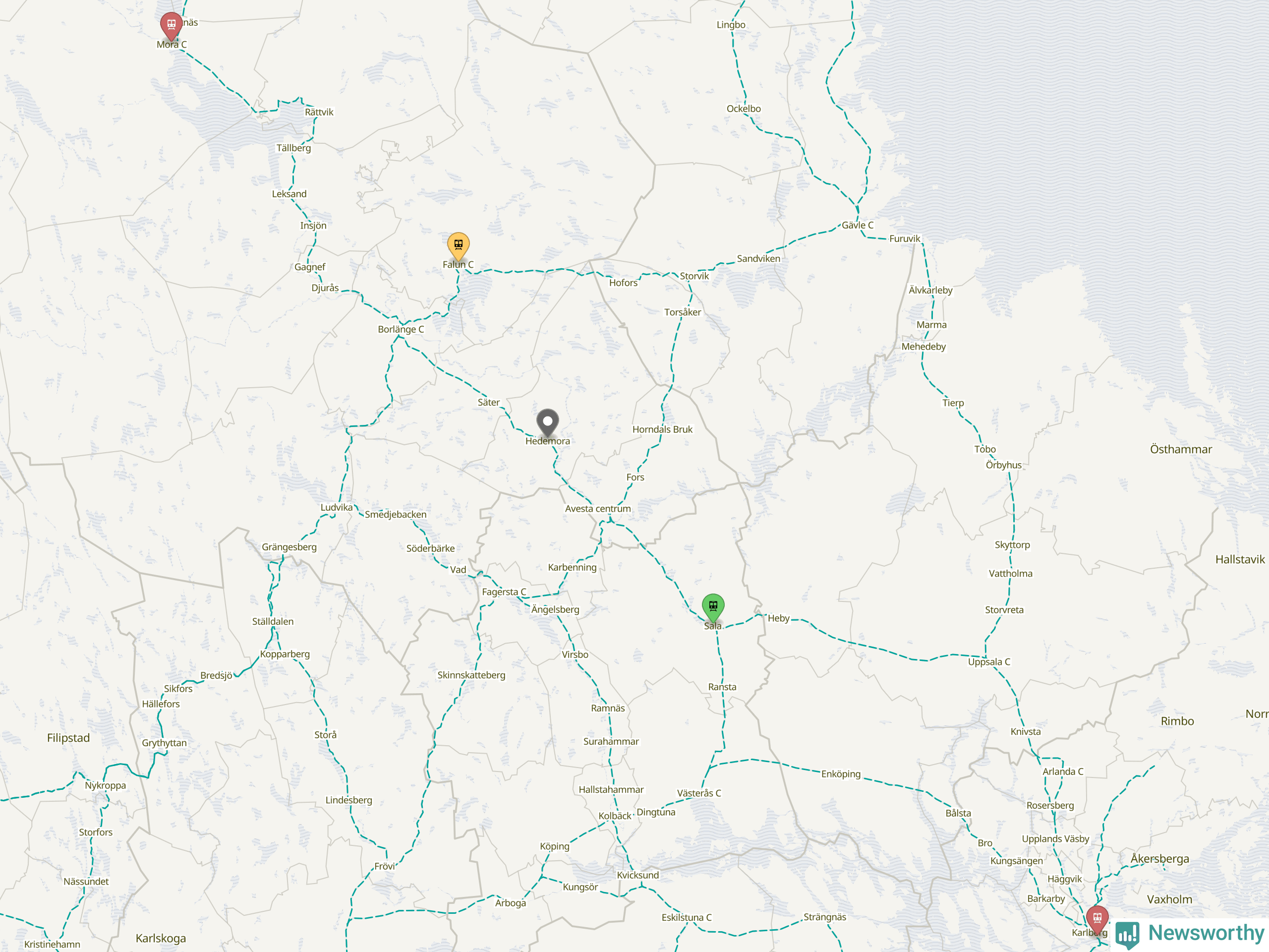 Kartdata från Mapbox, Newsworthy, OpenStreetMap och Trafikverket. Uppgifter om sträckor med passagerartrafik från jarnvag.net.